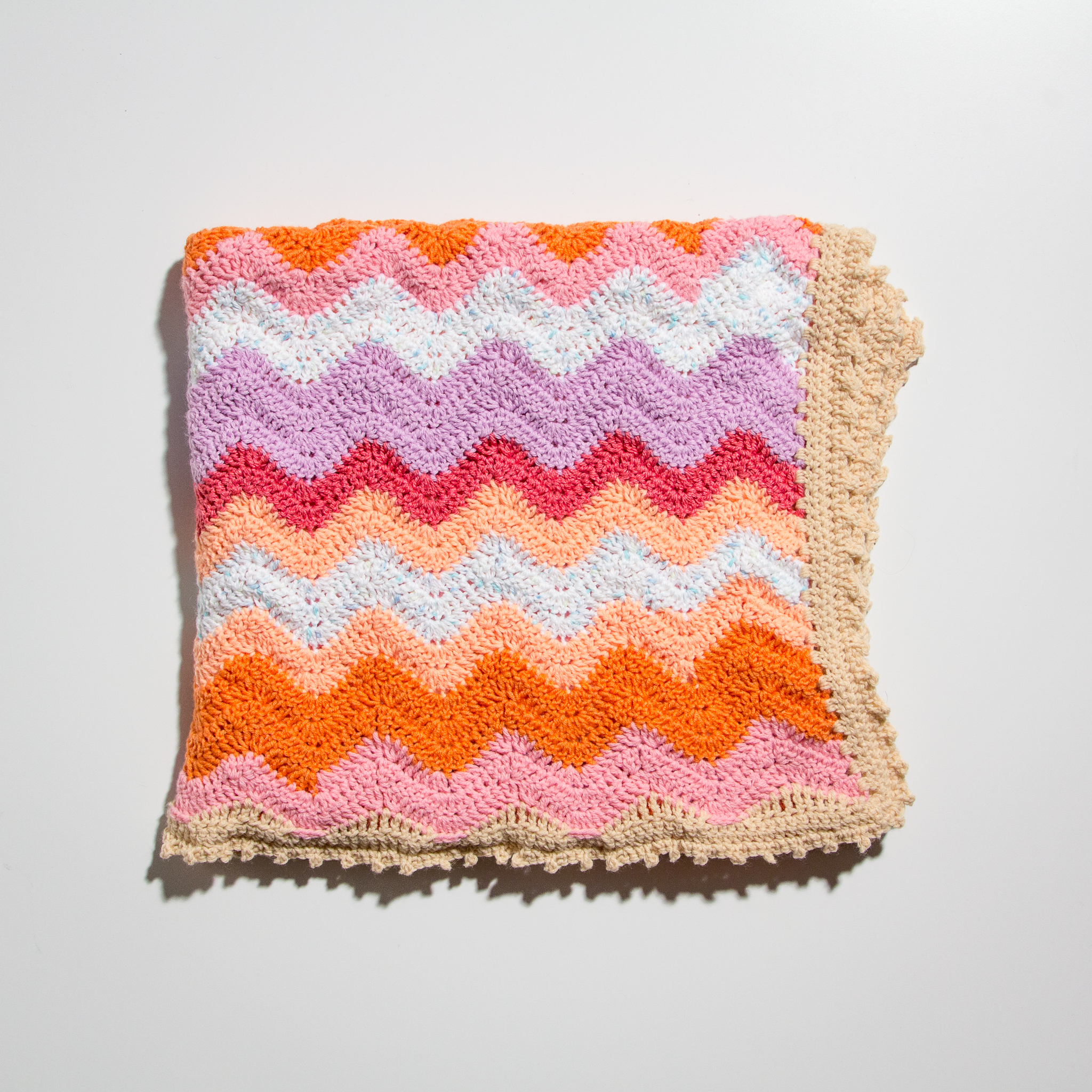 The yarn that makes up this blanket is leftover from a yarn project I did in 2013. Three structures and two trees were covered in crocheted yarn to make a public art installation. Once the exhibit was over, the pieces were washed and reconfigured into child-sized blankets. Those blankets along with many other crocheted blankets (40 in all!) were donated to a local children’s organization. I’m happy that this yarn can have another life in another fiber arts project.