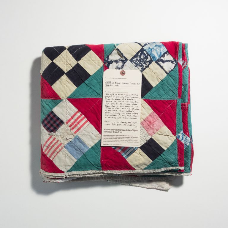 This quilt is being donated to this project in memory of our parents, Joan C. Blake and Robert T. Blake Sr. We do not know the full story of its origins, other than that it was made in the 1940s or 1950s and was stitched by members of our father’s family—likely his older sisters and mother. It may have been a wedding gift to our parents.