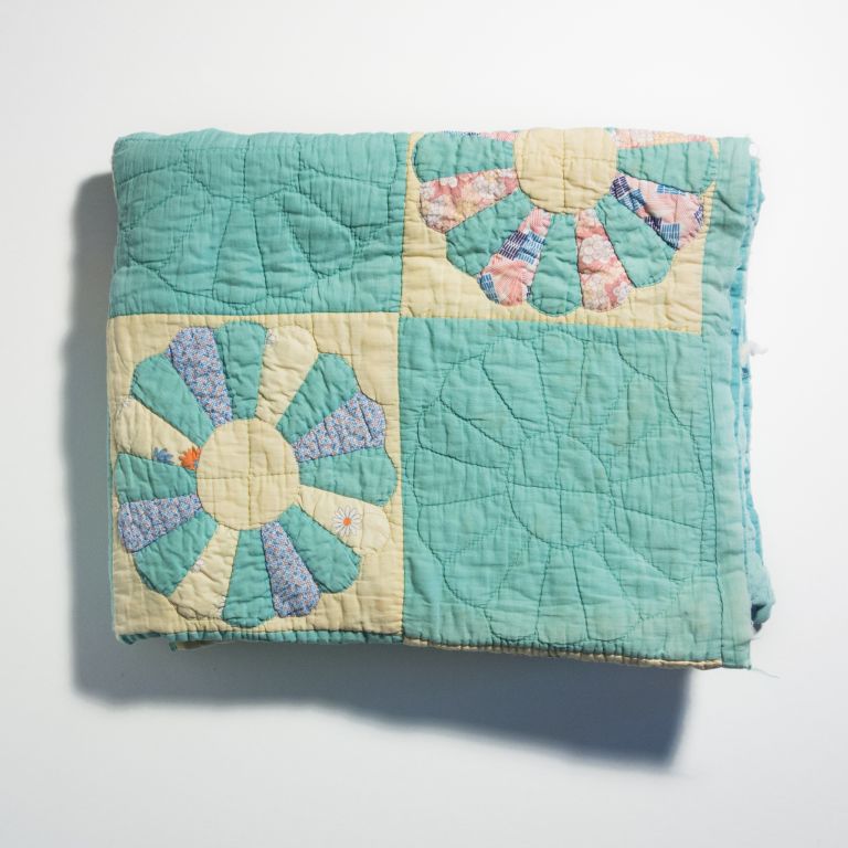 We are not sure who made this quilt which is hand-quilted, but the fabrics appear to be from the 1930s and/or 1940s.