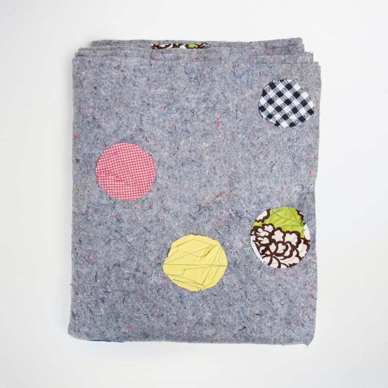 Each of the circles I sewed onto the U-Haul blanket comes from repurposed textiles—napkins, clothes, etc ... there is no pattern or reason why I have done this, except that I thought it was time the blanket had a happy burial in the blanket time capsule.