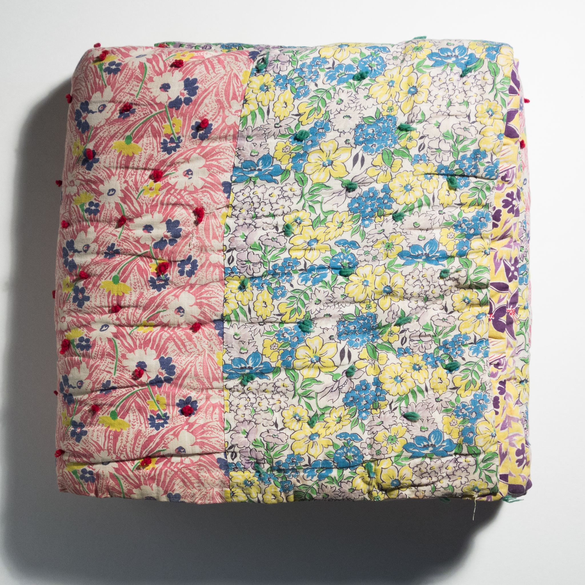 Tynne Heikkinen made these three quilts. She raised a few sheep on their farm, sheared them, and hand carded the wool for the inside of the quilts. The quilt coverings were made of scraps of material from shirts, dresses, curtains, and patterned flour sacks. The quilts were used by my family for many years.