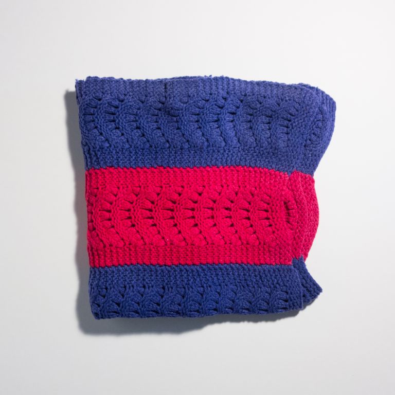 This blanket was crocheted by our mother, Joan C. Blake, sometimes in the late 1950s. We are donating it in her memory (she died 12/31/2007). Joan was an art lover and a co-founder of a crafts cooperative in Berkeley, CA where we grew up. She would be proud to know her work is contributing to a work of art by someone else!