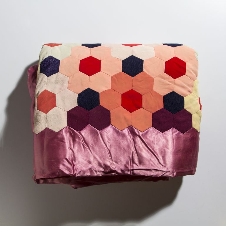 This blanket was made by my aunt toward the end of World War II. All Japanese were forced to leave the West Coast at the beginning of the war. Arrangements were made to send them all to internment camps located inland. You were only allowed to take what you could carry in a suitcase. There was an option to voluntarily leave the area if you left right away and could figure out a place to go. So my family leased a piece of land in Keetley, Utah and loaded up their cars and trucks with farm equipment and furniture and most importantly, sewing machines. So my aunt and mother sewed clothes and with scraps, my aunt made this blanket for one of my cousins.