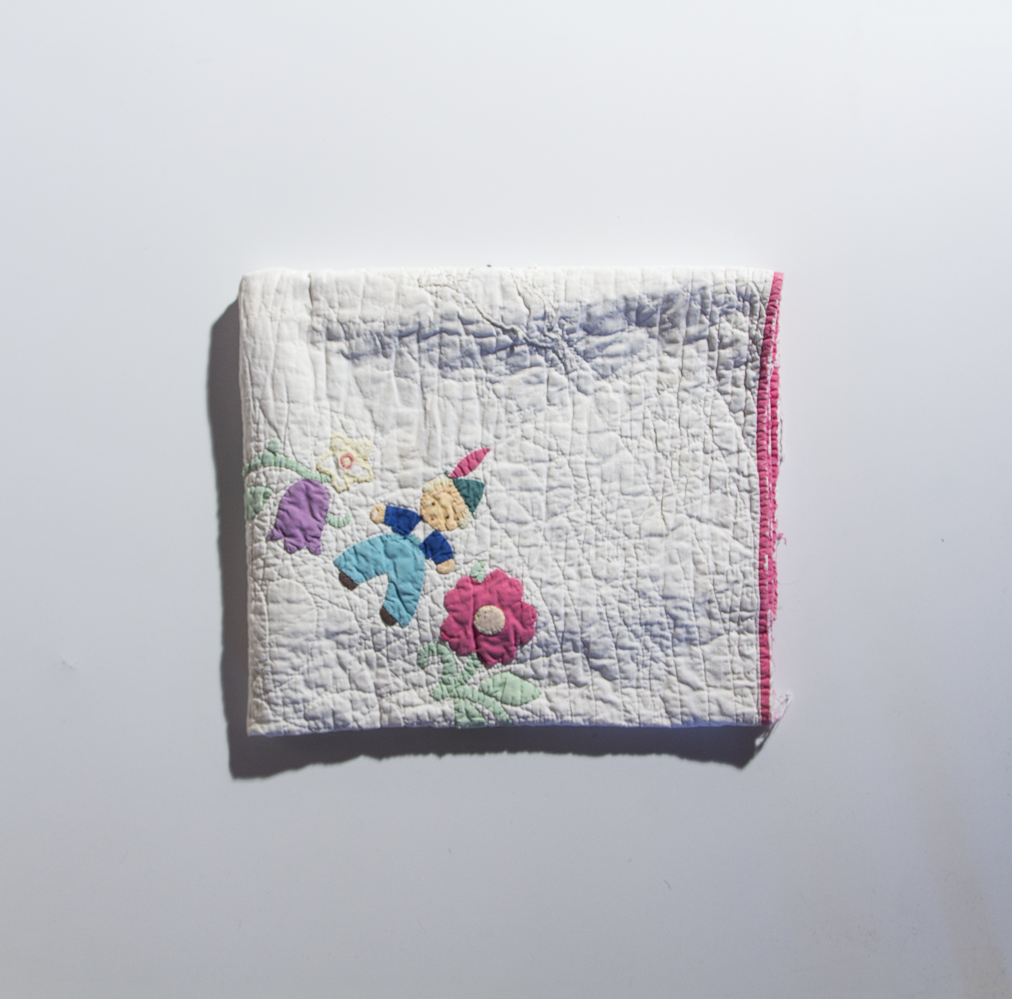 Jocelyn acquired this blanket from her great grandmother, Alice Tucker Biddle. It came with a doll with a wax head that was “spooky.” The blanket is probably from the 1920s or 30s.