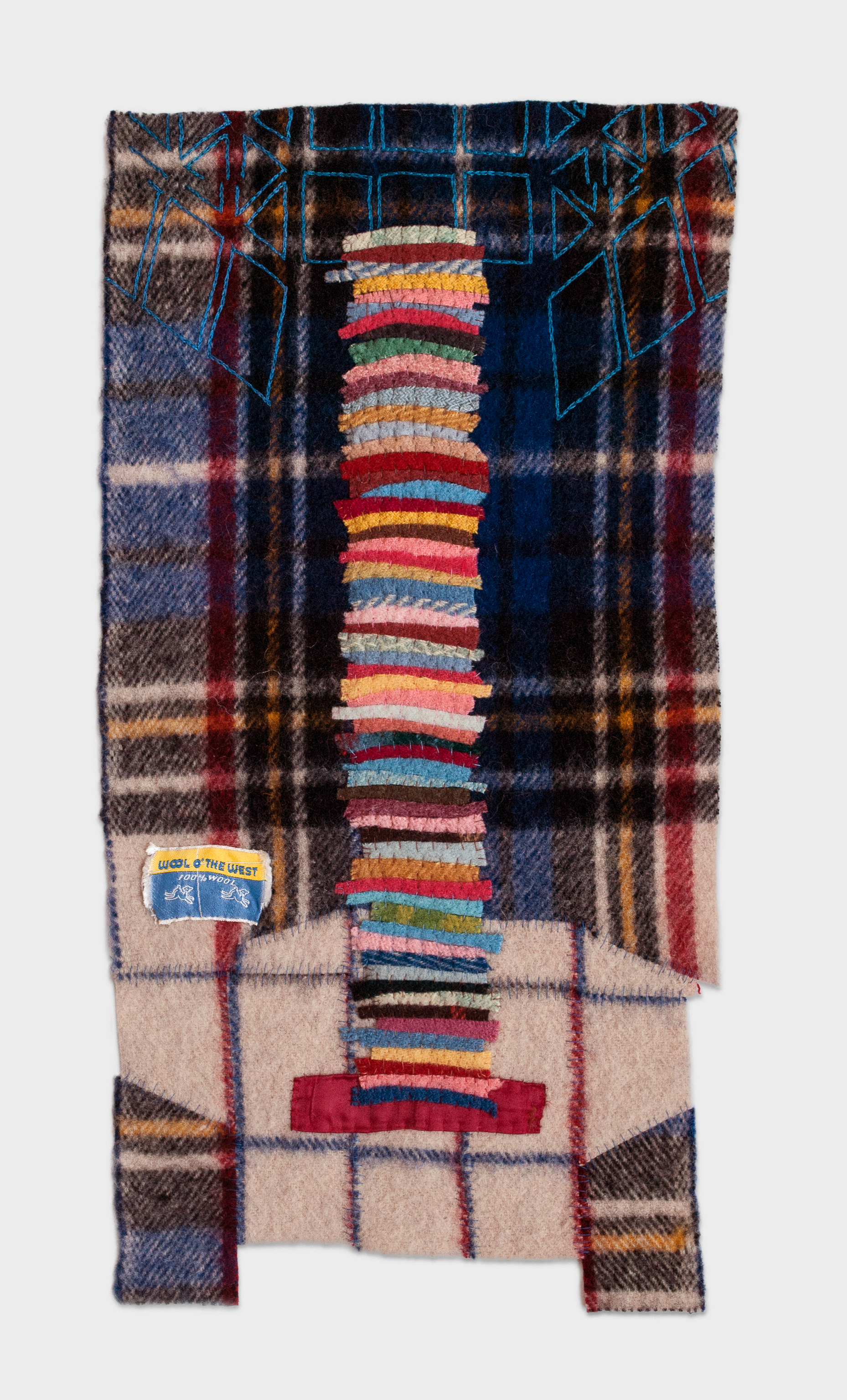 Reclaimed wool blankets, satin binding, thread, embroidery floss