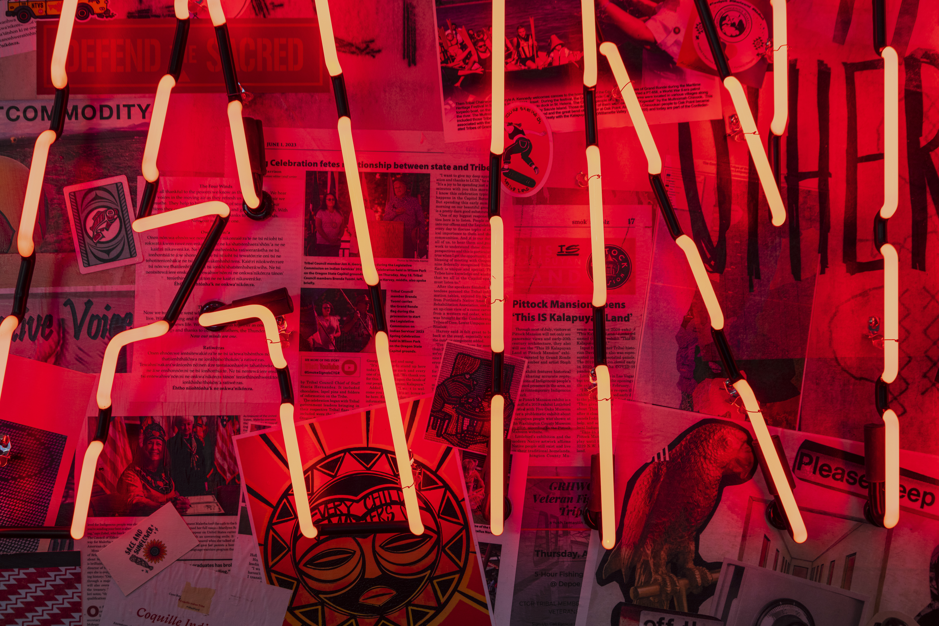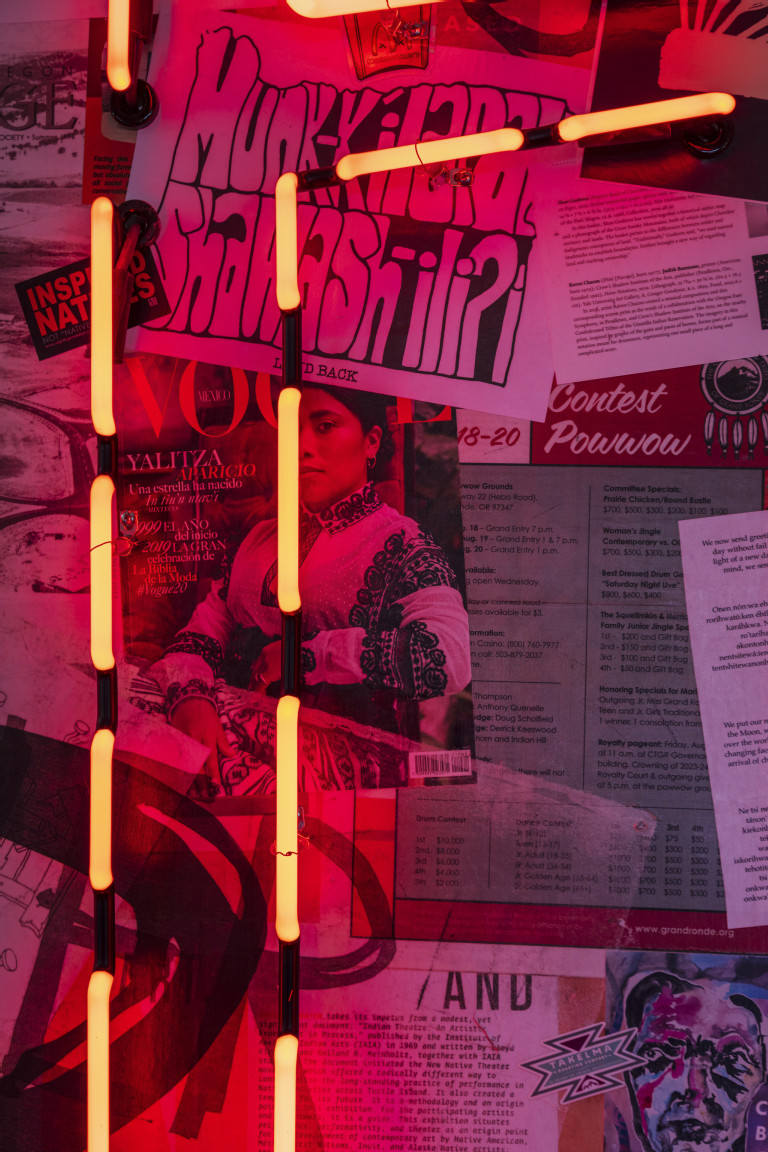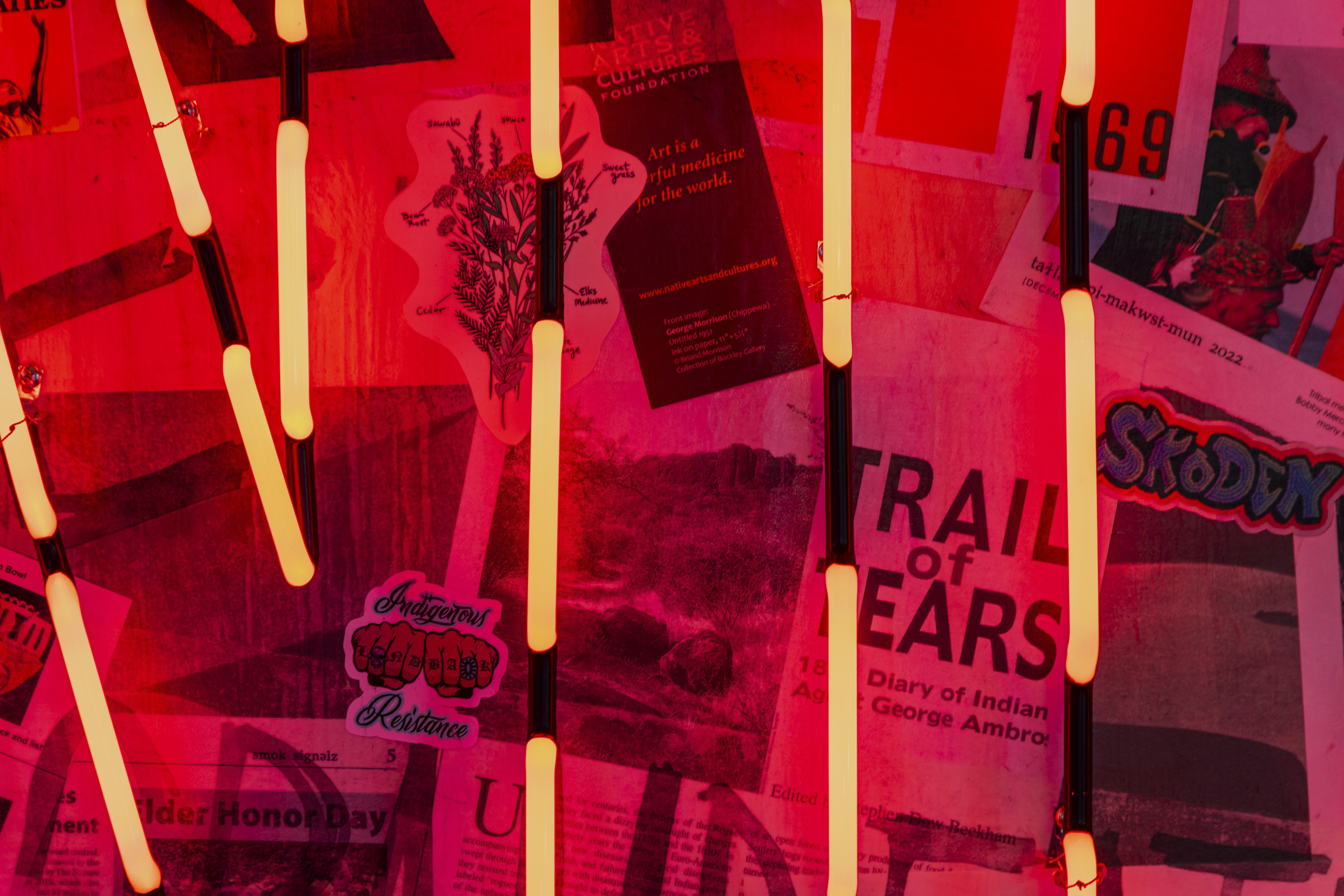 Chords to Other Chords (Relative) (2023), commissioned for the 2023 iteration of Converge 45, blazes like a sunrise in the landscape. This project is first and foremost an affirmation of the land and the Indigenous people who are ephemeral monuments to this territory. It is a way of seeing ourselves in public places that have ties to our ancestors and to future generations.