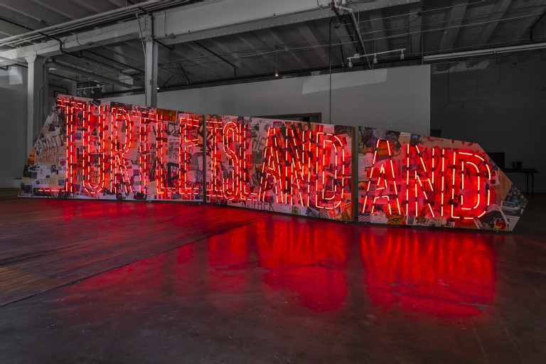 As Joy Harjo writes in her poem “Bird” (from How We Became Human: New and Selected Poems 1975–2001: “We are chords to/other chords to other chords, if we’re lucky, to melody.” For Watt, her monumental neon embodies “our relatedness, reverberating and expanding beyond the individual to empower and embrace the many. This work builds upon Seneca oral history traditions and the history of call and response. Conversations are intended to call back in time to our ancestors and also forward to future generations, based on the belief that our present moment is inextricably tethered to the communities of past and future.”