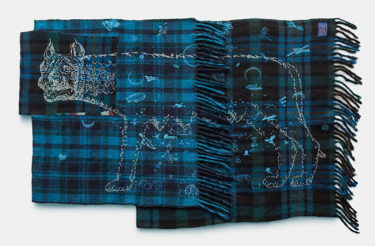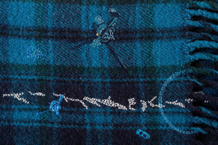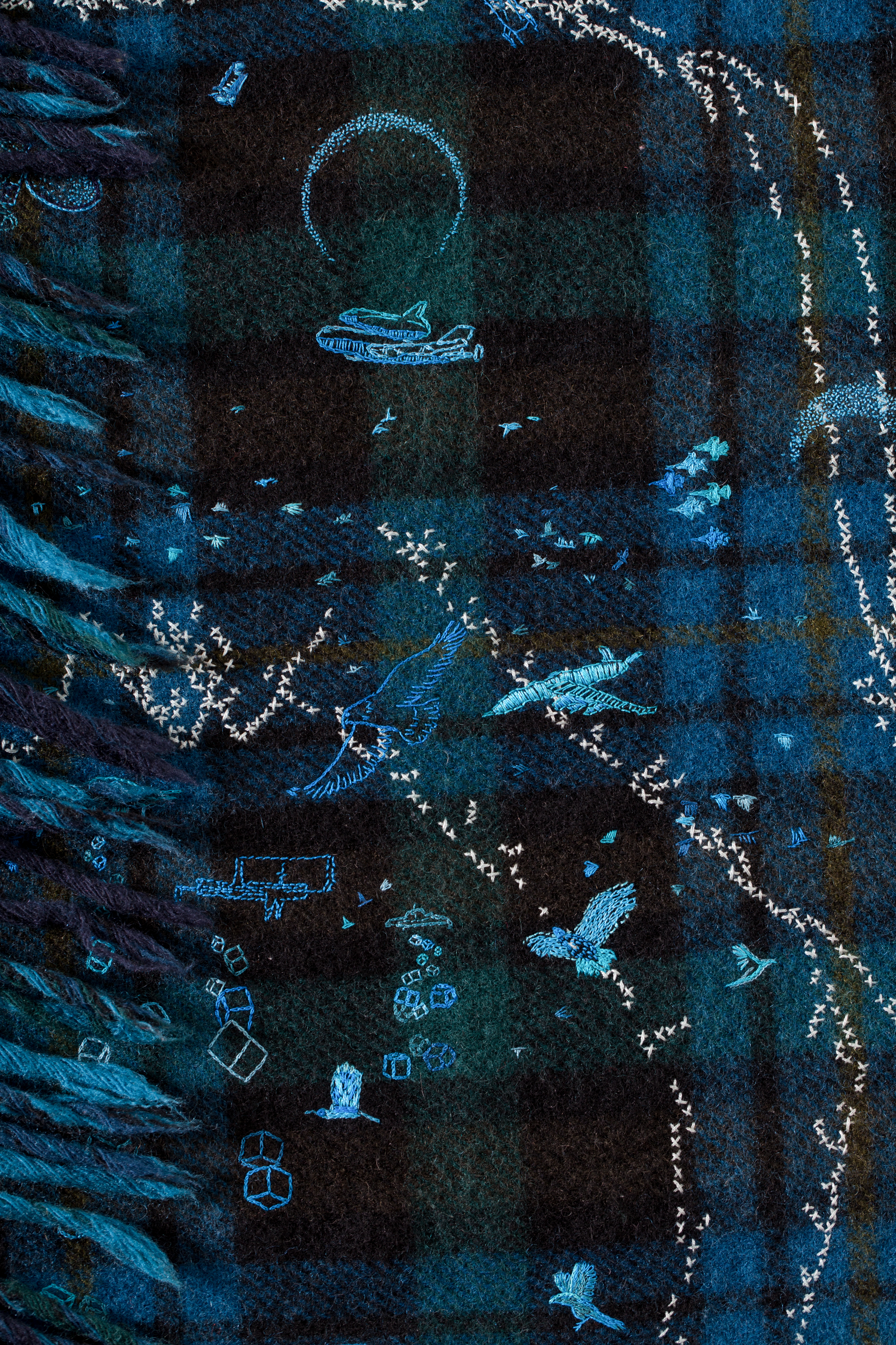Detail showing Voyager I spacecraft, with golden record embroidered in 24K gold thread