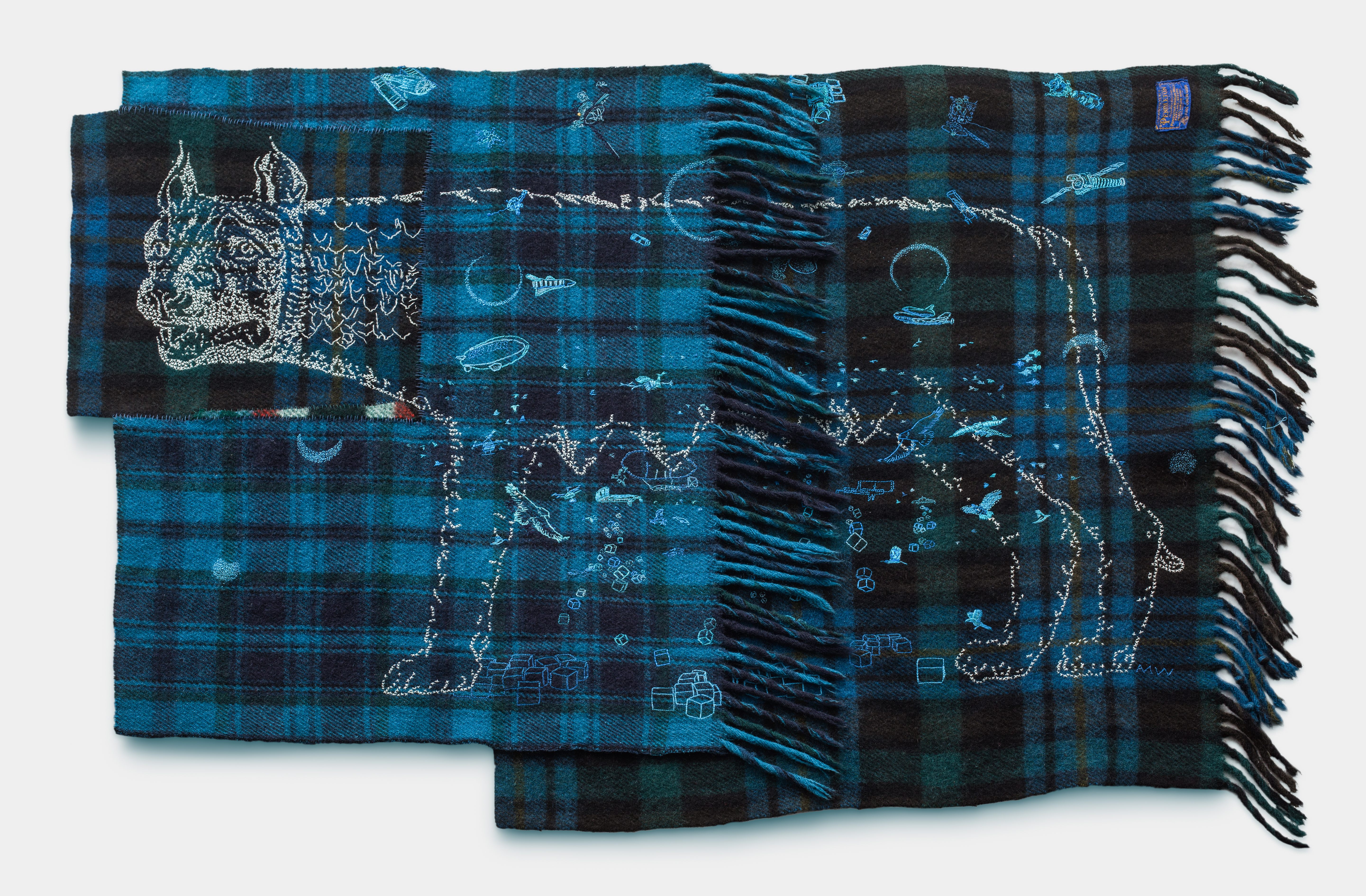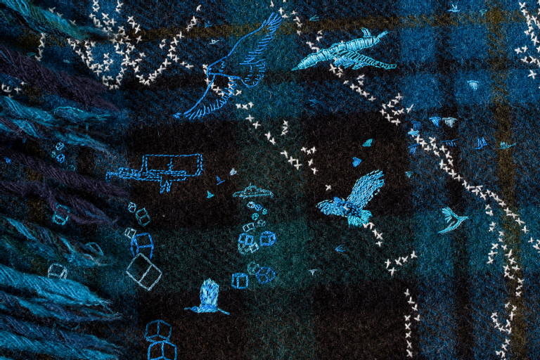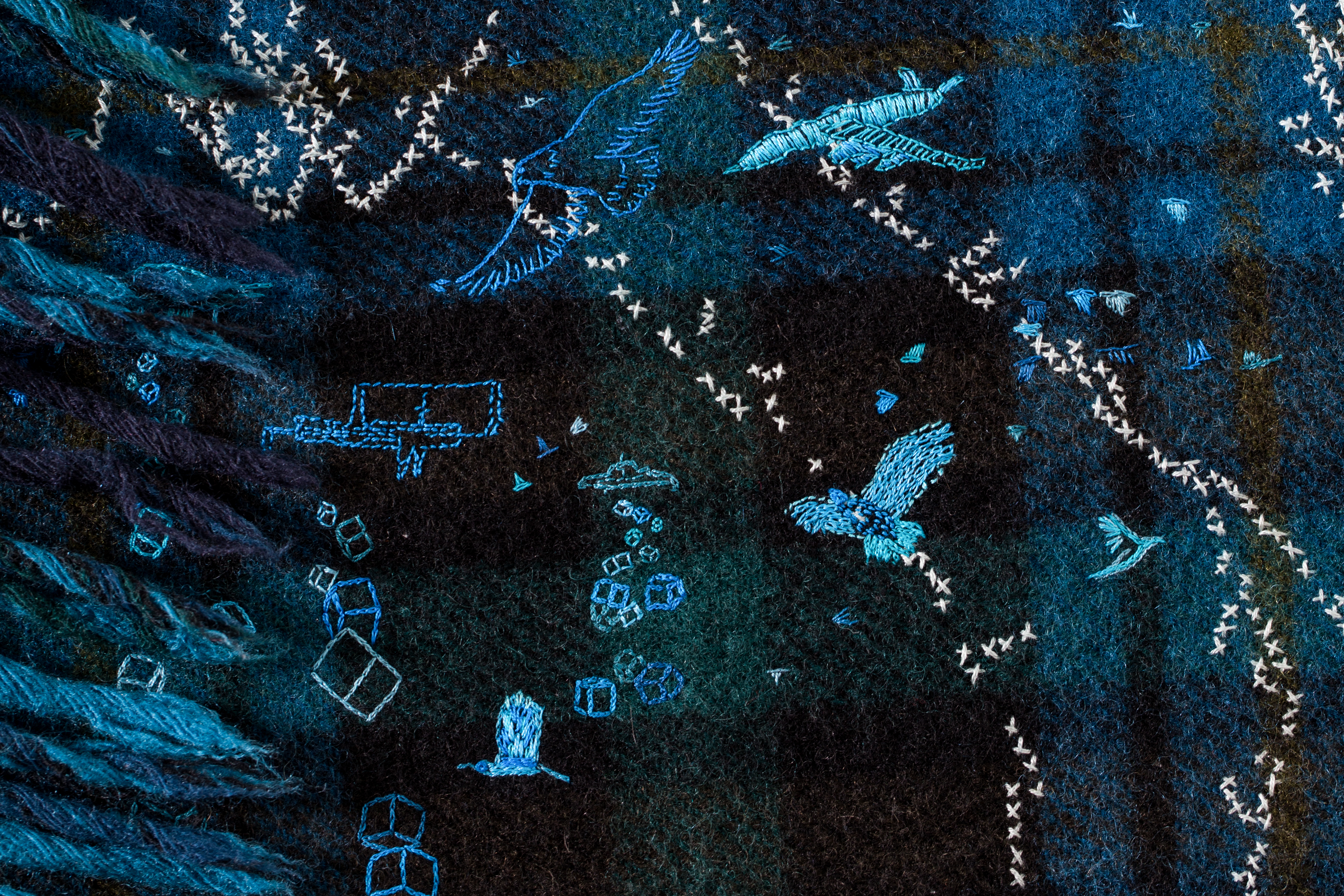 Reclaimed wool blanket, 24-karat gold-wrapped silk thread, embroidery floss, thread
