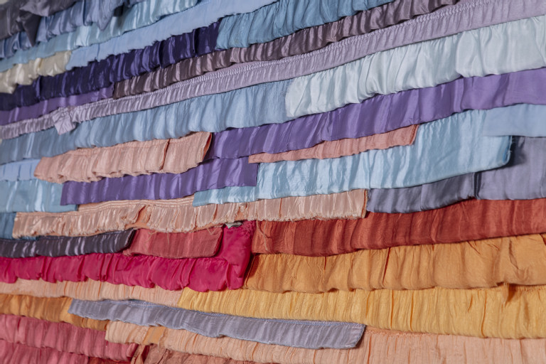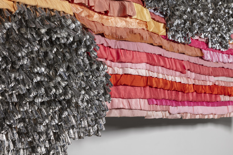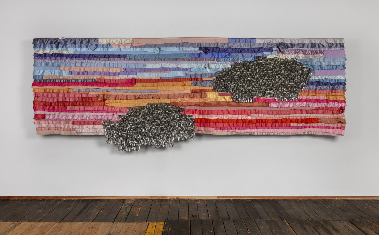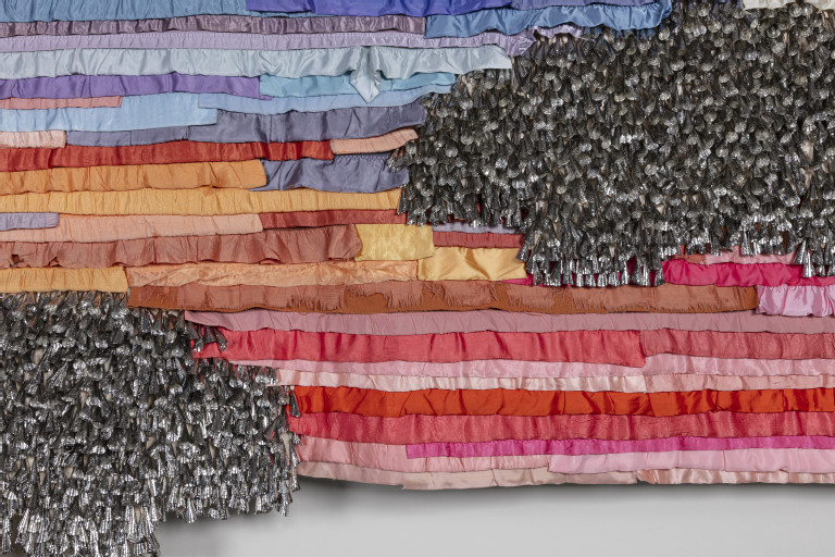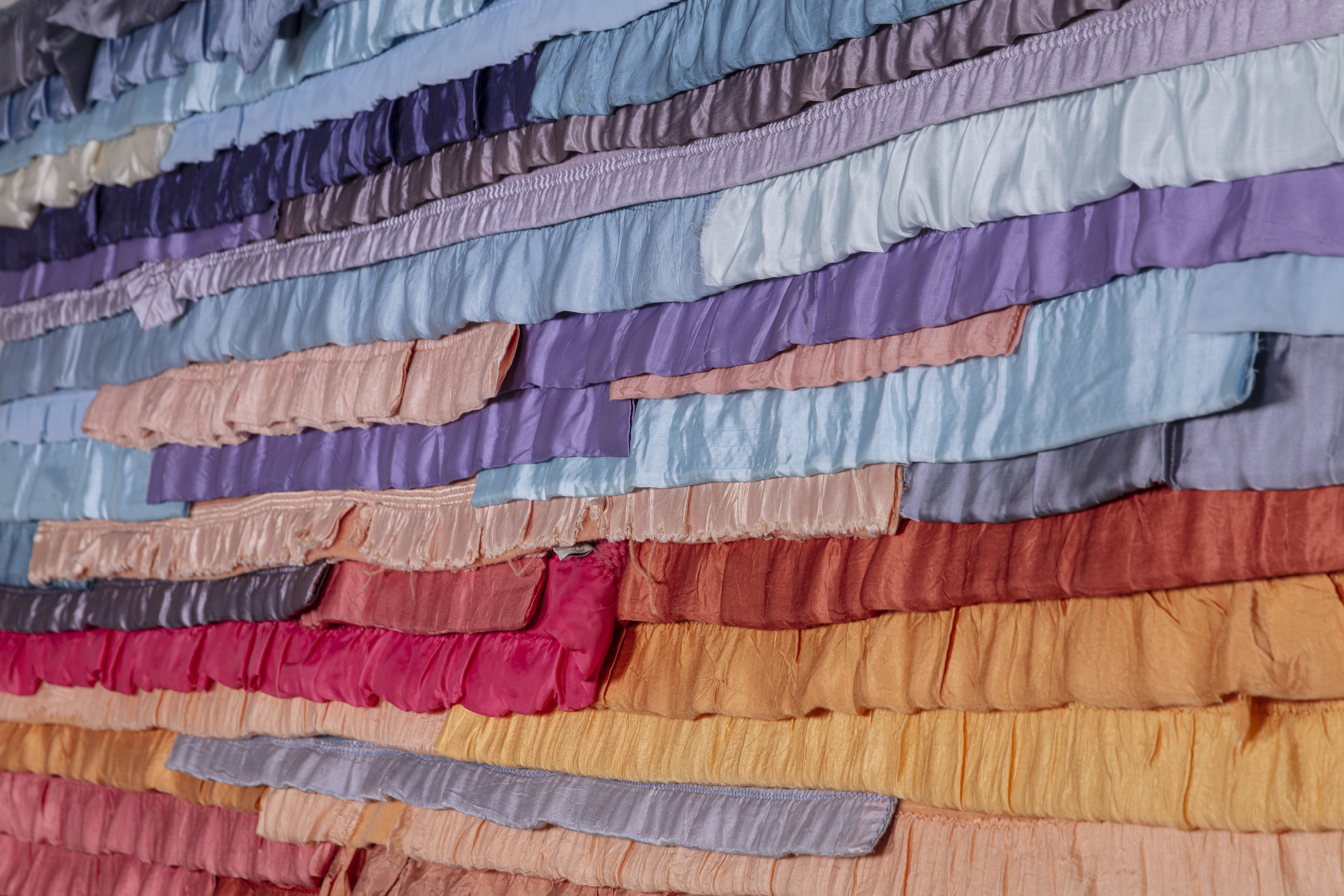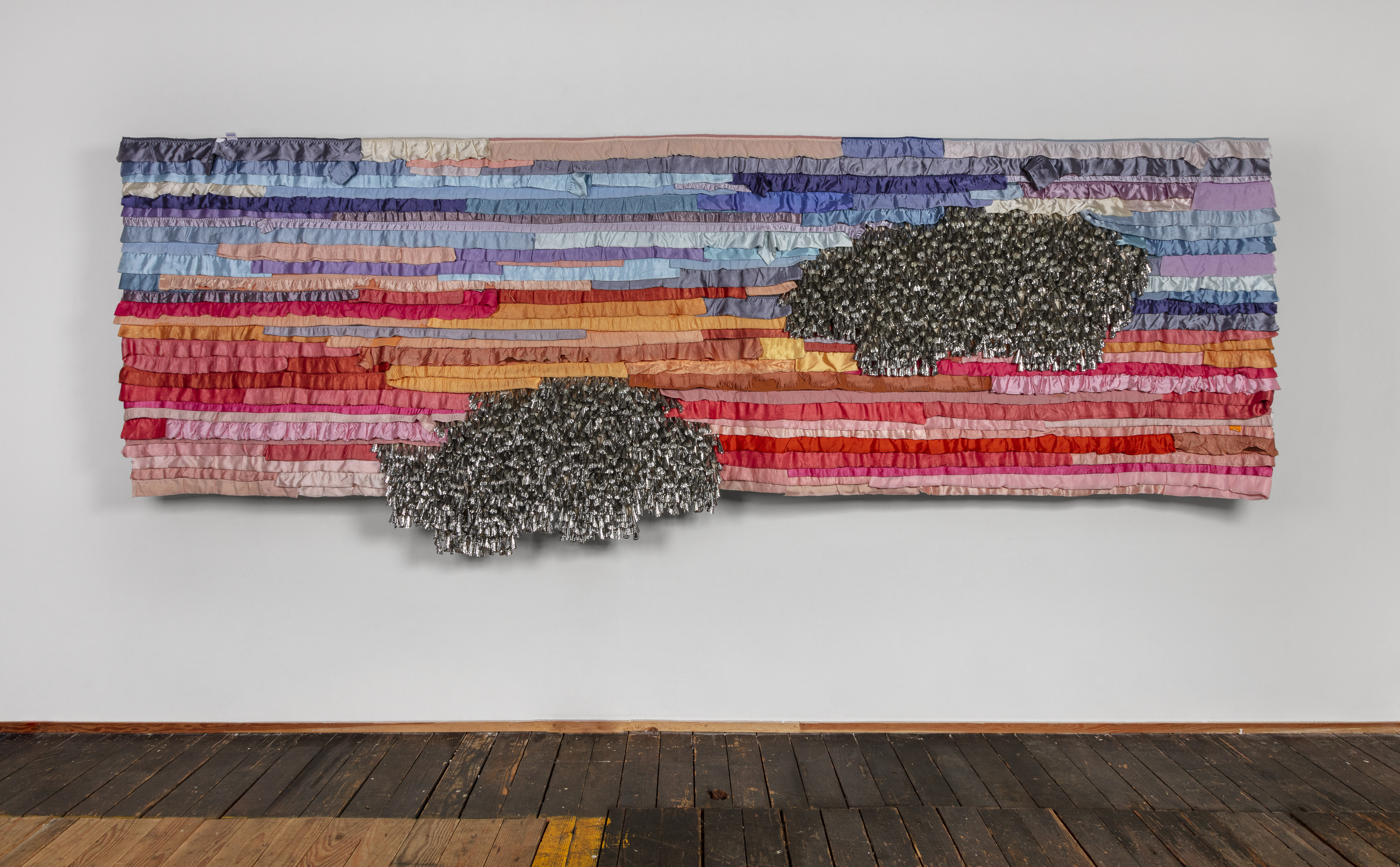 Reclaimed satin bindings, industrial felt, tin jingles, cotton twill tape, thread