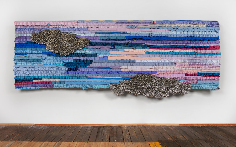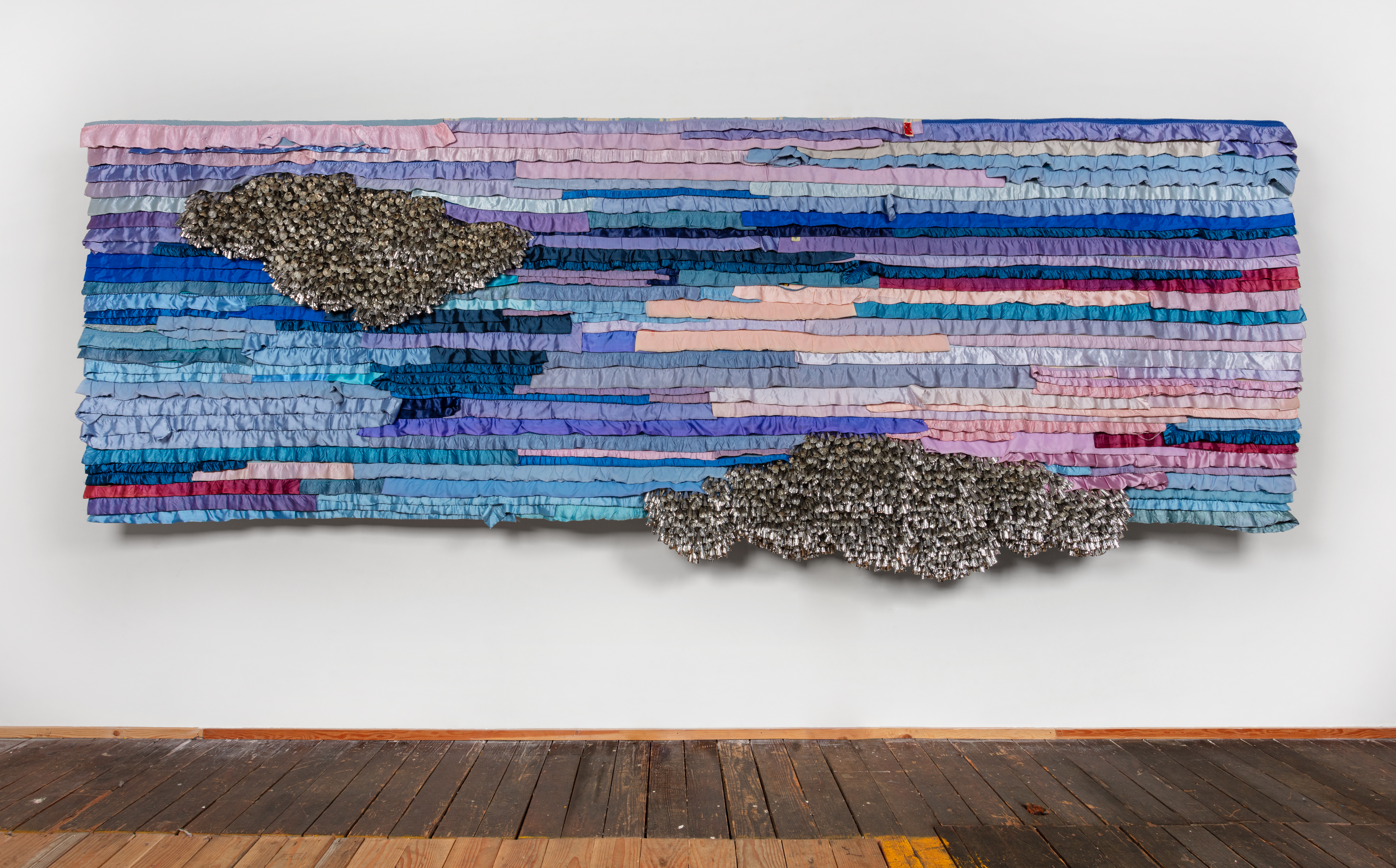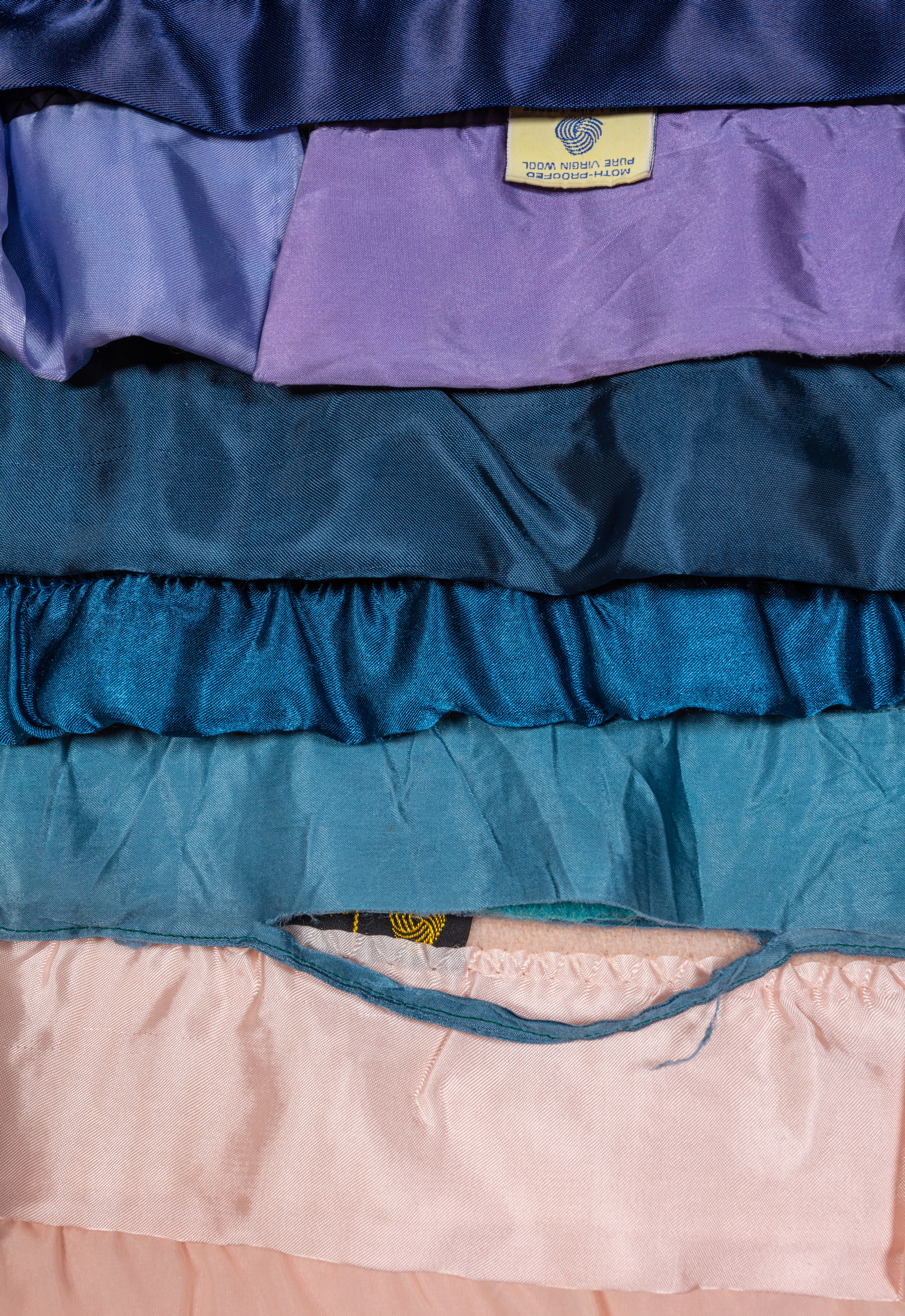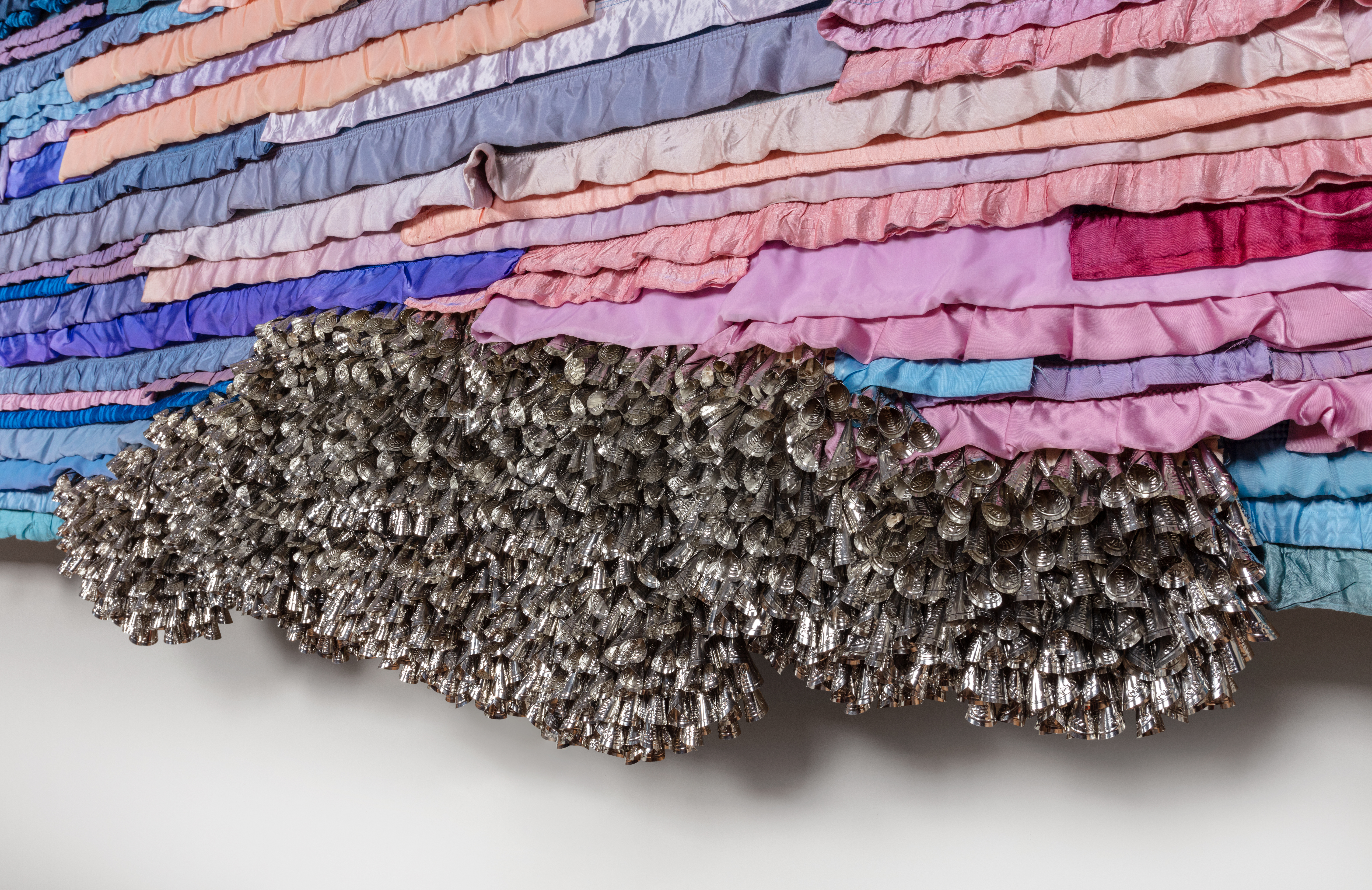 Reclaimed satin bindings, industrial felt, tin jingles, cotton twill tape, thread