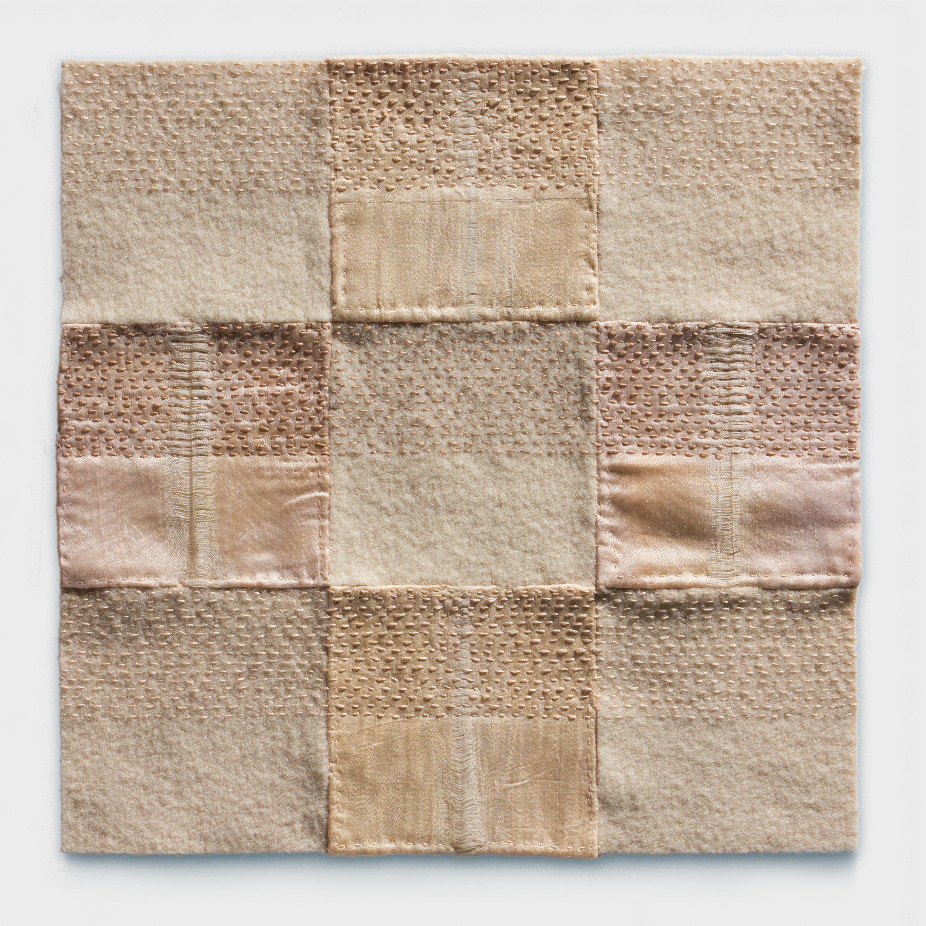 “Unlike other work I’ve done, these compositions are reconstructed from a shared singular piece of cloth, one wool blanket. I’ve enjoyed having this parameter or limitation. I’ve seen how this relates to a Seneca and Indigenous principle of using all of a material without waste. In our community corn is harvested, dried for seed, and [the land] rotated for future crops. The cob is used as the nose core for a corn husk mask and of course the husks are made into dolls, mats, and utilitarian objects. When I first started using corn in graduate school, I was really interested in this relationship between corn husks, their cellular structure, and the relationship between part and whole. So in many ways this again feels like I’m returning to a theme.”