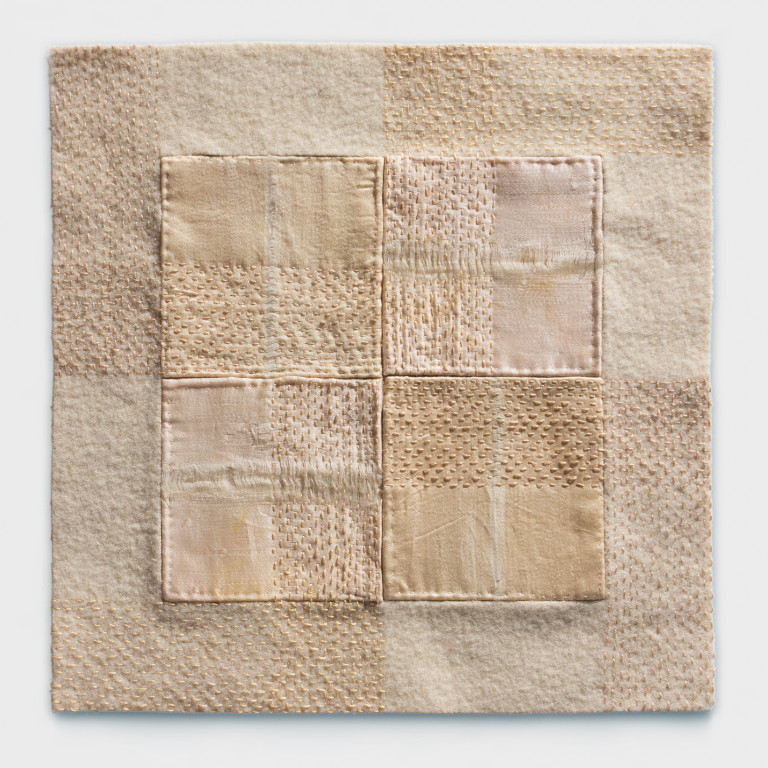 “Unlike other work I’ve done, these compositions are reconstructed from a shared singular piece of cloth, one wool blanket. I’ve enjoyed having this parameter or limitation. I’ve seen how this relates to a Seneca and Indigenous principle of using all of a material without waste. In our community corn is harvested, dried for seed, and [the land] rotated for future crops. The cob is used as the nose core for a corn husk mask and of course the husks are made into dolls, mats, and utilitarian objects. When I first started using corn in graduate school, I was really interested in this relationship between corn husks, their cellular structure, and the relationship between part and whole. So in many ways this again feels like I’m returning to a theme.”