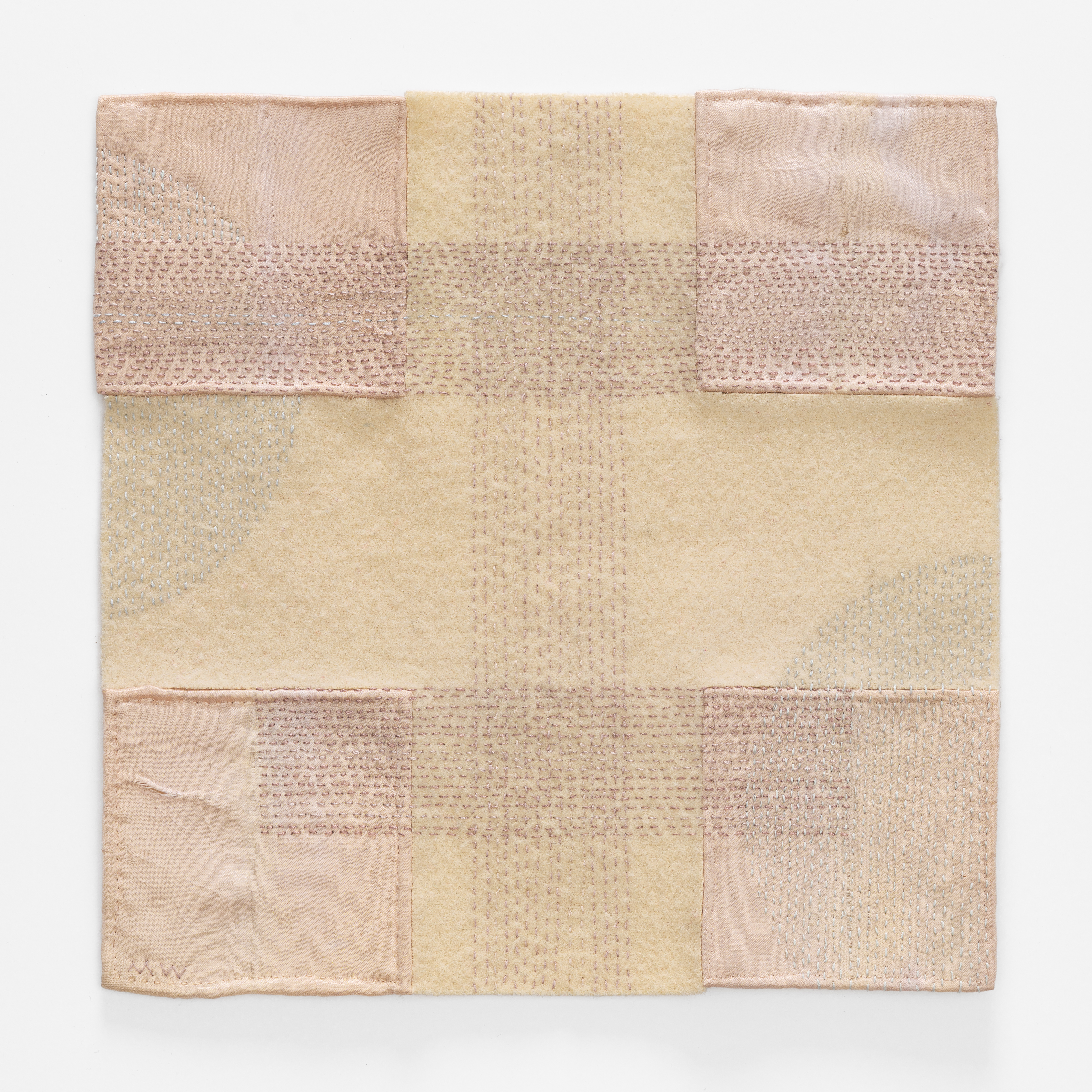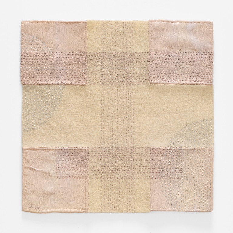 Reclaimed wool, satin bindings, thread, embroidery floss
