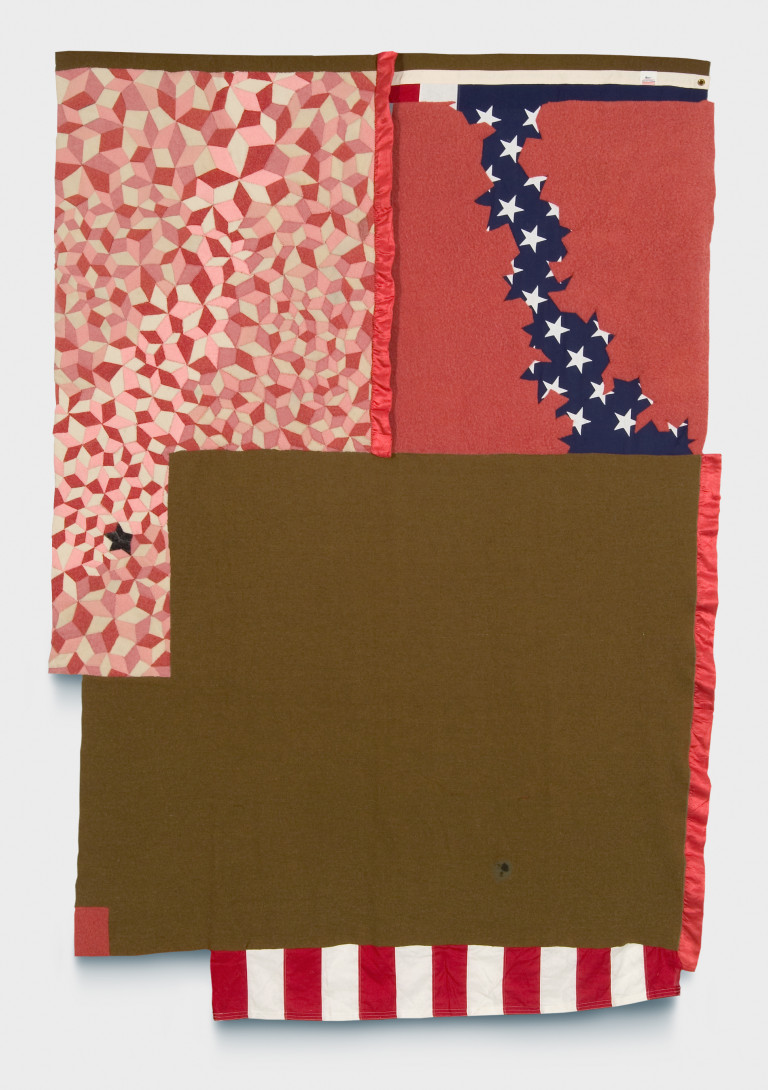 U.S. Army funeral flag, reclaimed wool blankets, satin bindings, thread