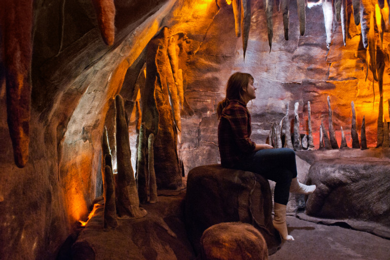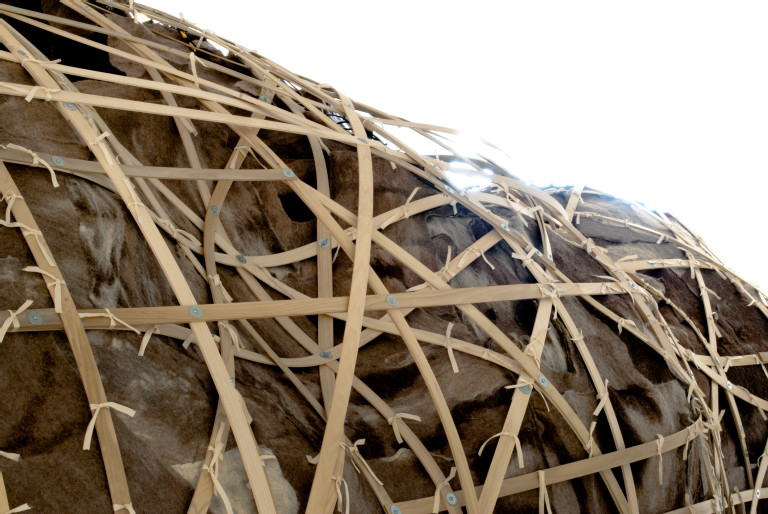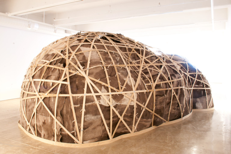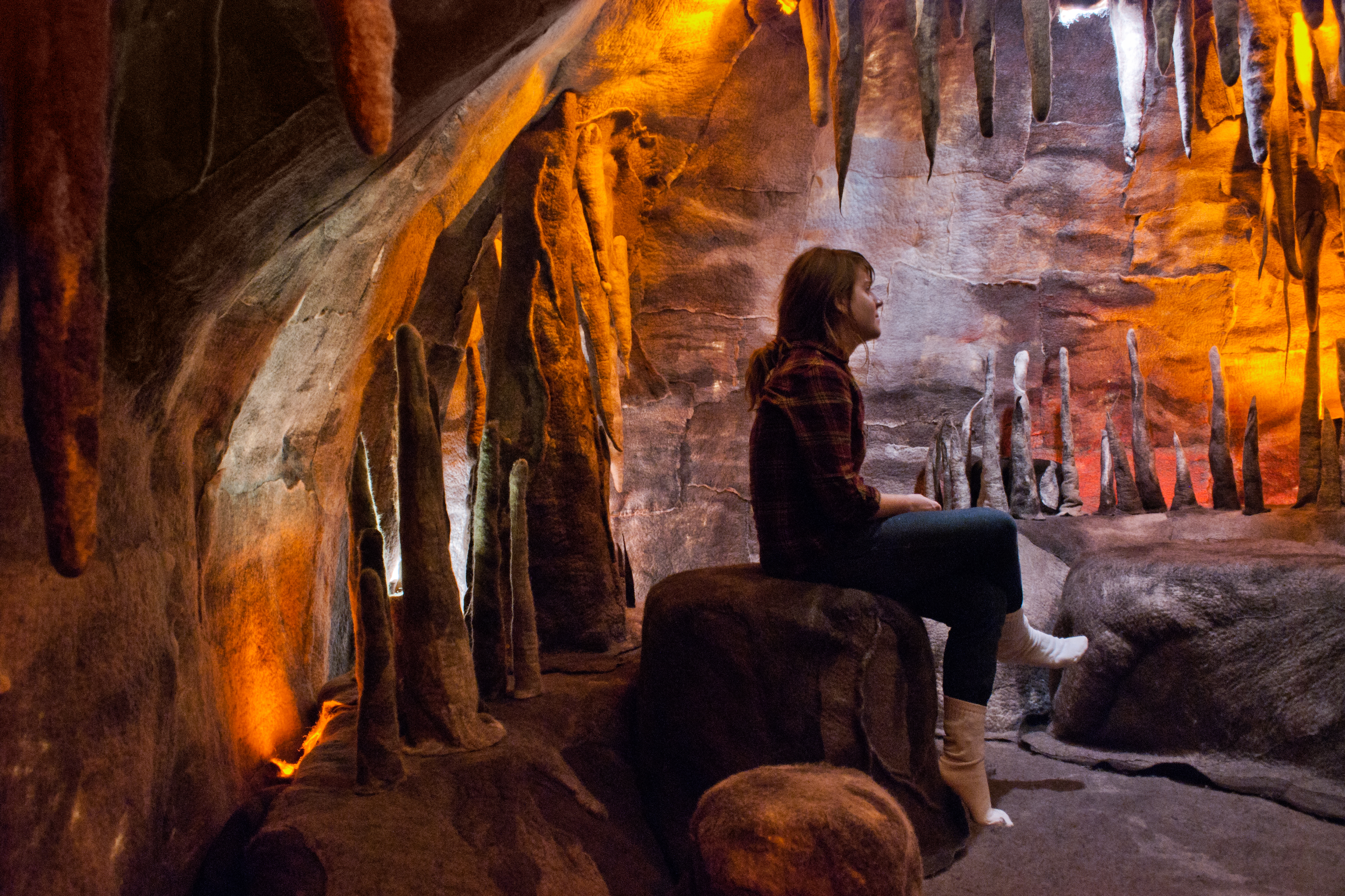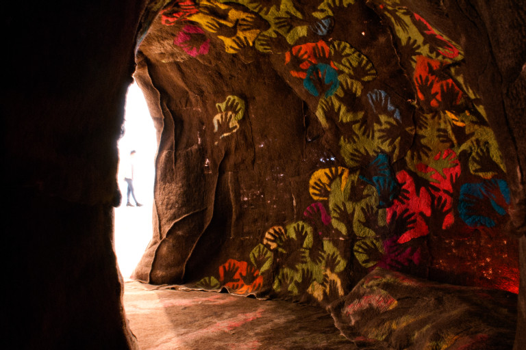 Engine uses one of the oldest fibers known to man (felted wool) to create a cave-like structure, with two chambers: Petroglyph Hall (with hand prints of those who contributed to the making of the project) and the Engine Core, which is complete with stalactites, stalagmites, and integrated seating. In this space, a cycle of Indigenous storytellers appear in the form of a projected hologram on various areas of the cave wall. I am interested in how the teachings in the stories I’ve included address the forces of good and evil in the world and the role of humans and community in this web of life.