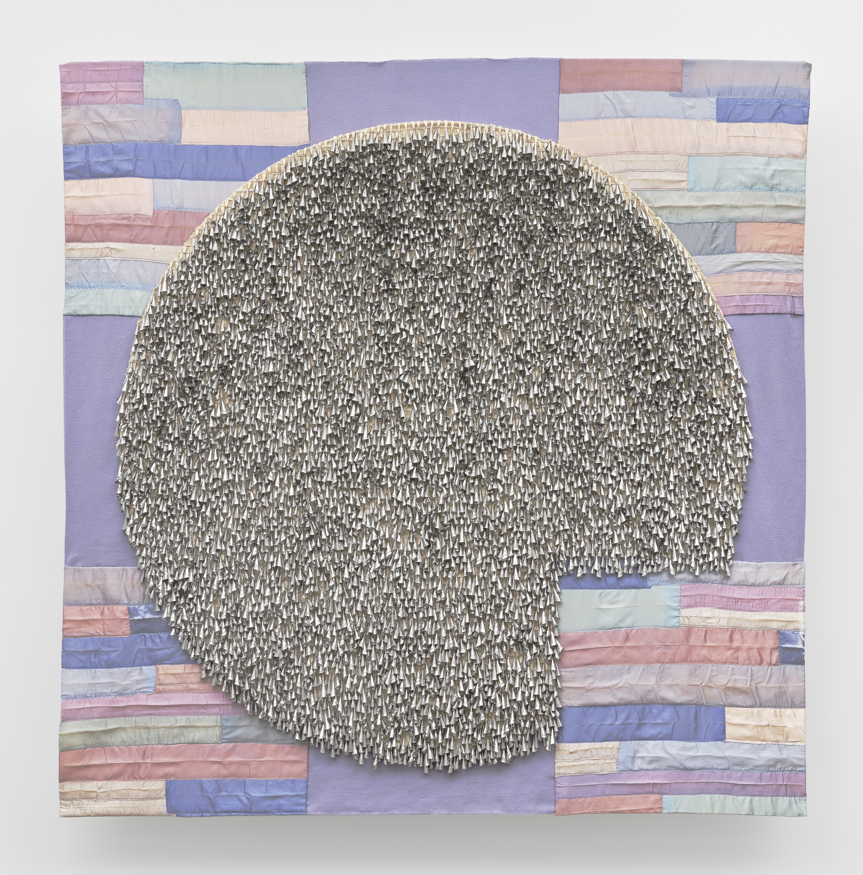 Reclaimed satin bindings, reclaimed wool blankets, canvas, jingles, twill tape, thread