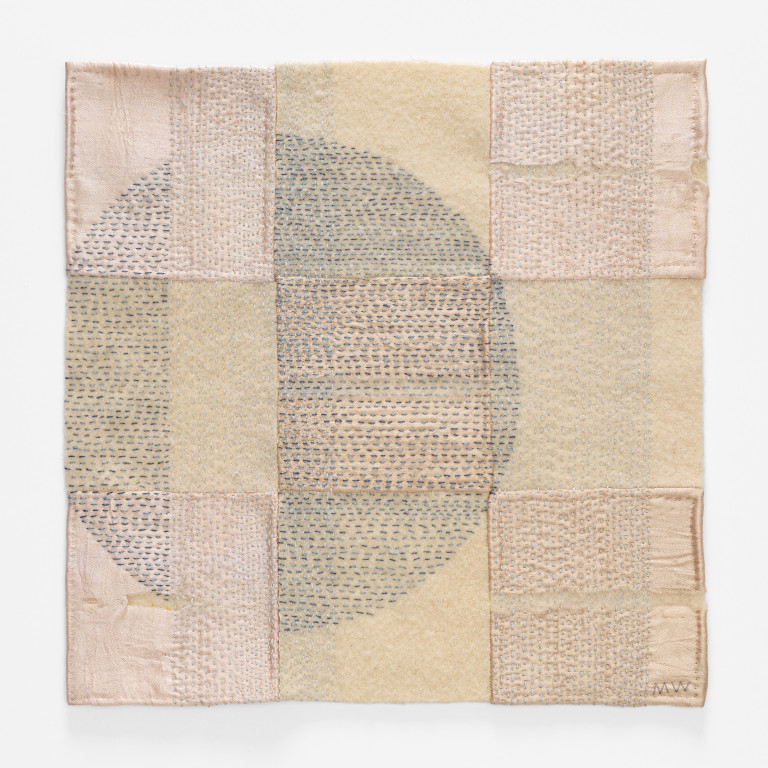 Reclaimed wool, satin bindings, thread, embroidery floss