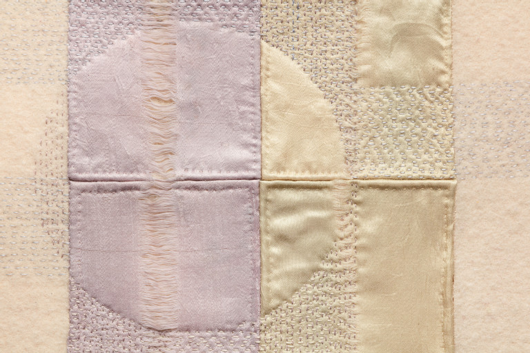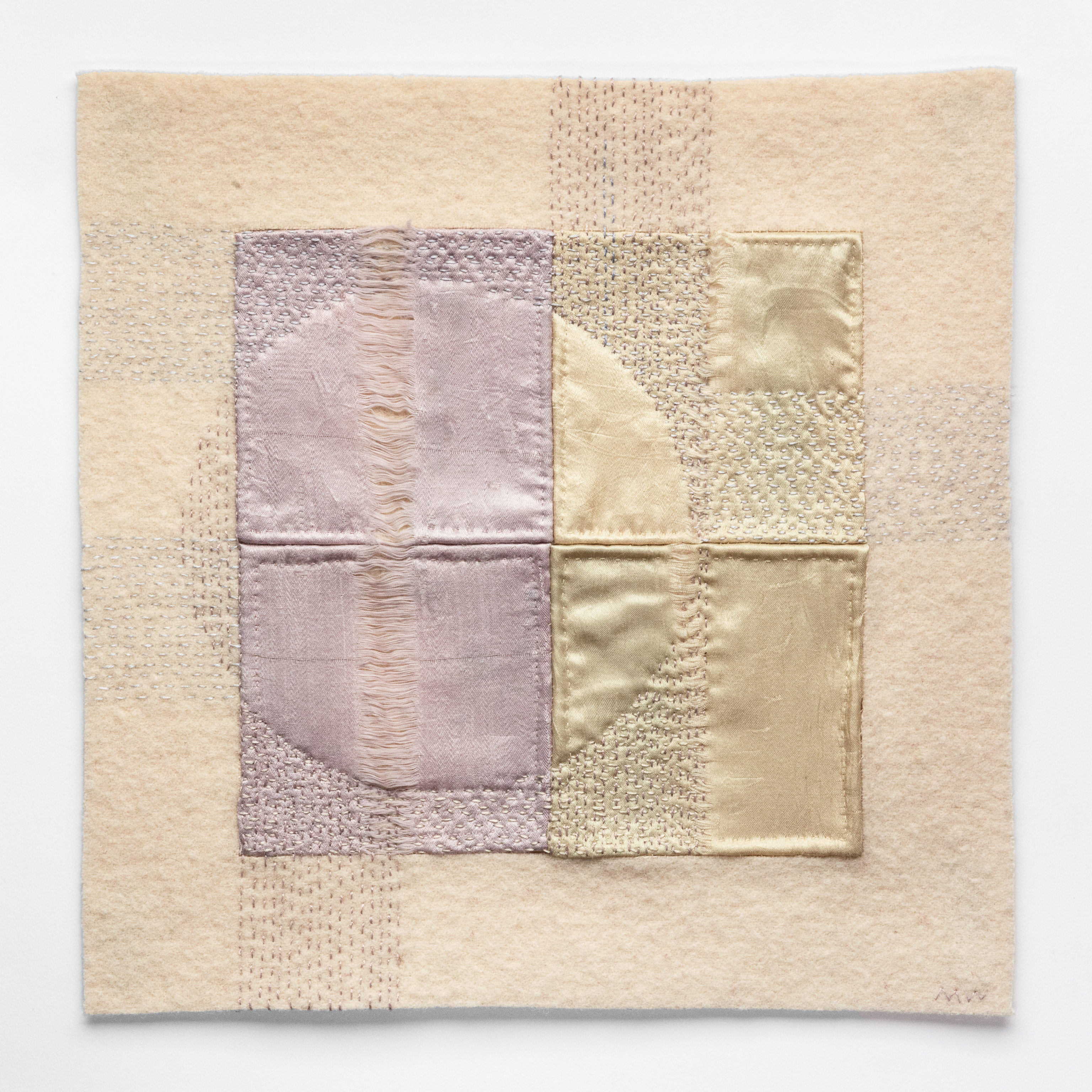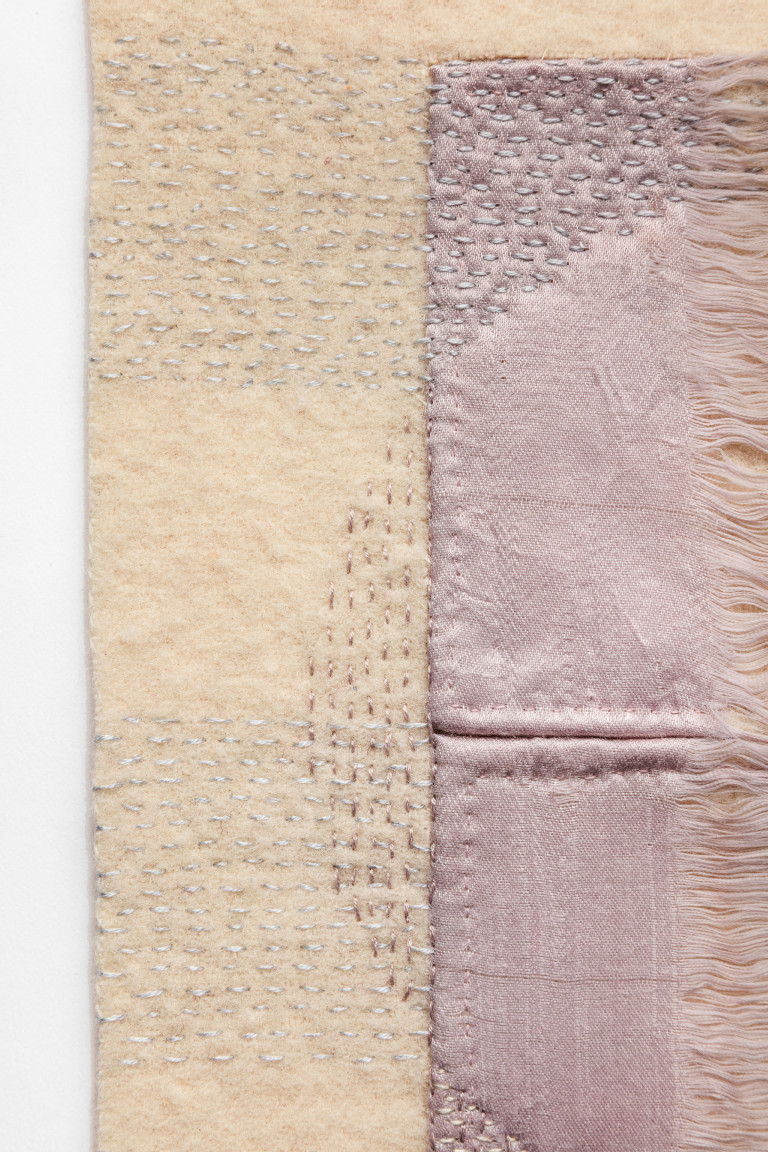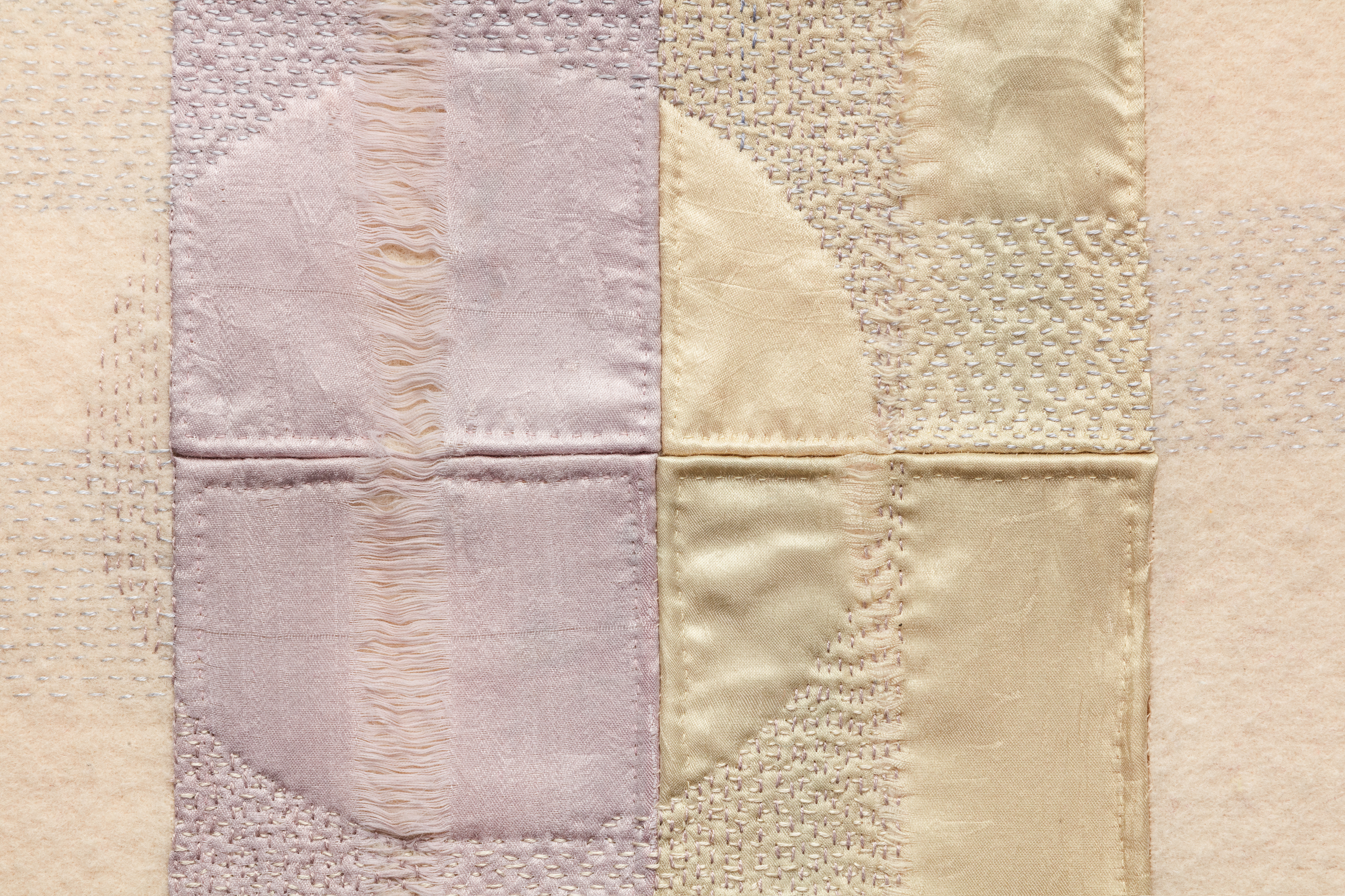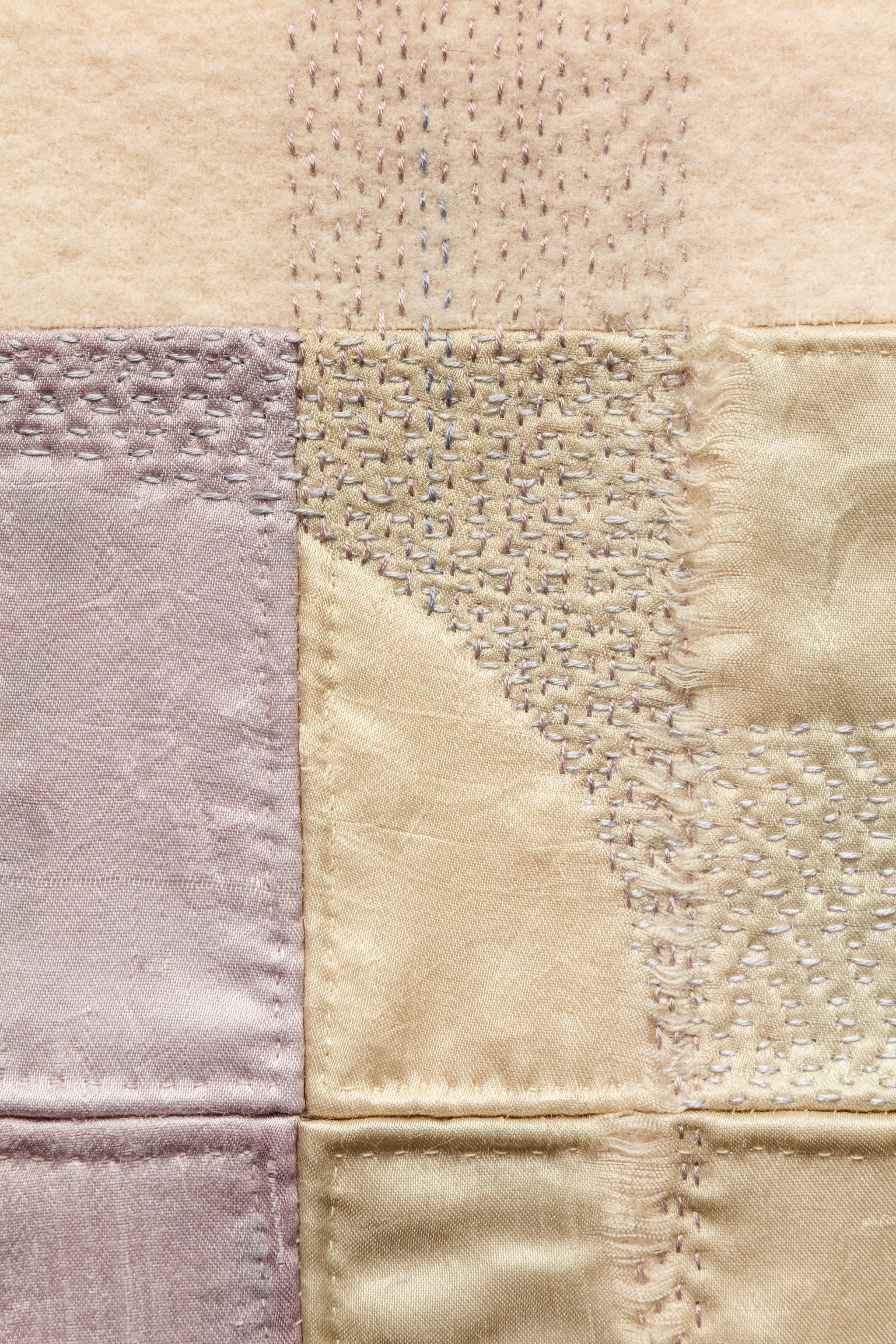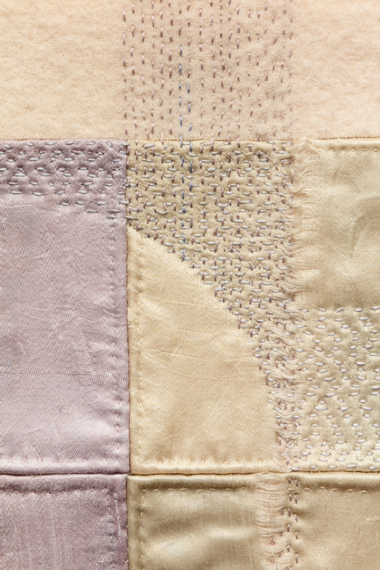 Reclaimed wool, satin bindings, thread, embroidery floss