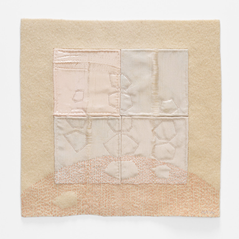 Reclaimed wool, satin bindings, thread, embroidery floss