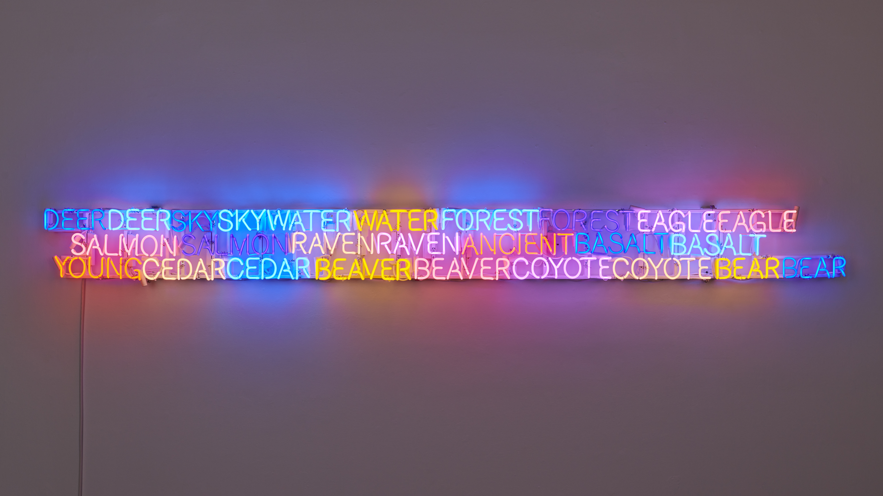 The twinned language references the animals, plants, elements and histories that inform my experience and understanding of many Wests. Doubled, the words call backward and forward to ancestors and future generations, each other and the viewer.