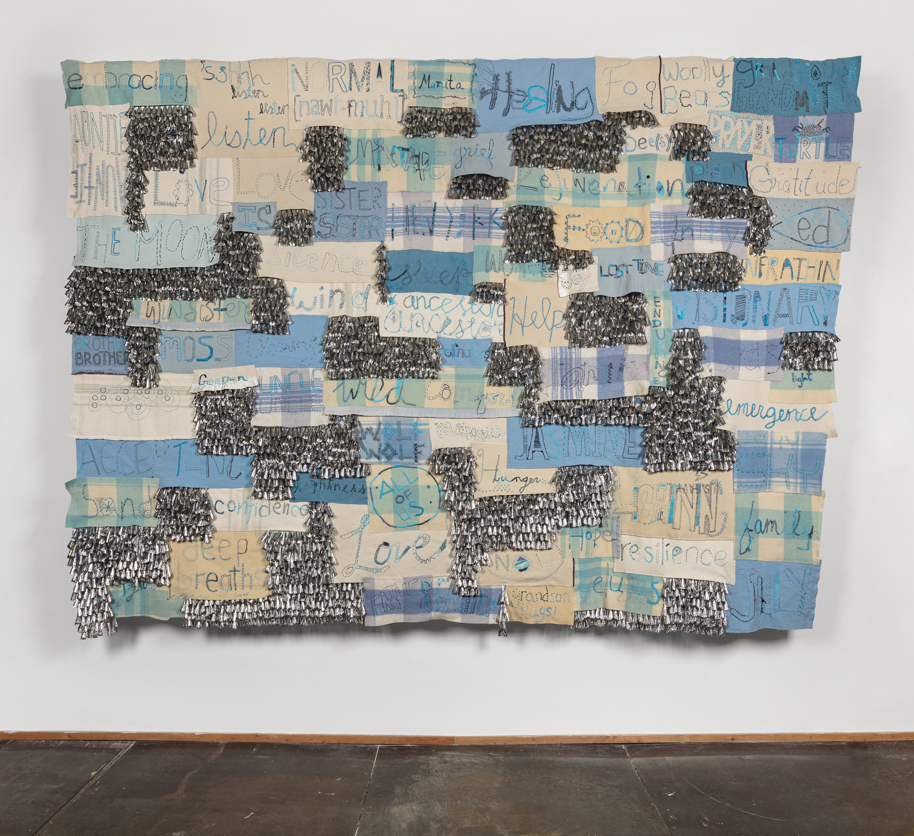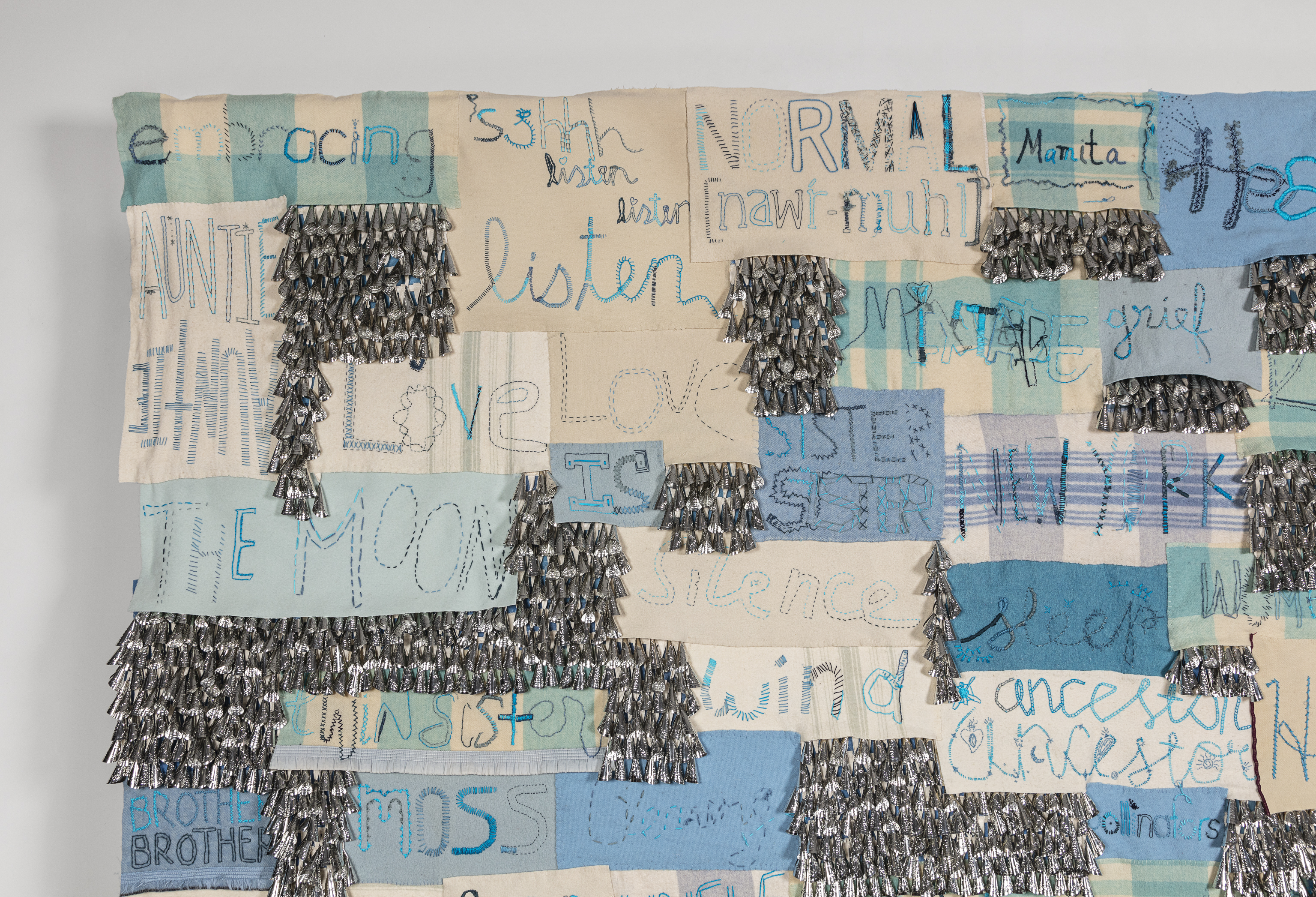 If the handwritten word is an extension of one’s body and the cadence of one’s voice, then all the intergenerational hands embroidering these panels amplify the intention. As witness to the conversations and thoughts that spring forward when we gather together, the blankets are transformed into a record of energy and experience. I’m interested in sewing circles as collective meditations, a recognition of what is universal, a chorus of song.