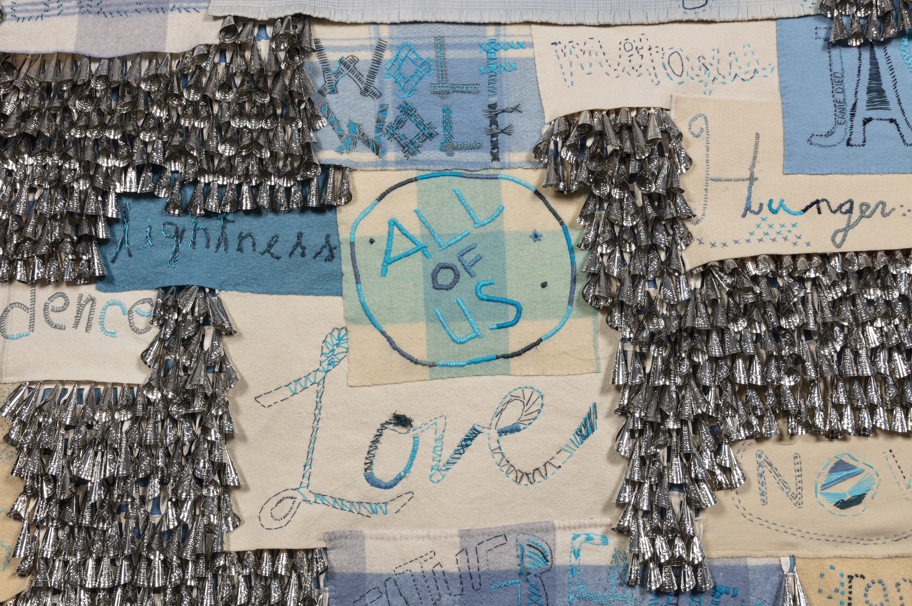 Reclaimed wool blankets, tin jingles, embroidery floss, thread