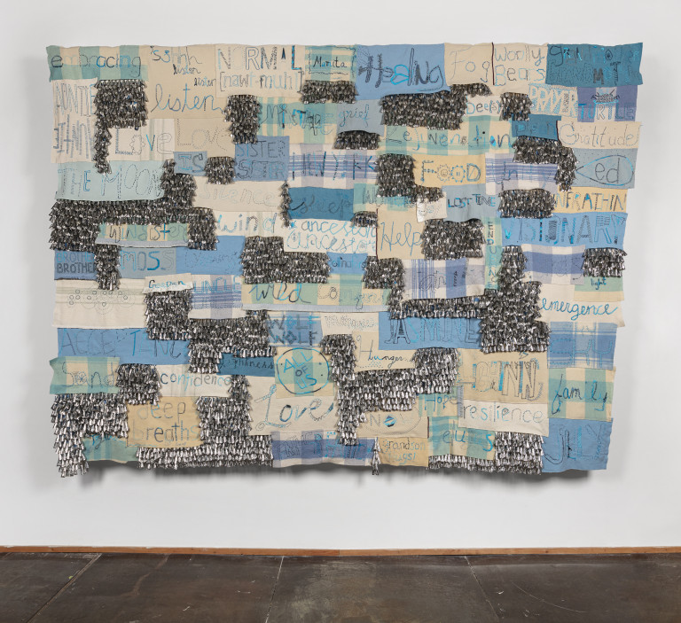 Participants were encouraged to write answers and send it back to us as a photo. In my studio, we worked to translate the hand of each participant across over a hundred panels of reclaimed wool blankets. The pandemic disrupted multiple attempts to host sewing circles at the museum, but eventually it happened in March of 2022. It was the first in-person program at the Museum since lockdown and drew 300+ participants over the course of several days.