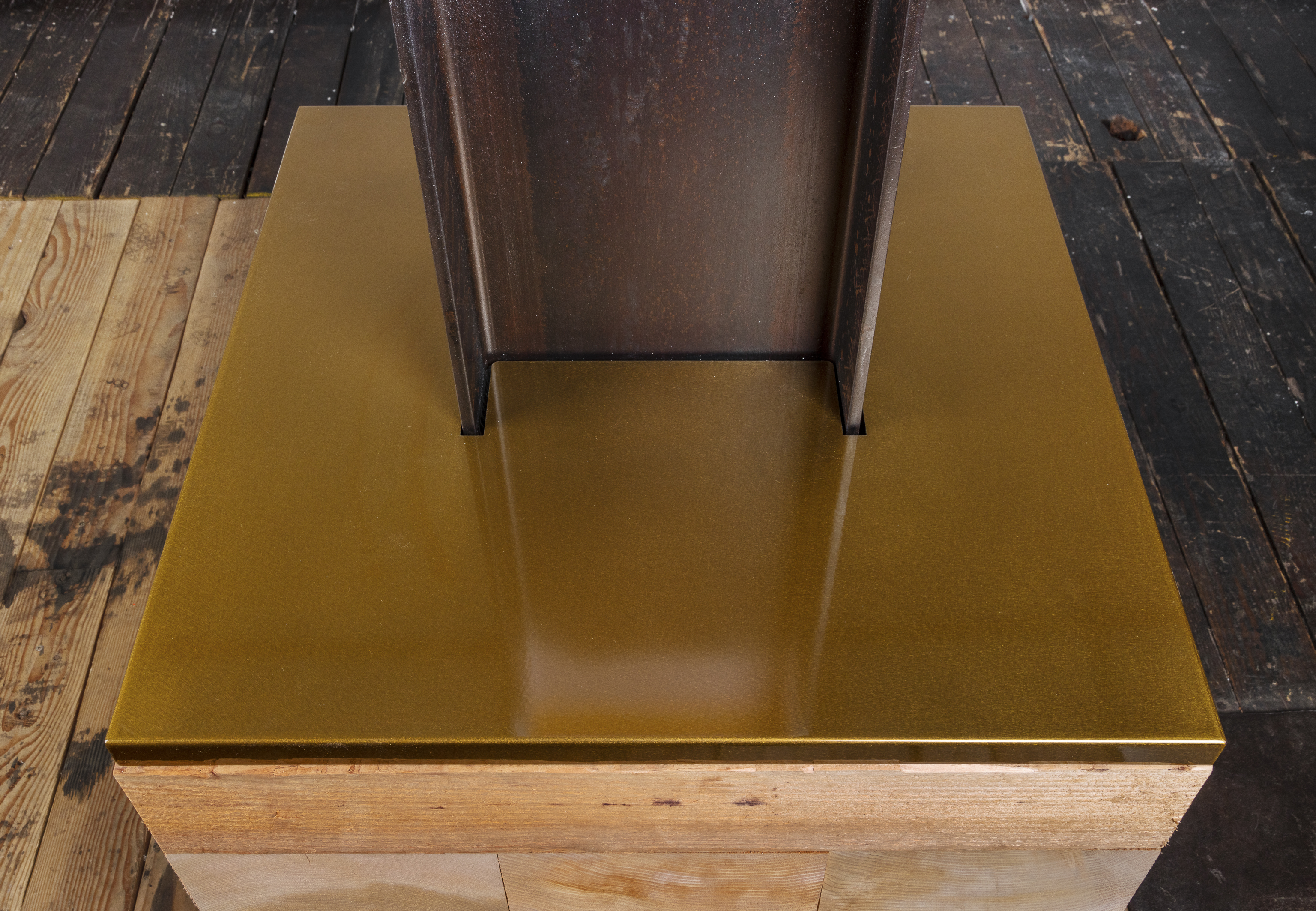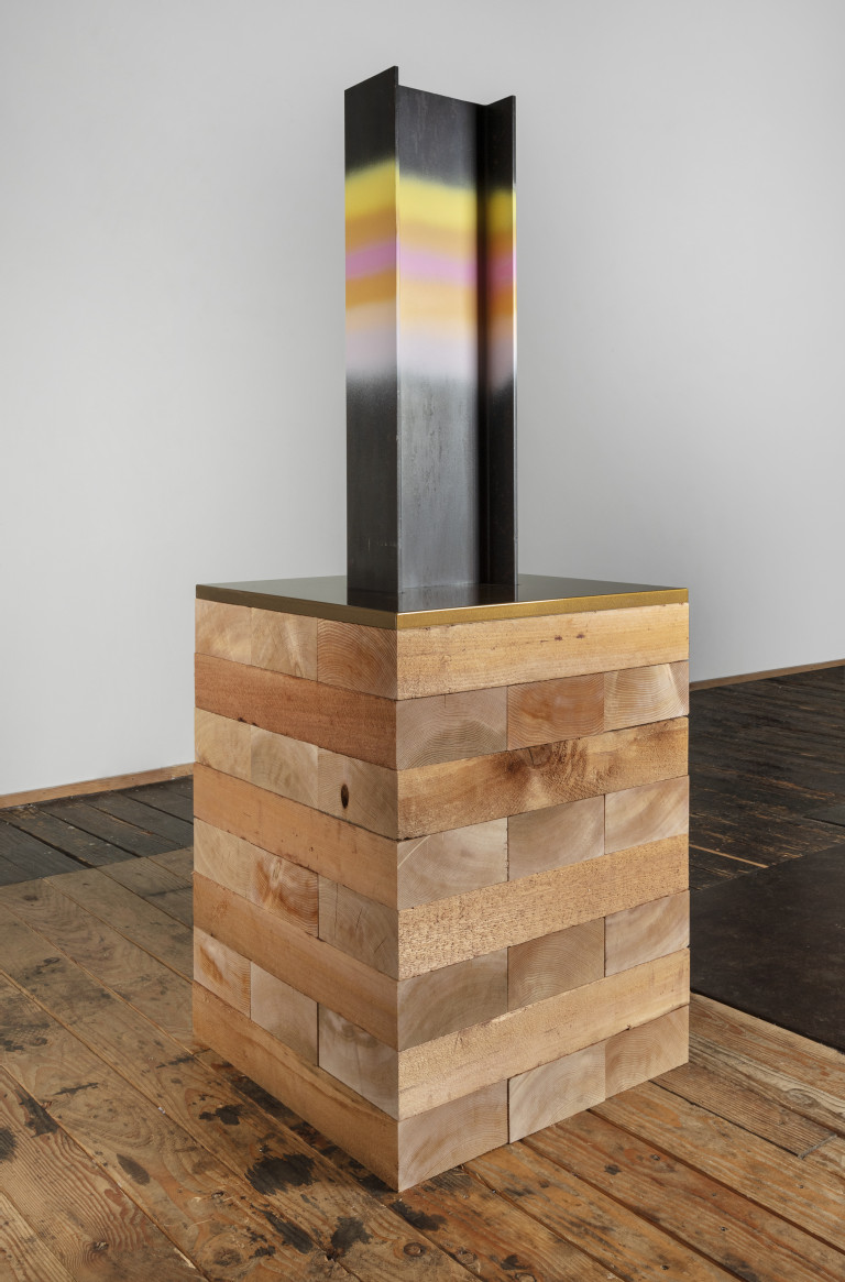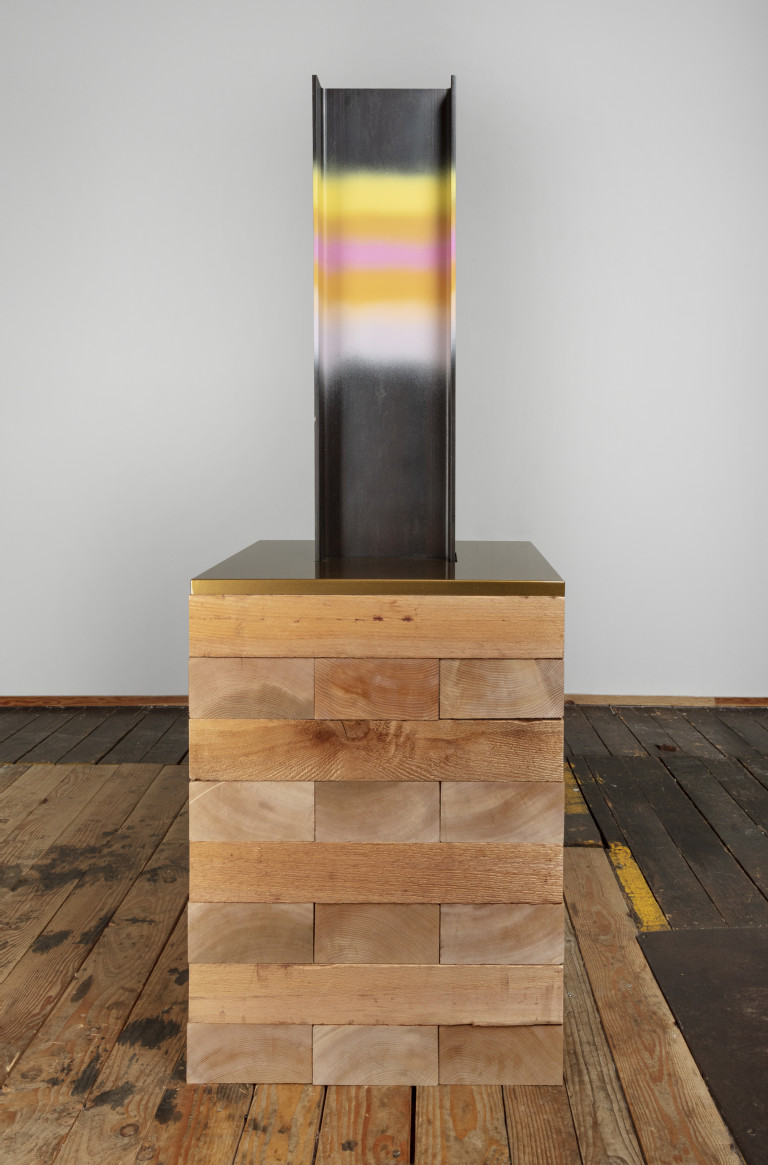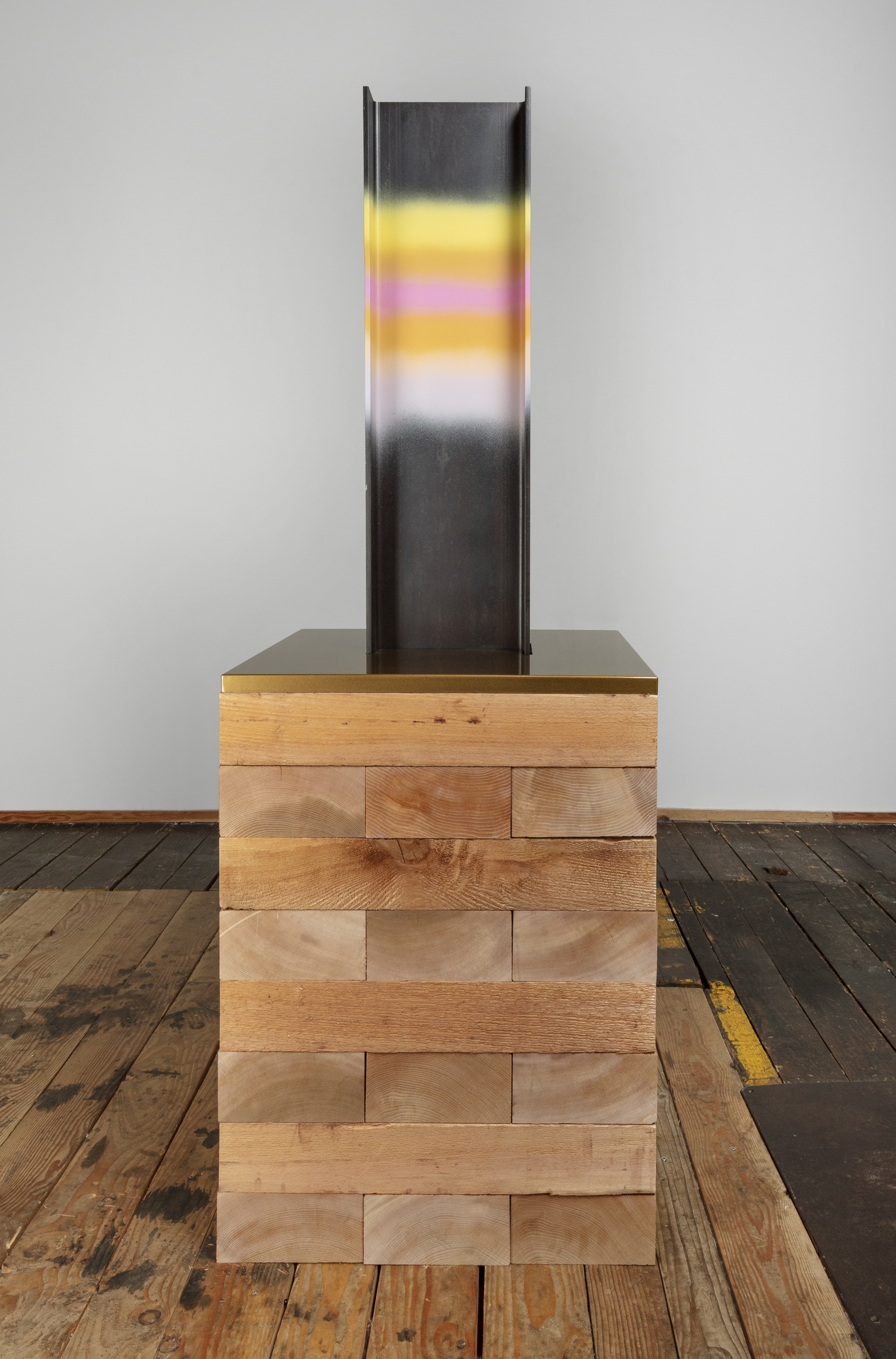 Steel I-beam, cedar, spray paint