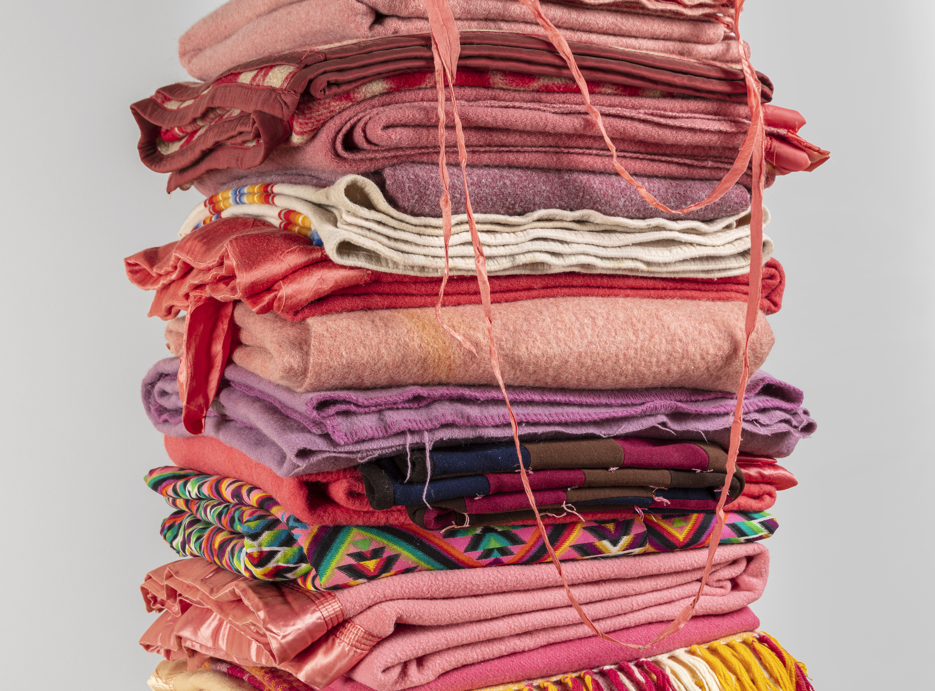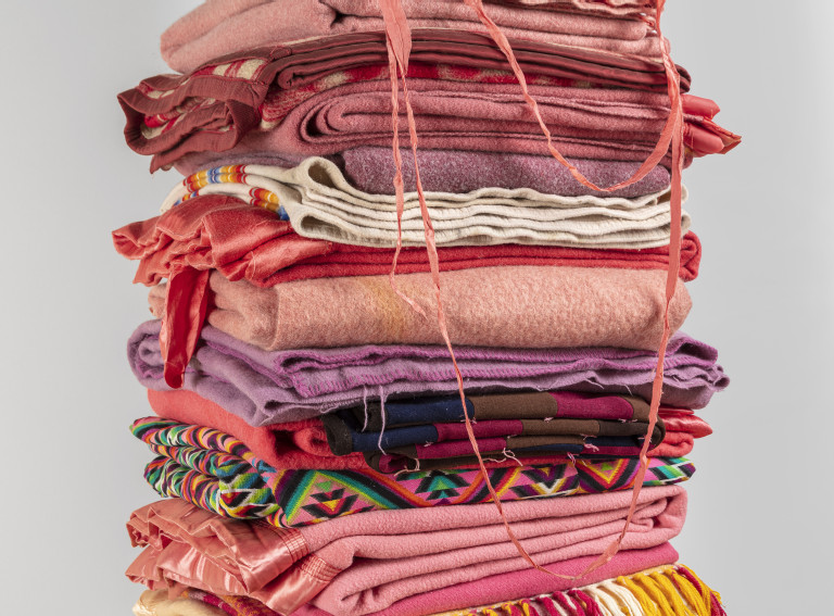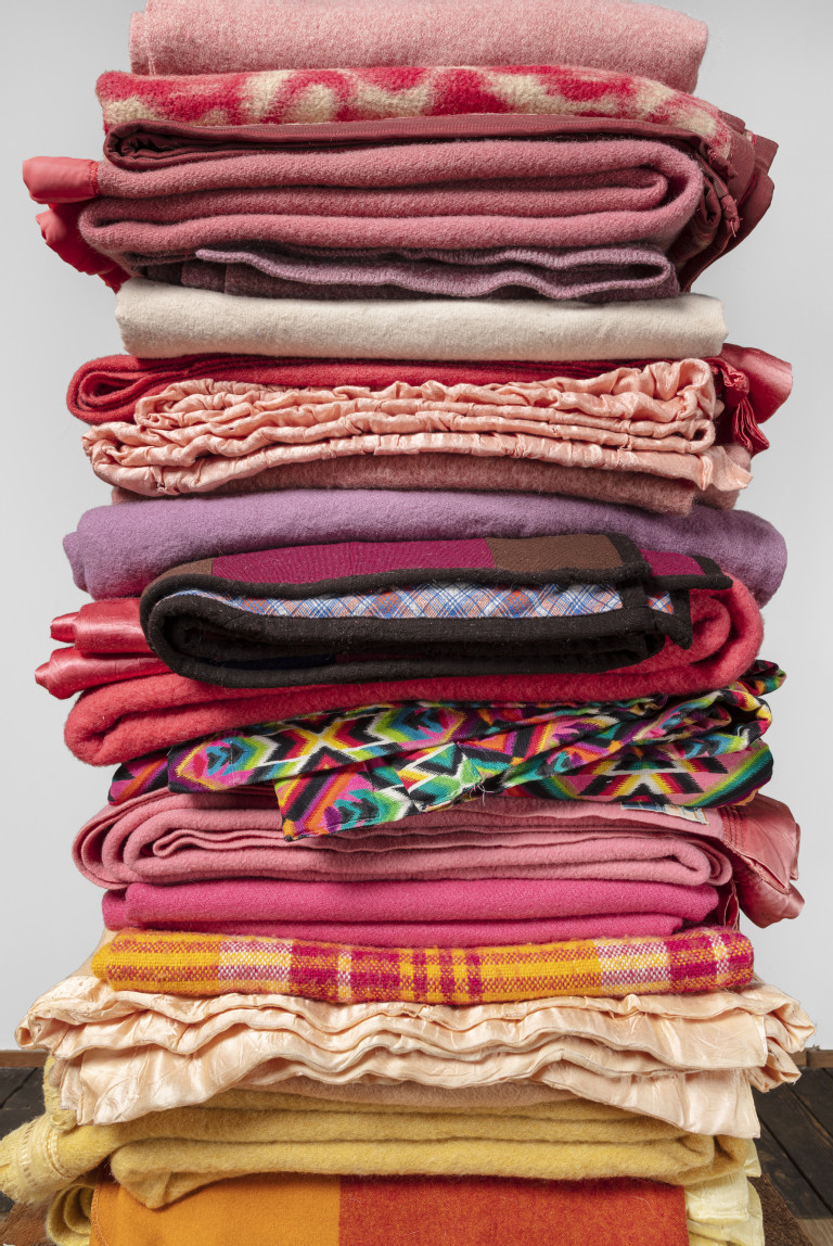 Reclaimed wool blankets, cedar, steel I-beam
