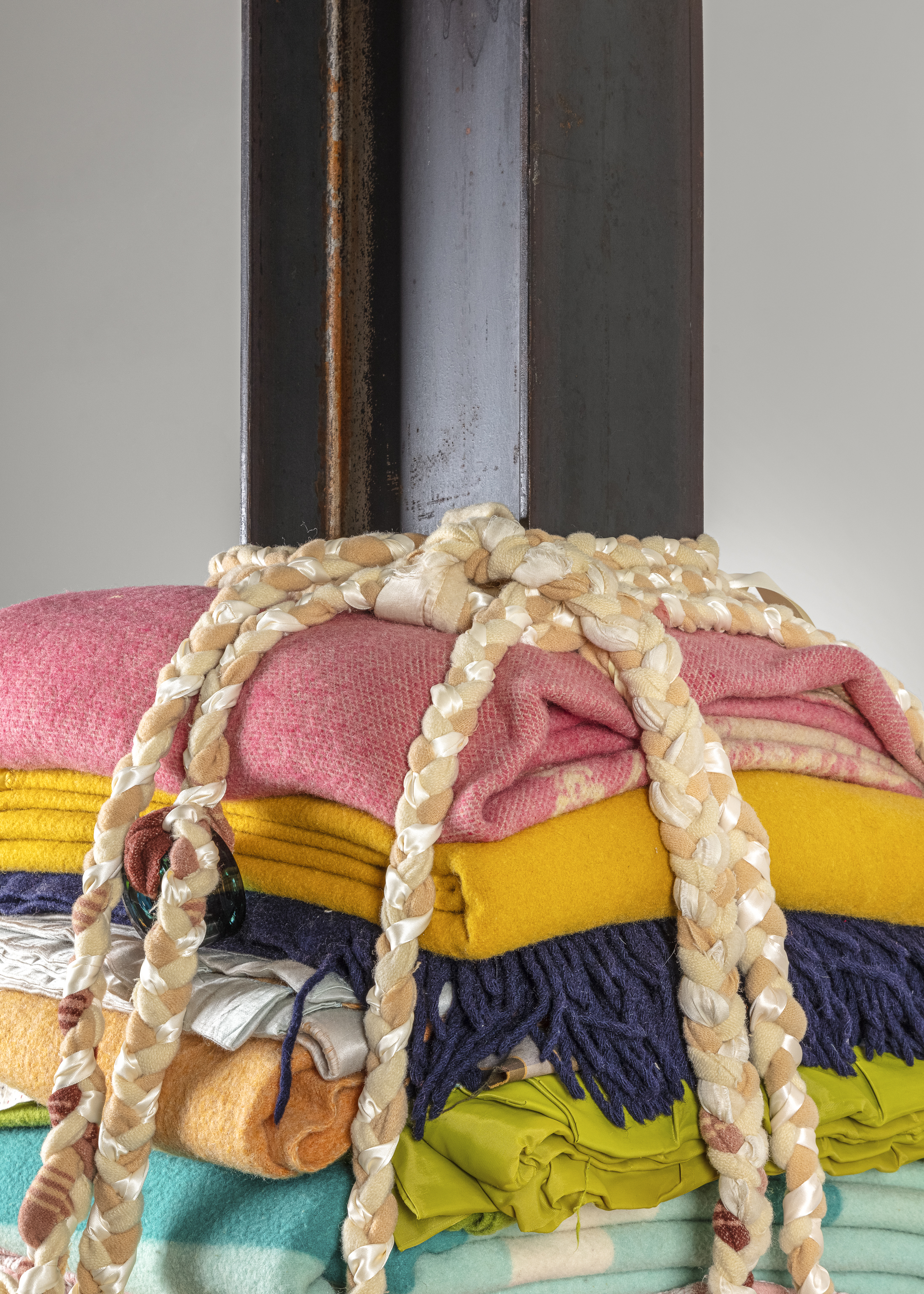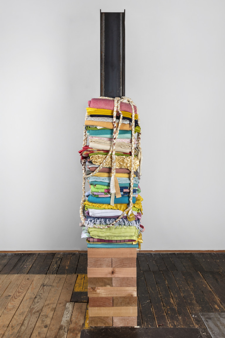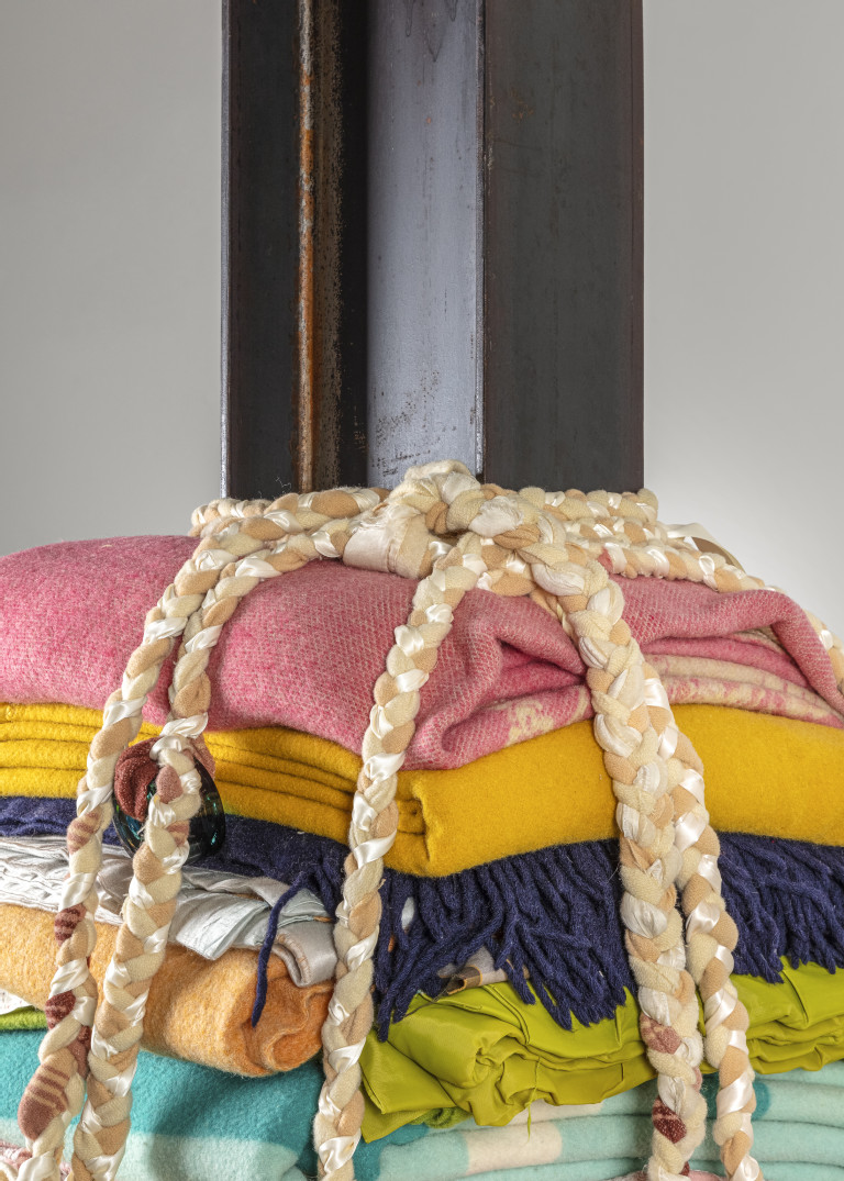 The cedar base of the column similarly invokes associations with family hope chests and generational memory. This material, sacred to the Indigenous peoples of the Pacific Northwest where I live and grew up, fills me with nostalgia and connects earth to sky via the scent and feel of towering conifers. Likewise the steel I-beam references my “skywalking” Haudenosaunee ancestors who walked across the steel skeletons of the skyscrapers high above New York City. As one of the most recycled materials in the world, steel carries the legacy of past generations forward into the present and future, similar to how blankets are sites of ongoing stories and symbols of our connectedness.