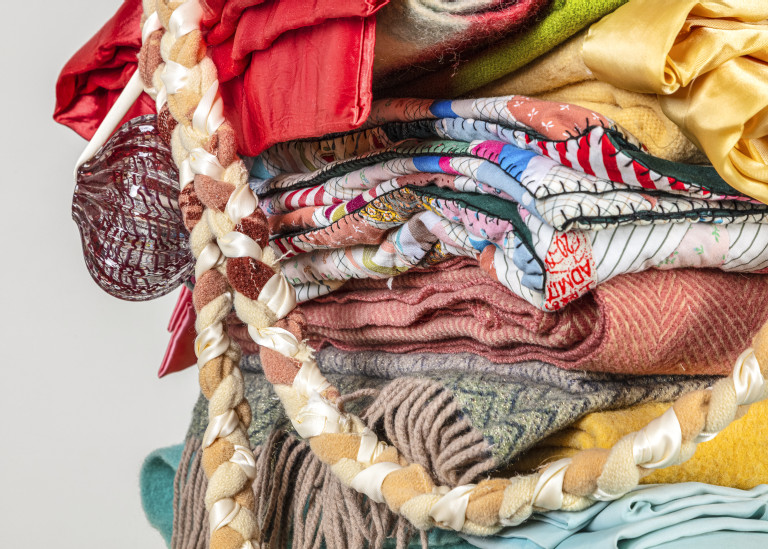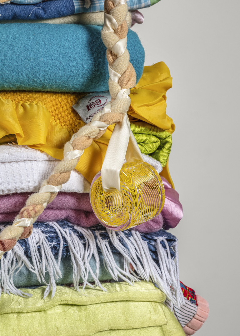 I’m not sure if it is the spring season, or reading Joy Harjo’s American Sunrise, or my connection to shiny beaded objects, but themes of light run through the Packer family blanket story column. For a while, I was positive that the sculpture should be titled Skywalker/Skyscraper (Ladder to Light). But as I was re-reading the blanket stories I found myself laughing at the story about beloved blankies “Dan” and “Steve.”