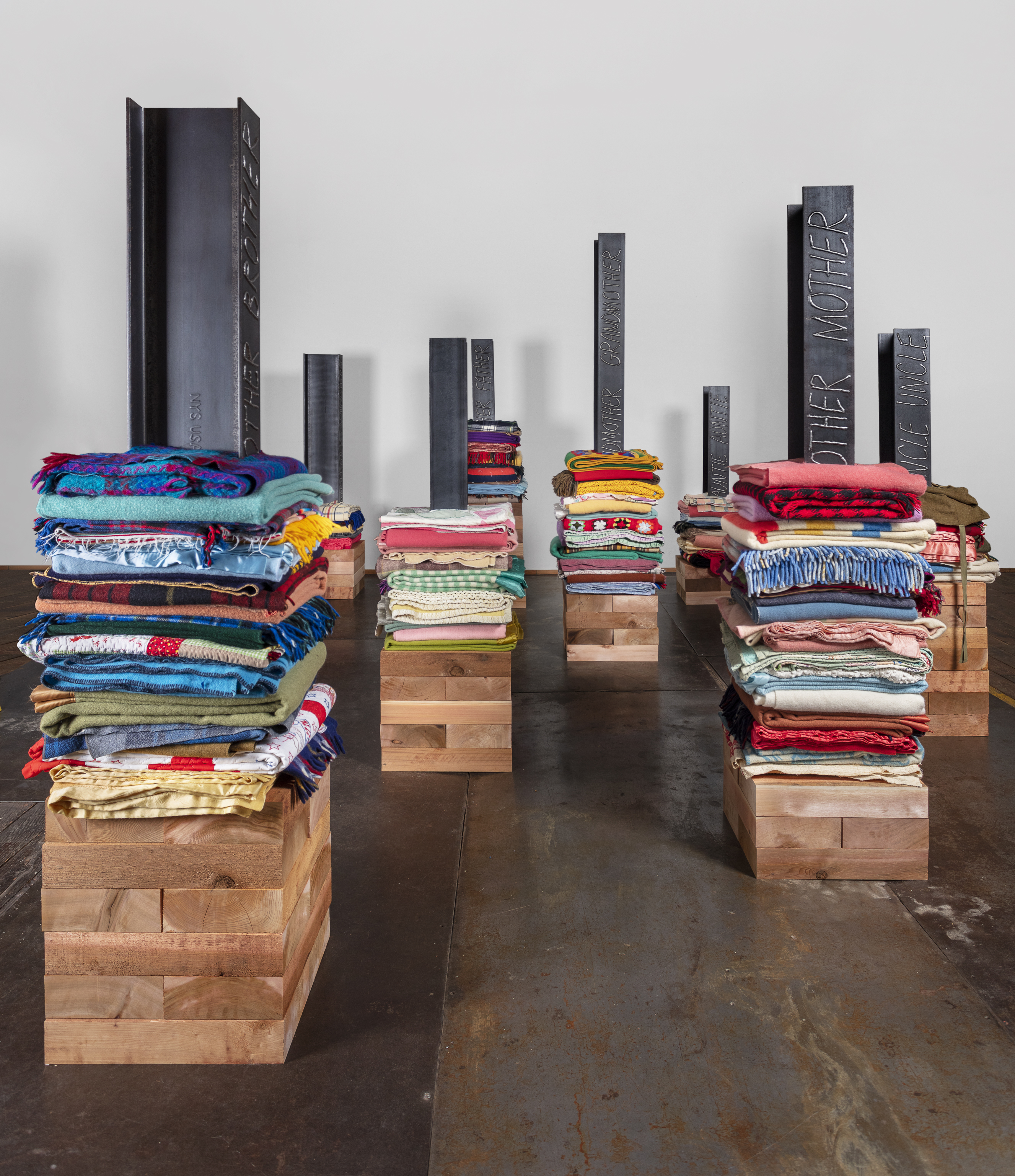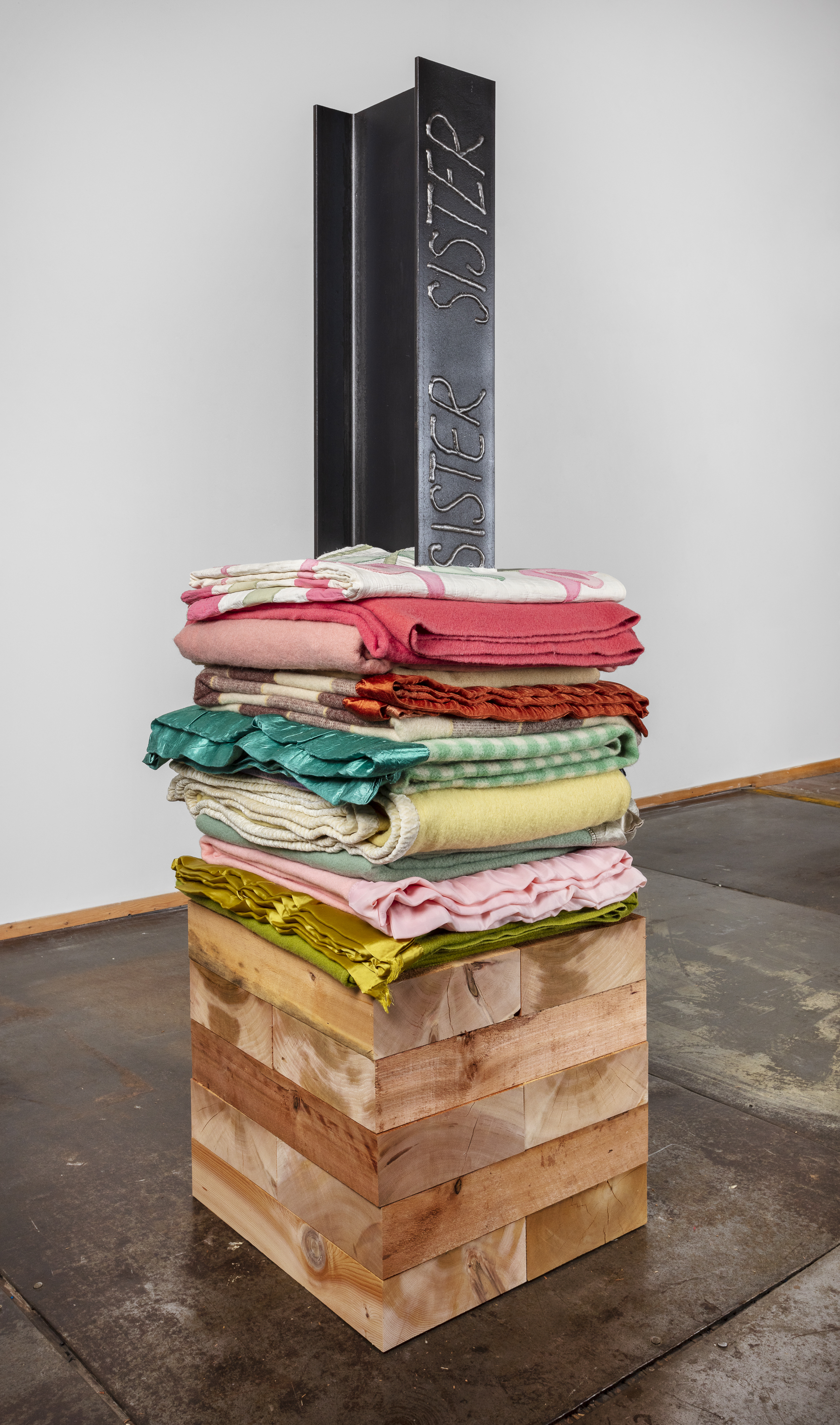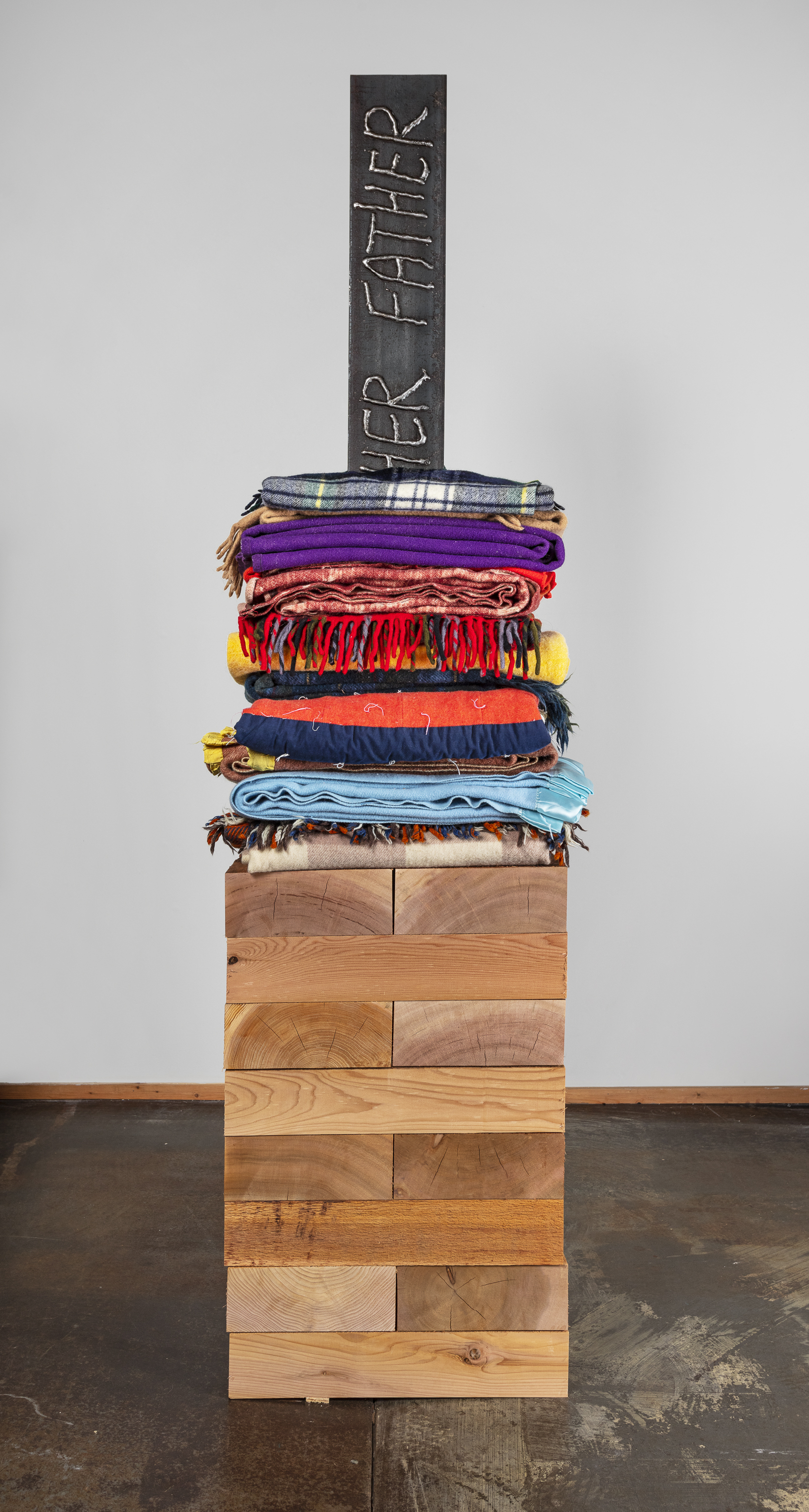 - 20 reclaimed blankets, salvaged cedar, steel I-beam