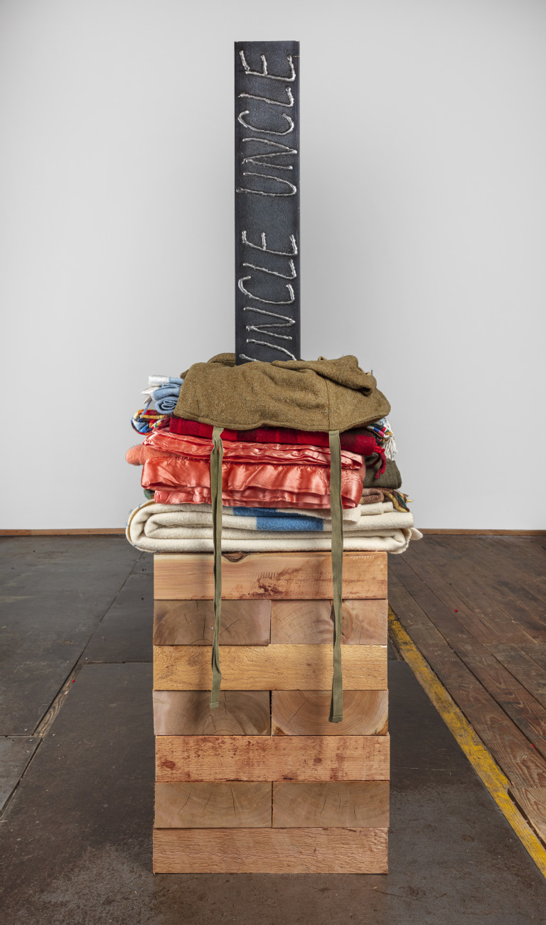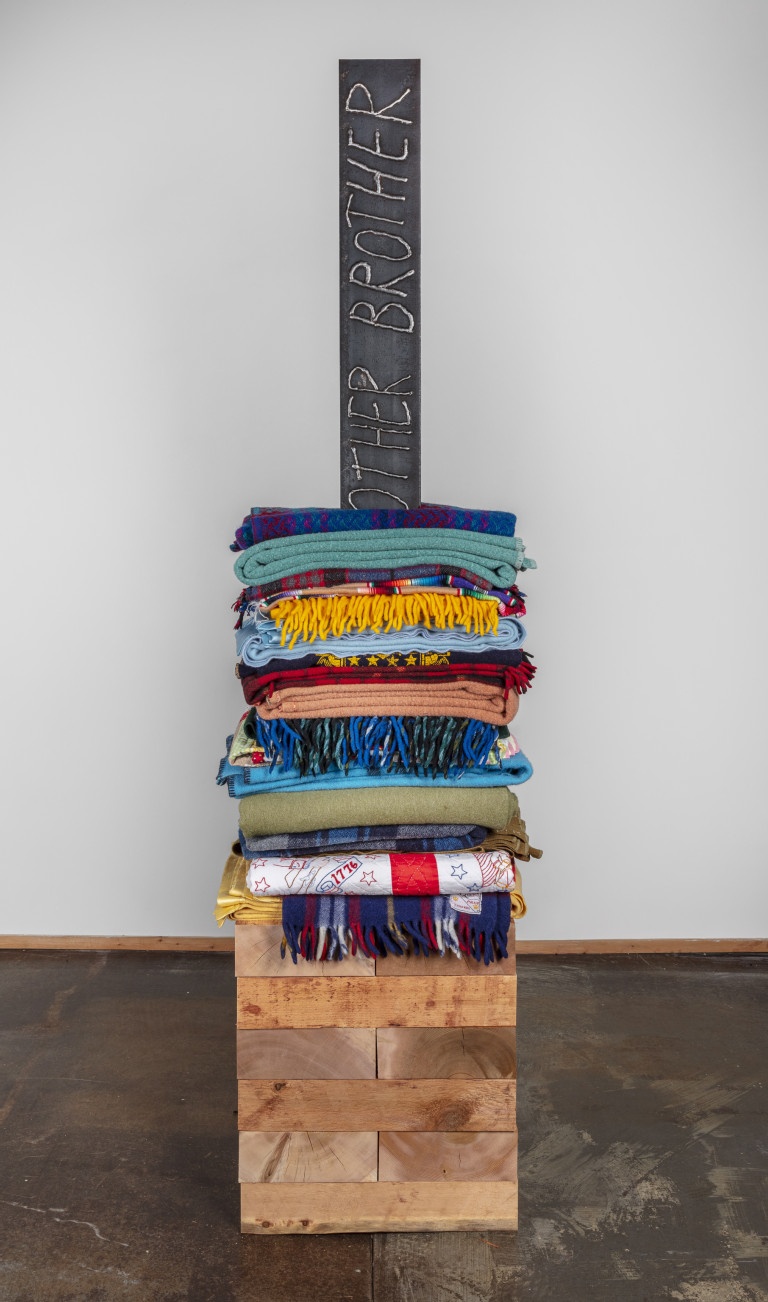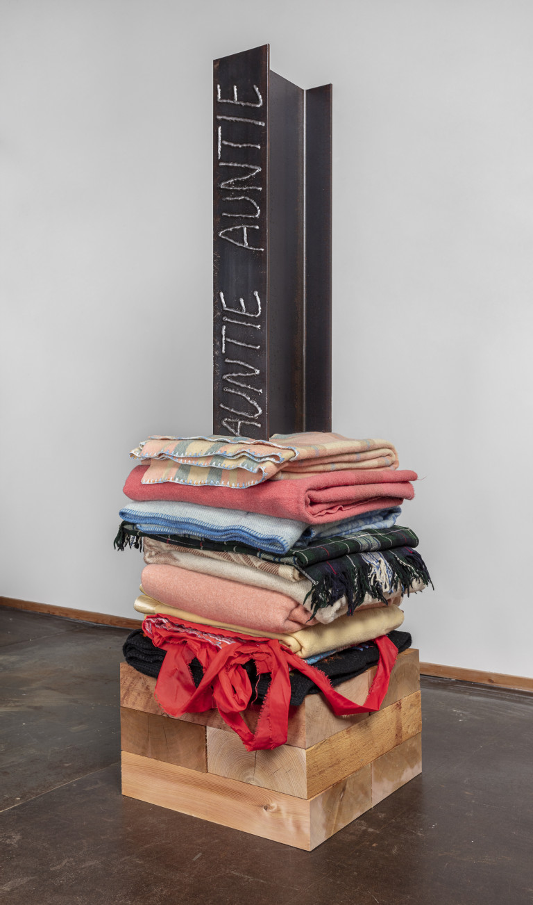 - 20 reclaimed blankets, salvaged cedar, steel I-beam