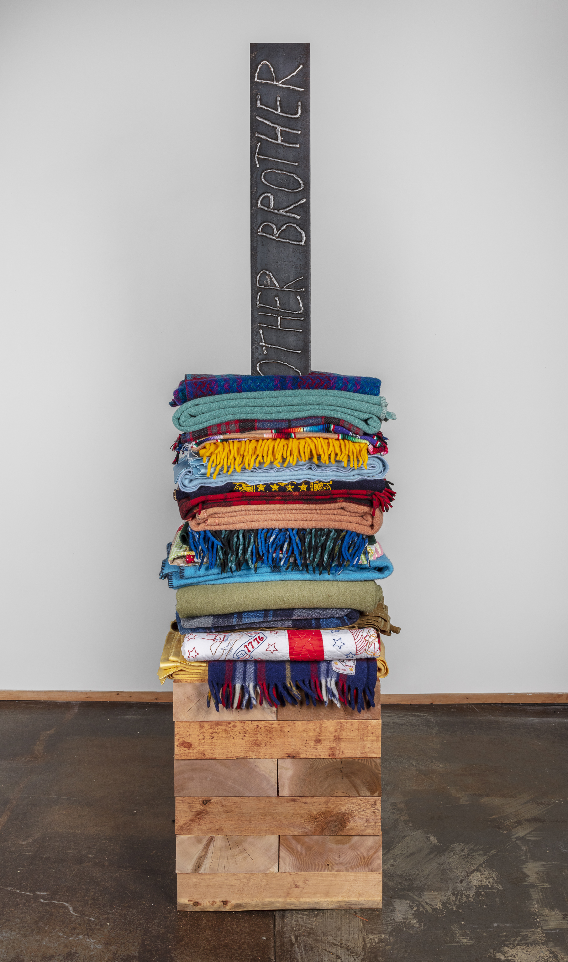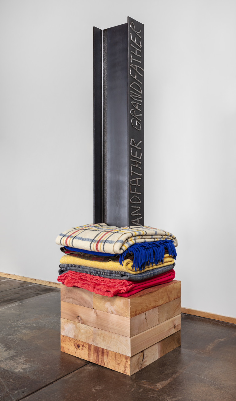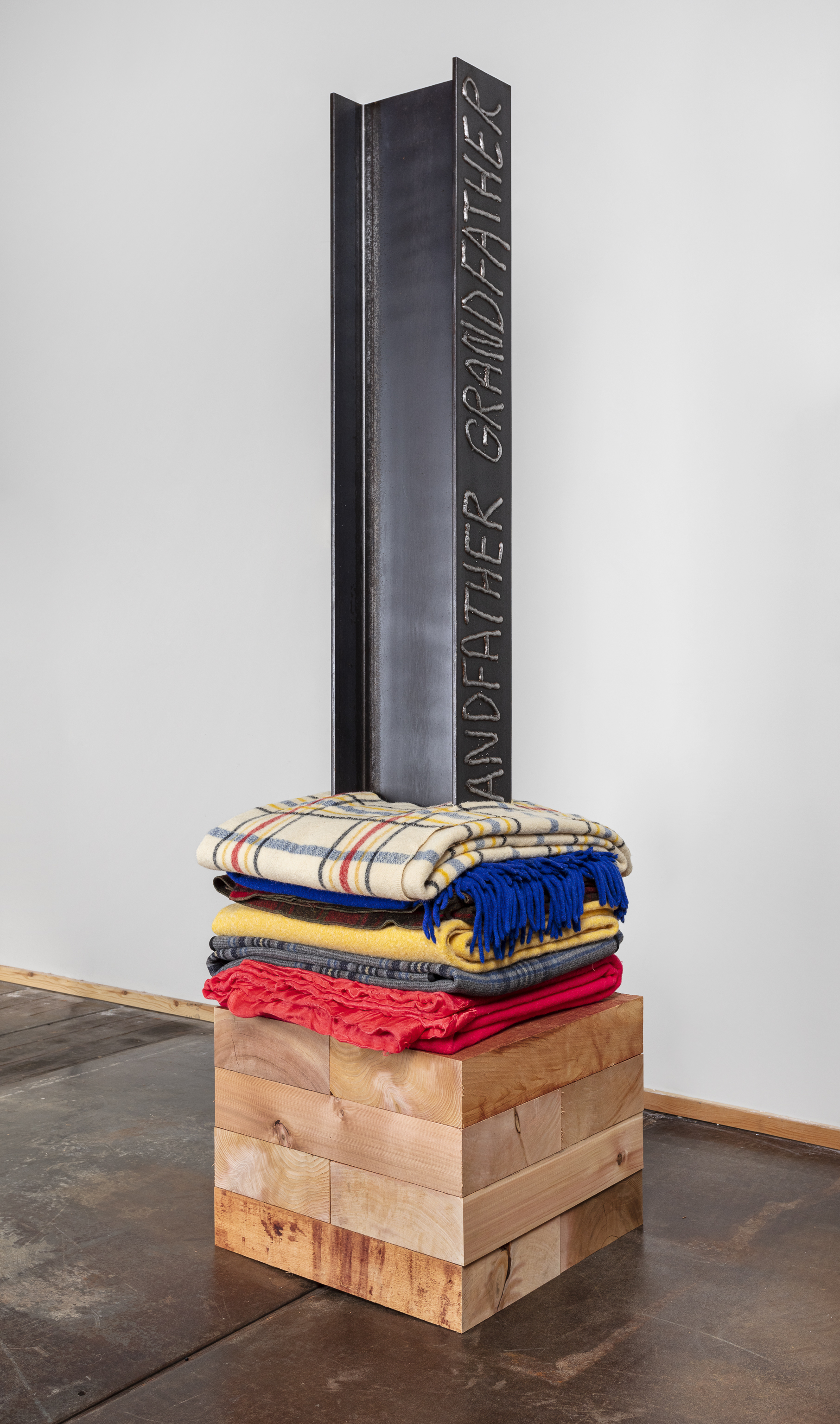 - 16 reclaimed blankets, salvaged cedar, steel I-beam