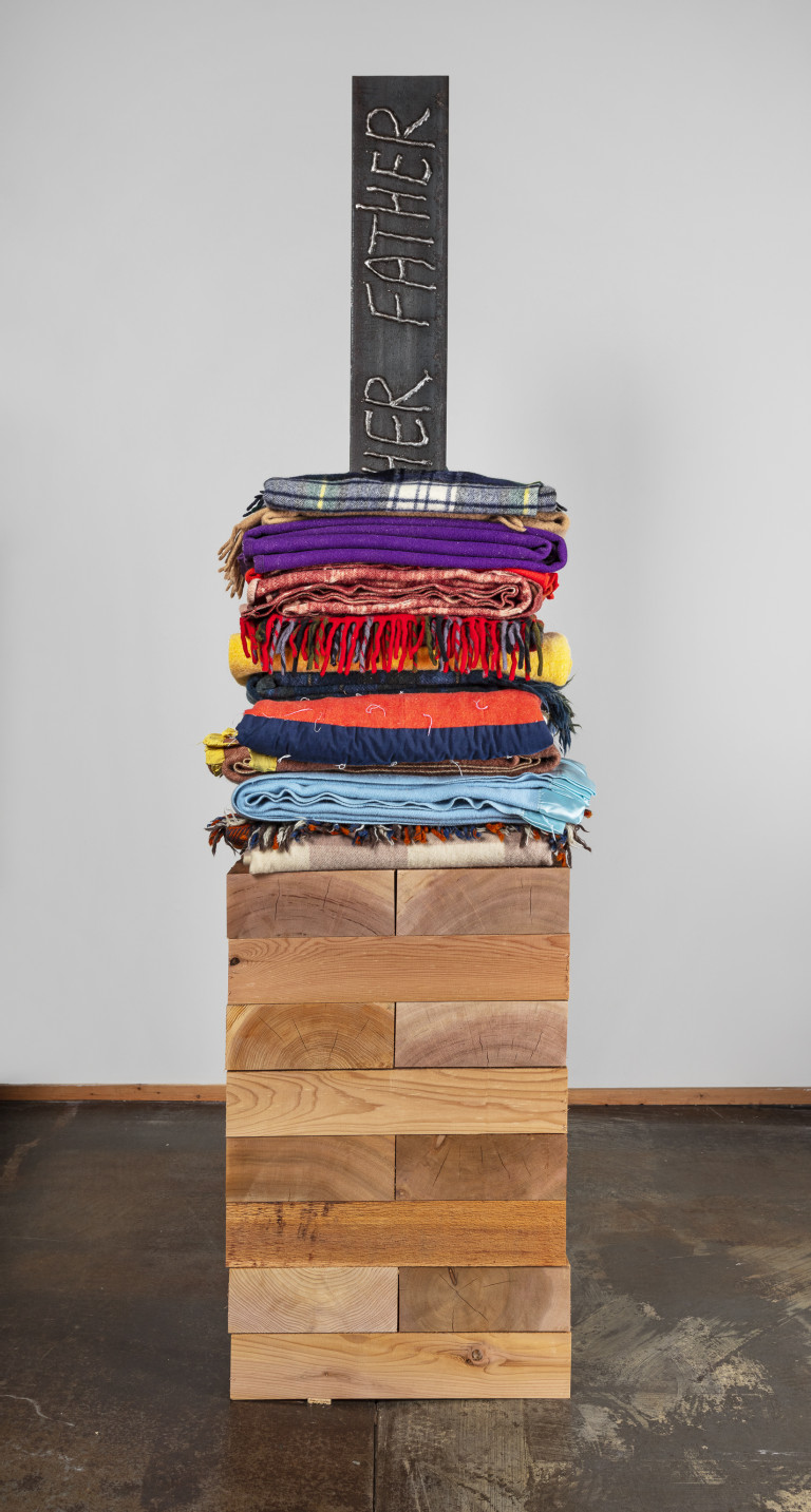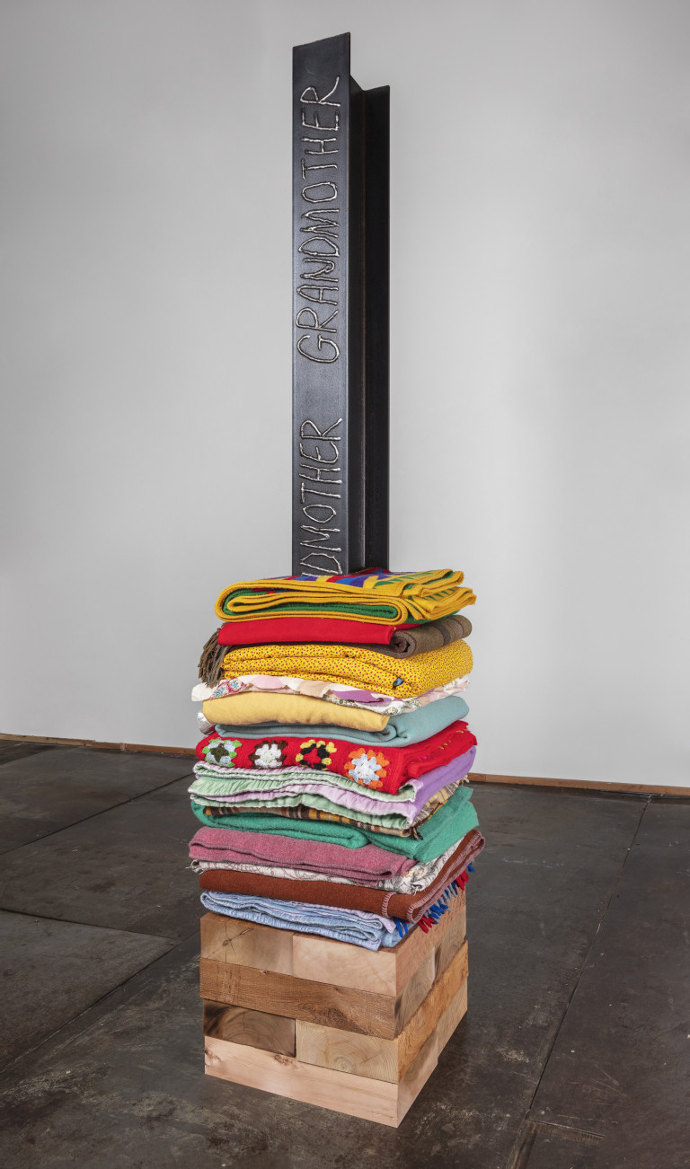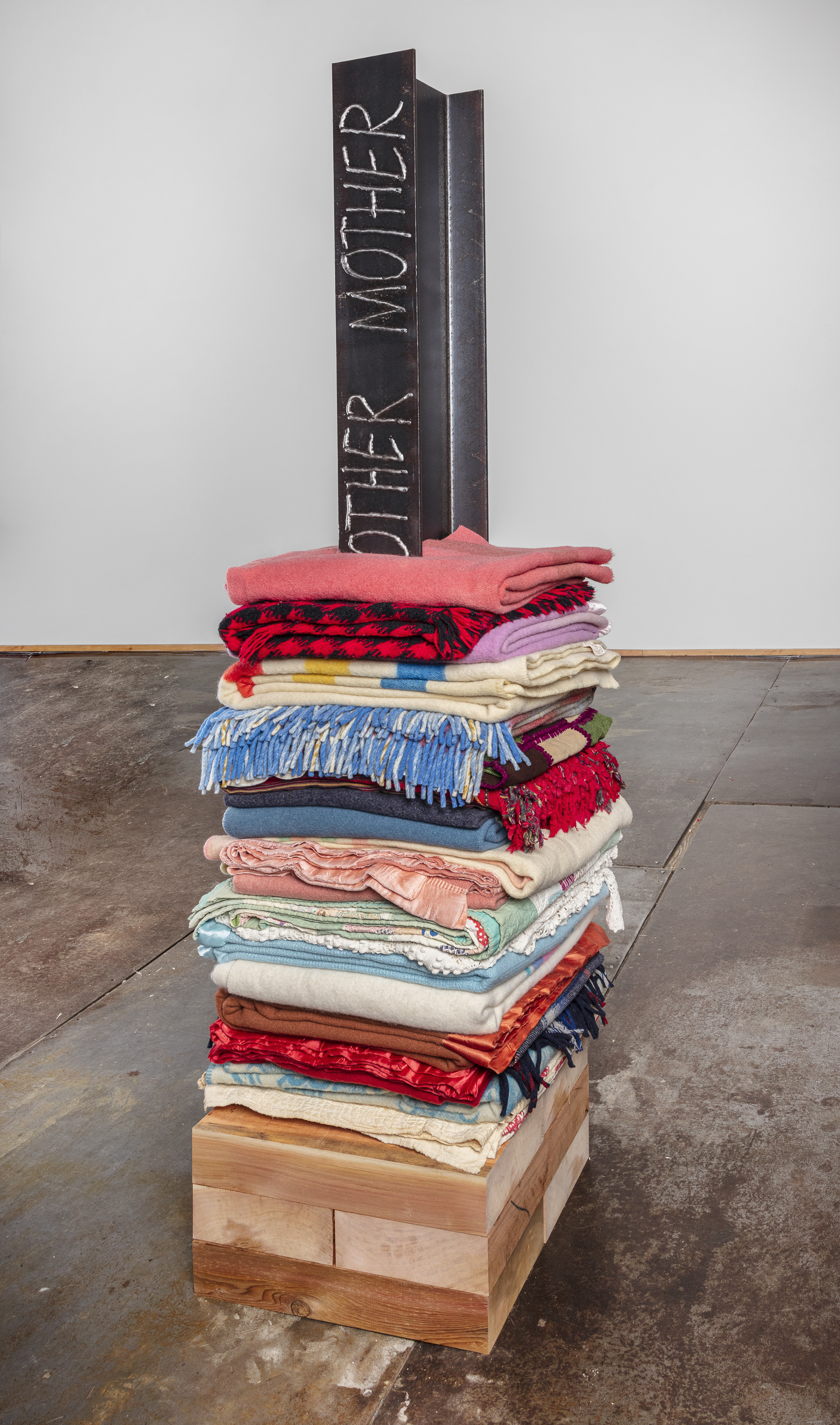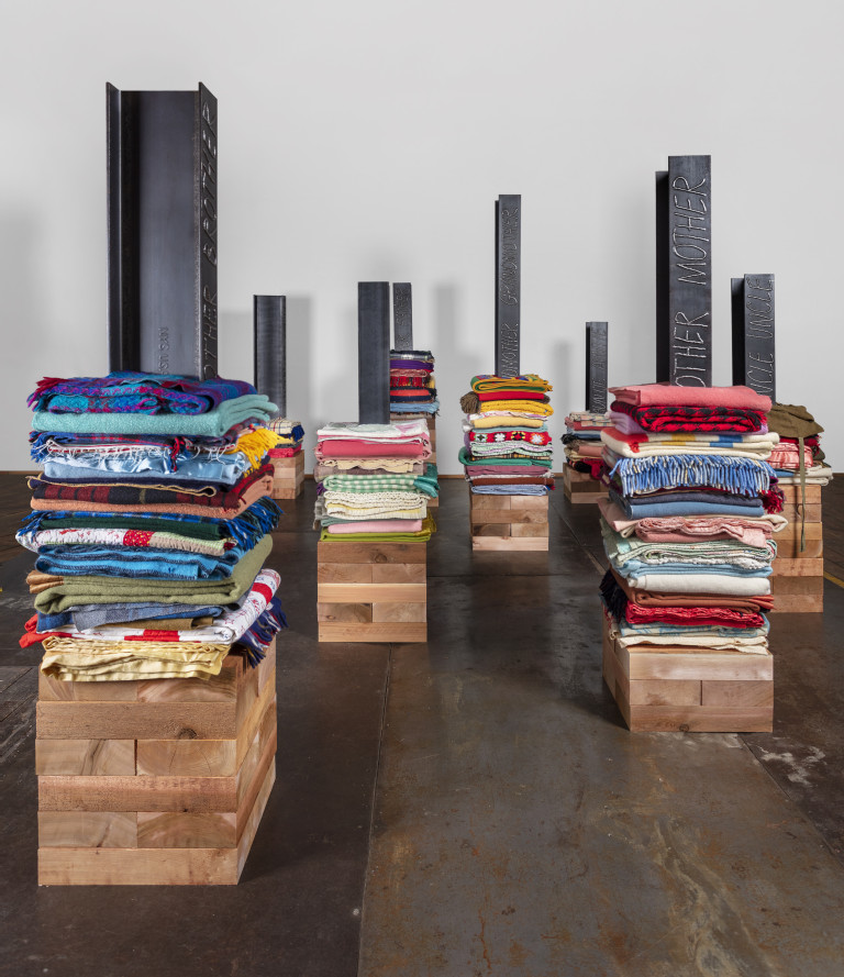 - 16 reclaimed blankets, salvaged cedar, steel I-beam