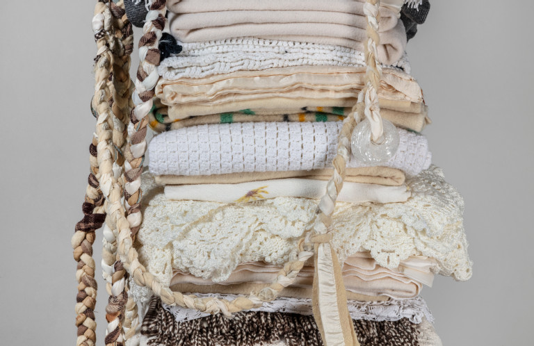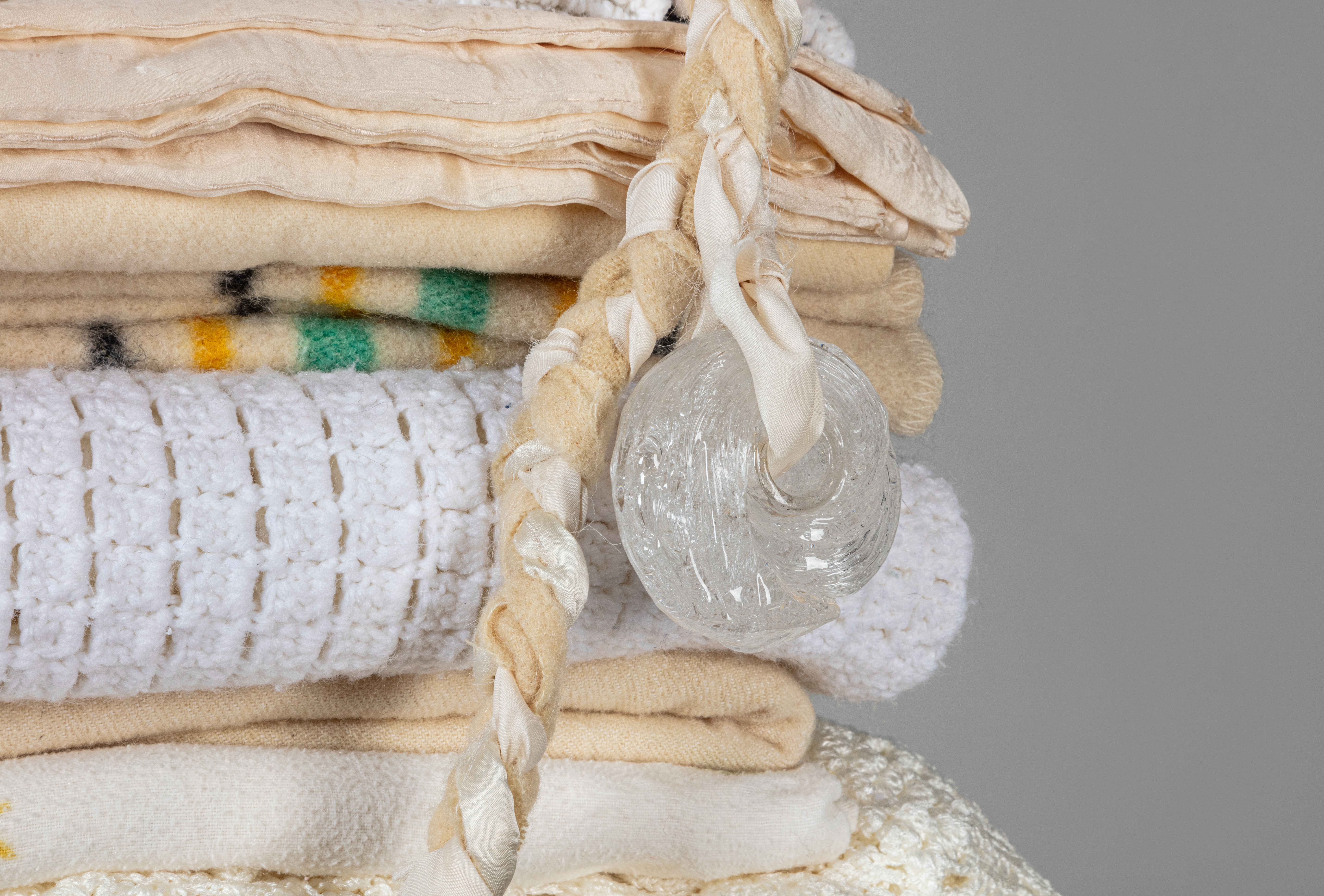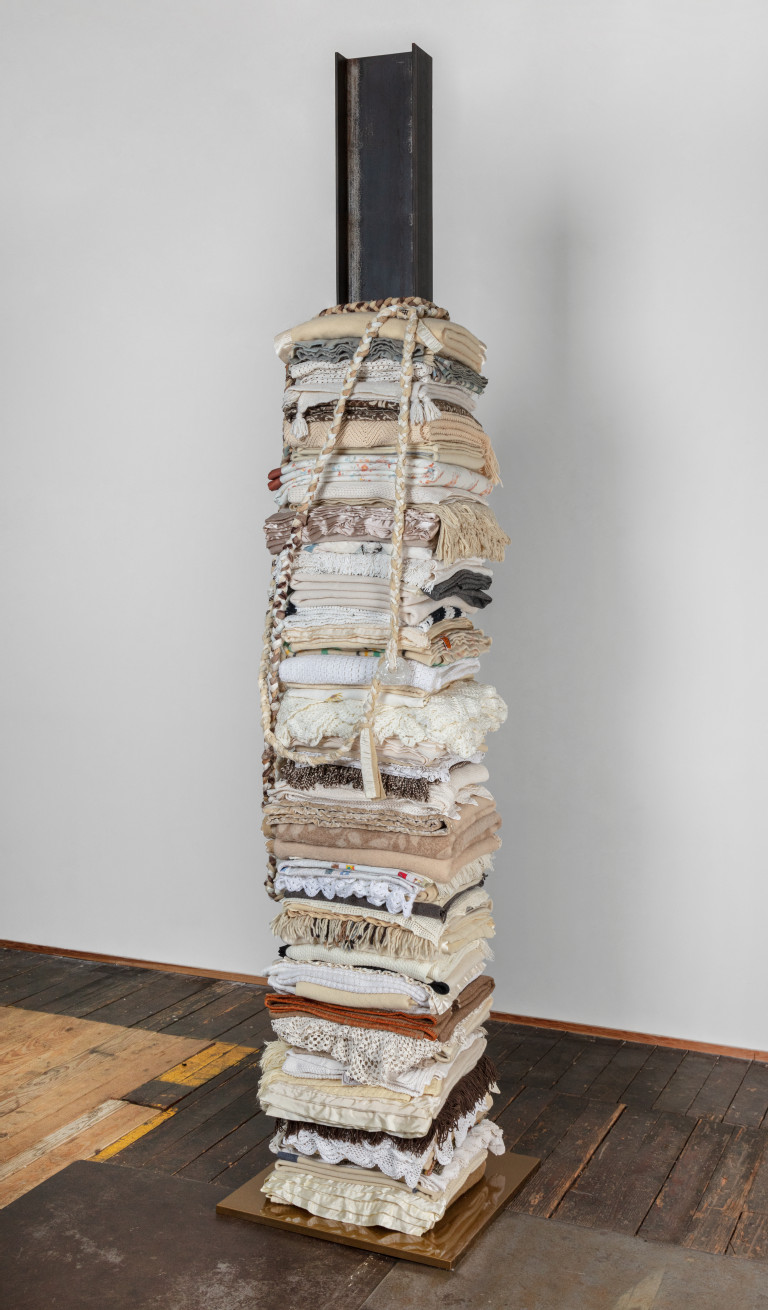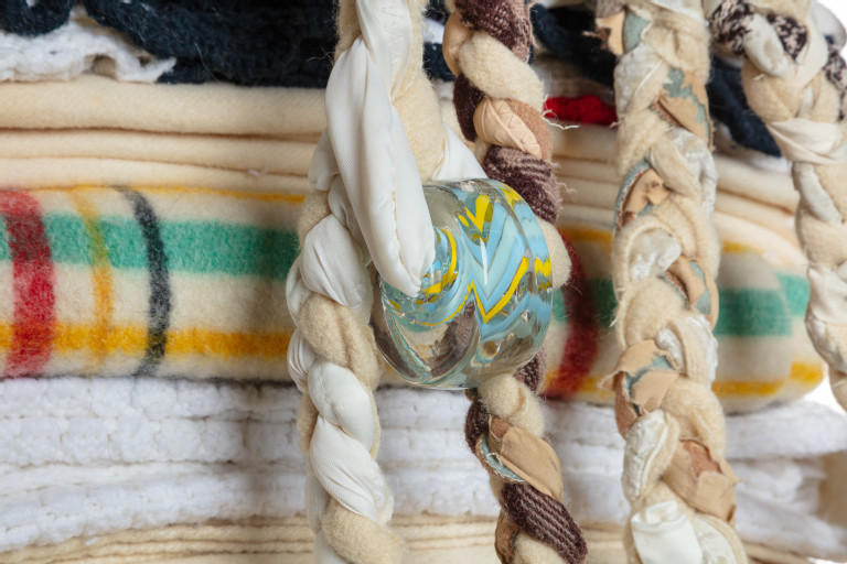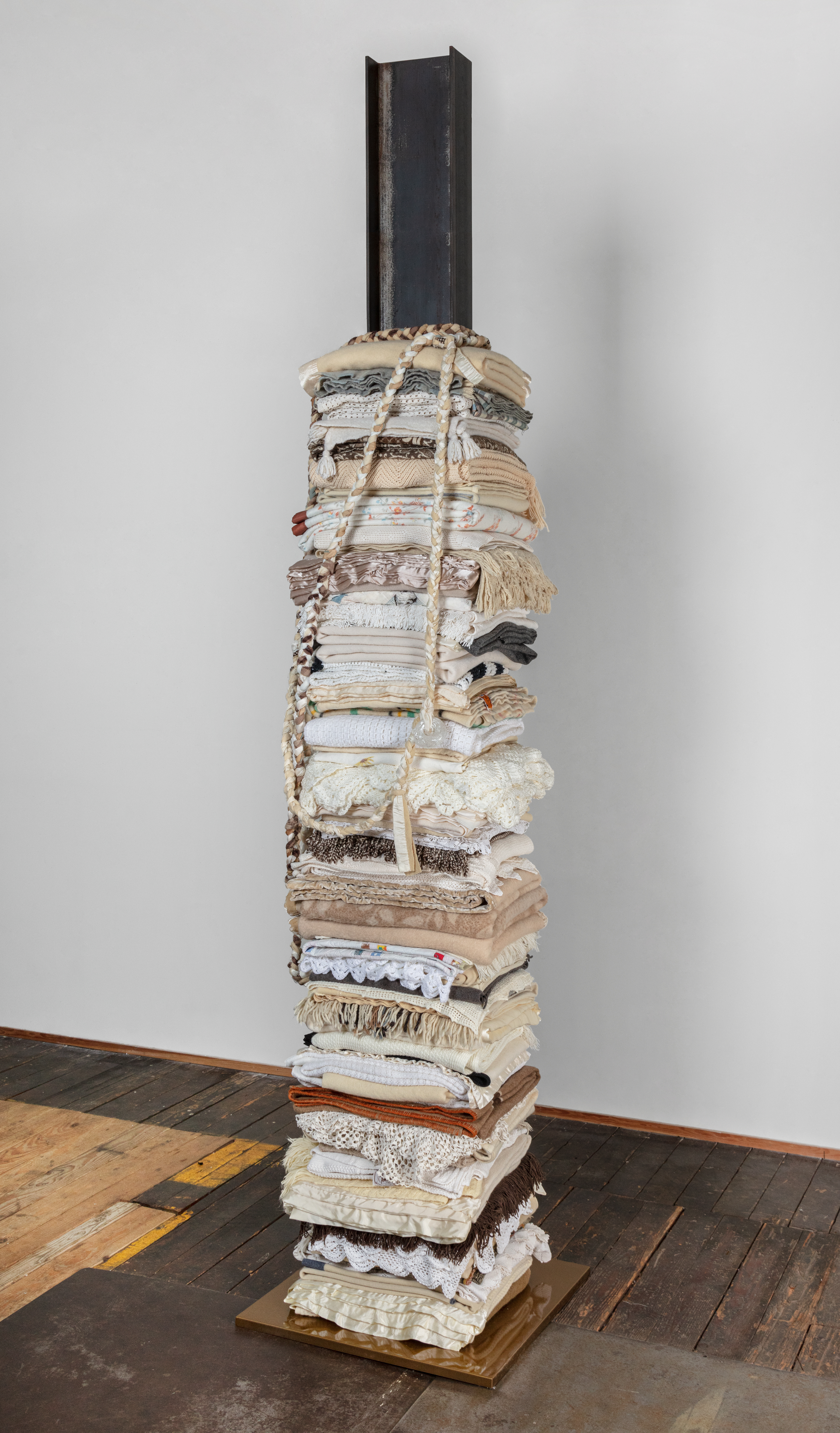 Steel I-beam, tiger gold base cap, reclaimed blankets, blown glass beads