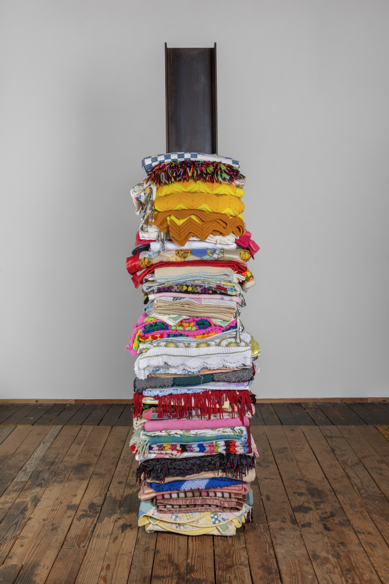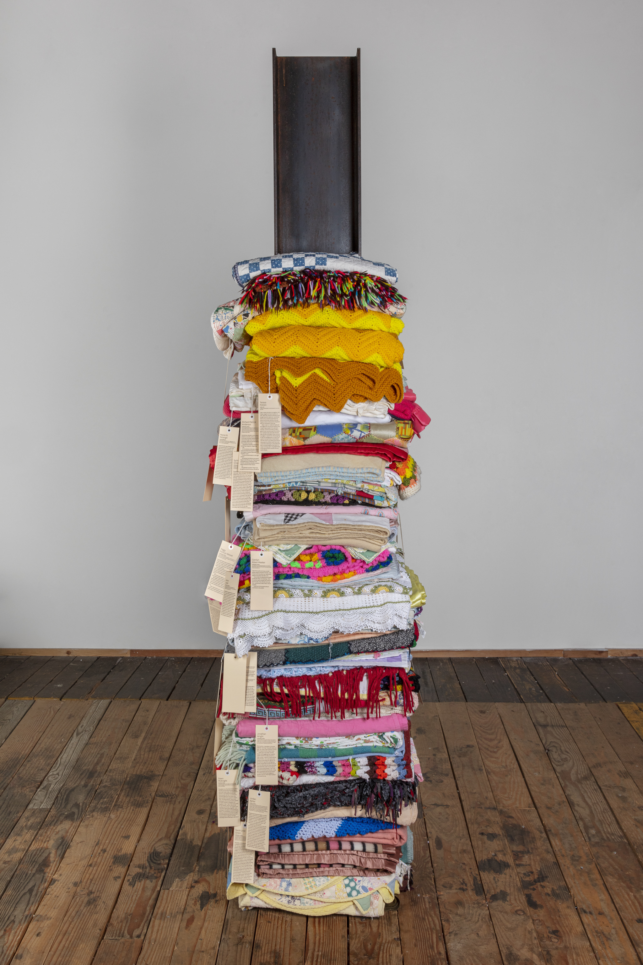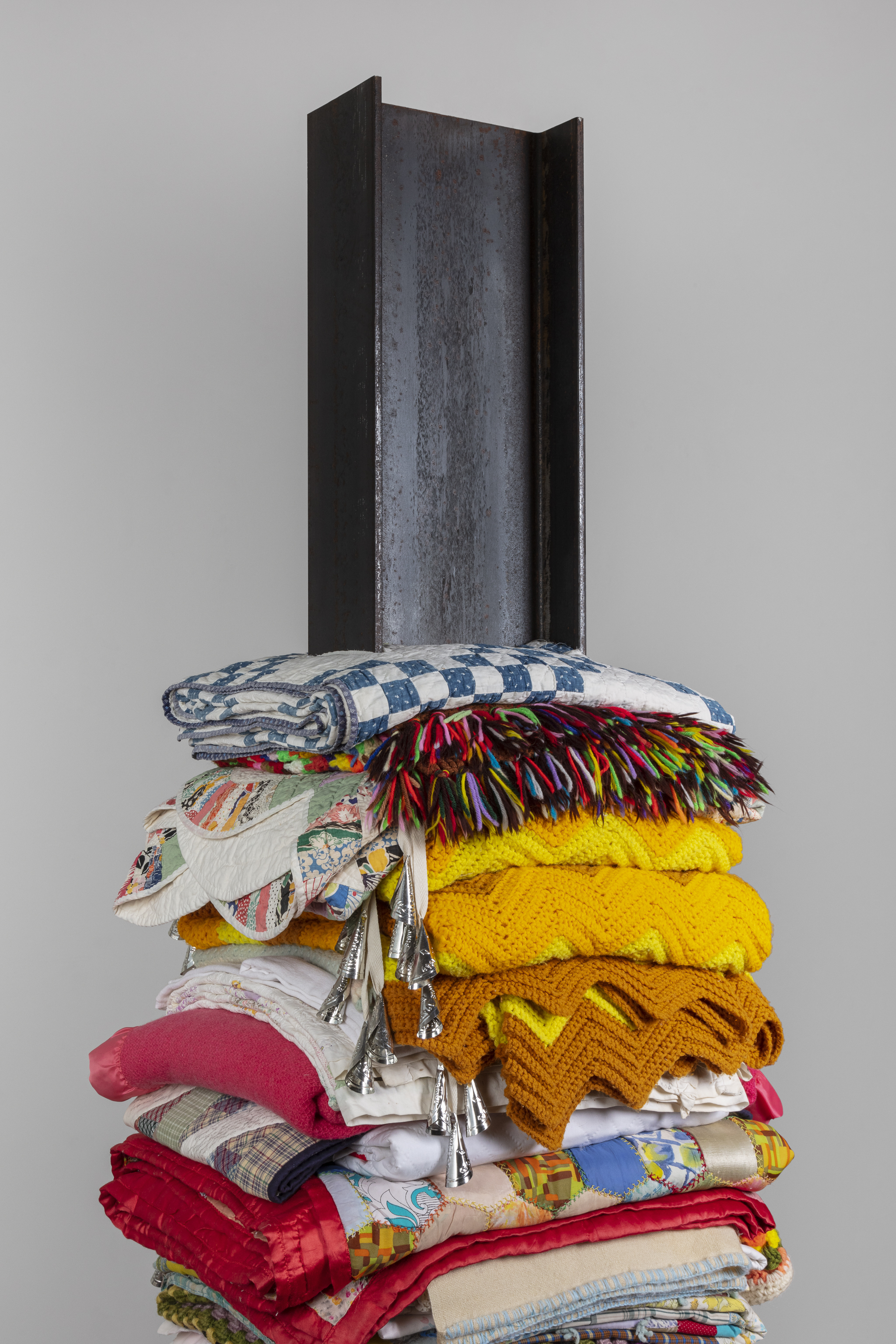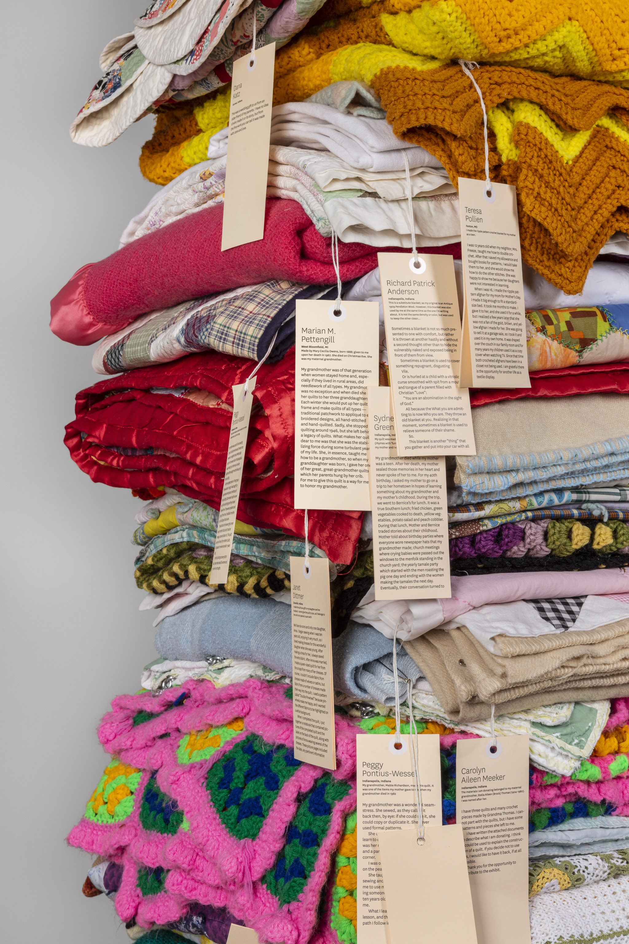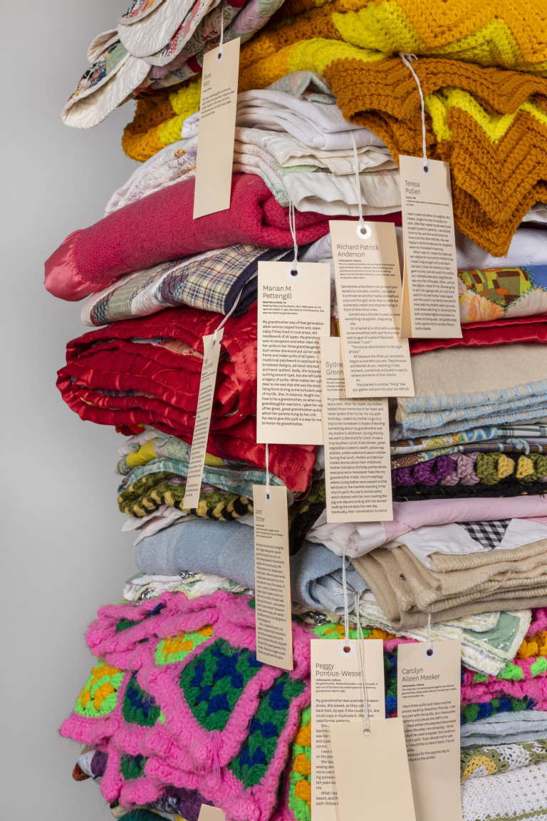 The piece is comprised of blankets sourced from the Indianapolis community, each with a story/reflection attached to it by its donor.