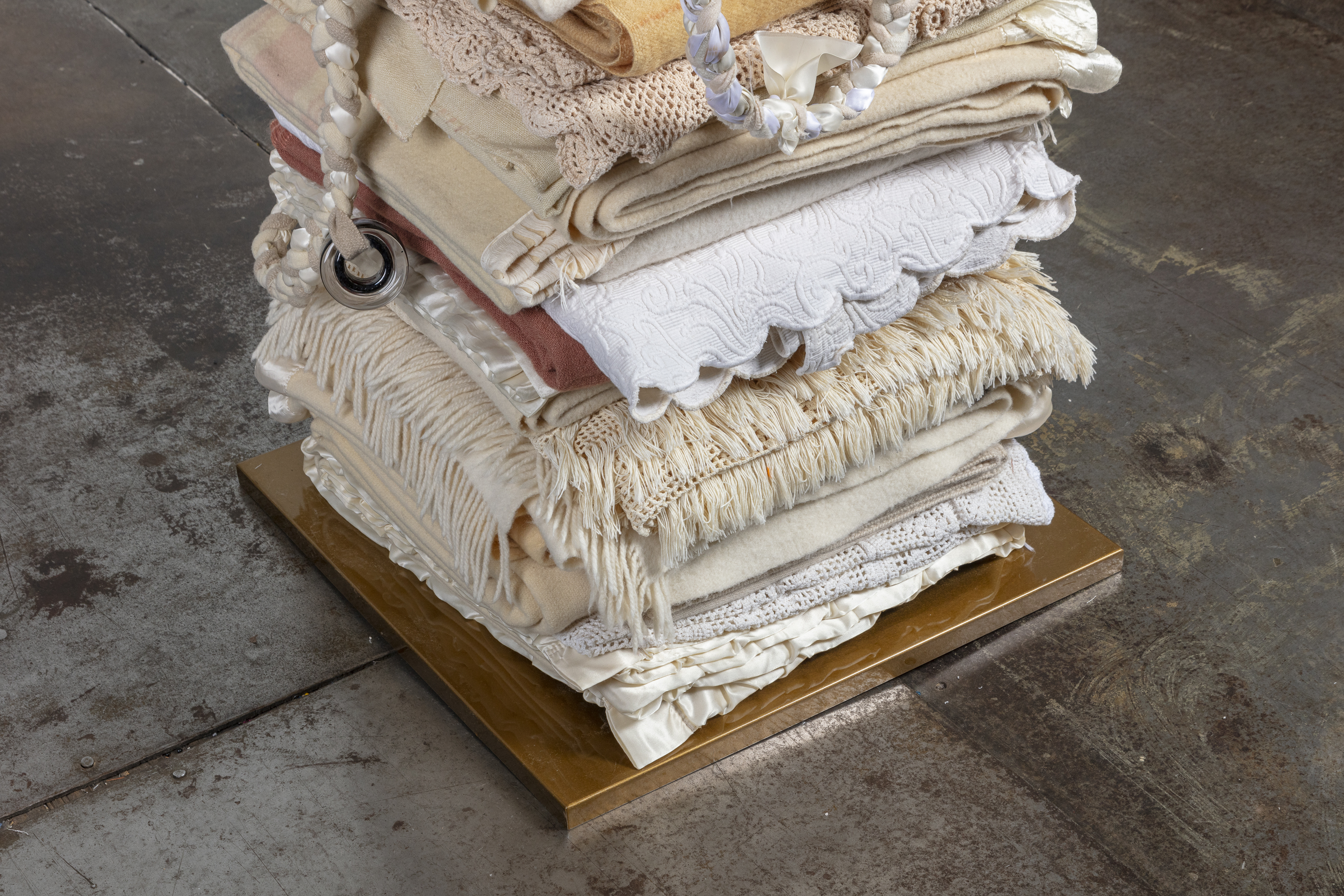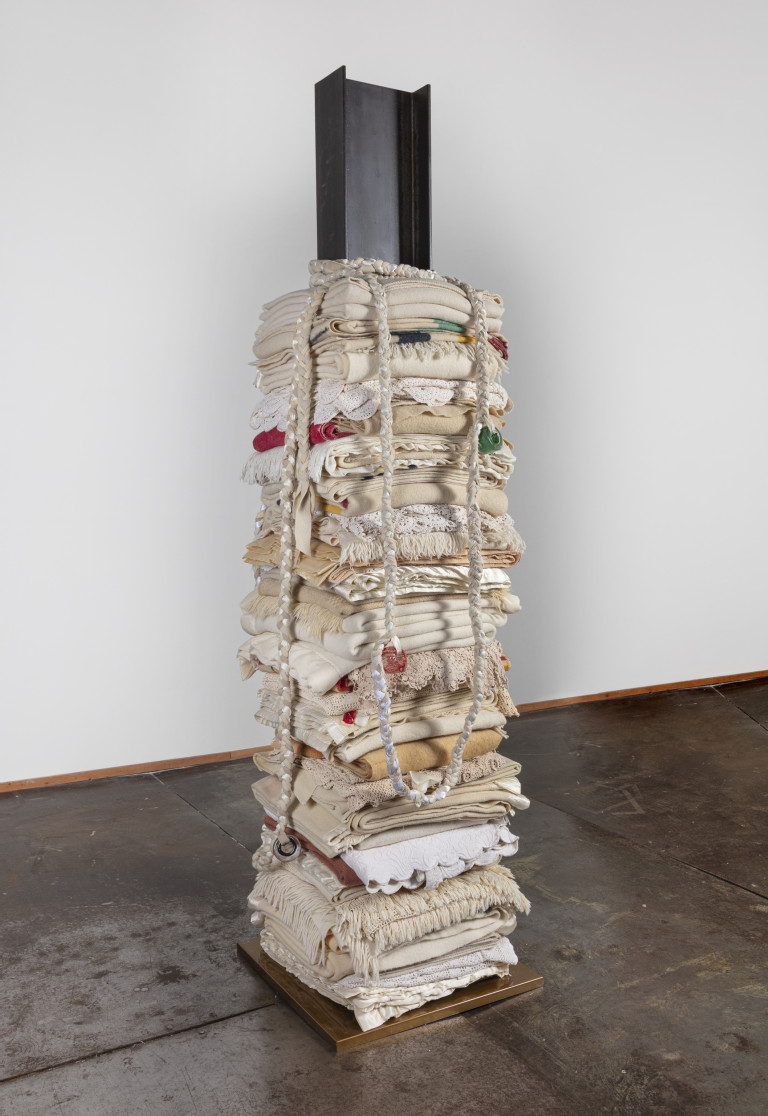 Steel I-beam, cold-rolled steel cap, reclaimed blankets, blown glass beads