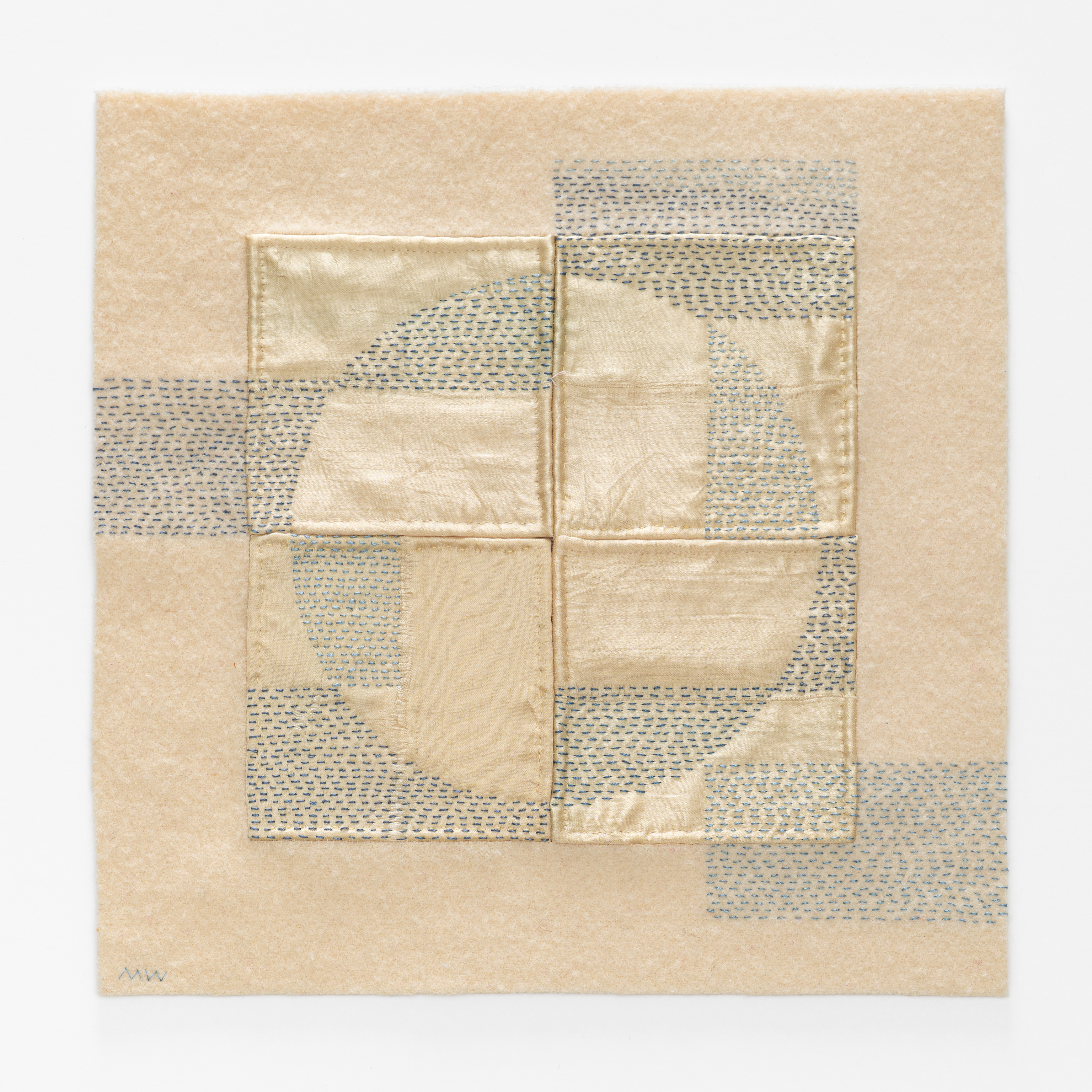Reclaimed wool, satin bindings, thread, embroidery floss