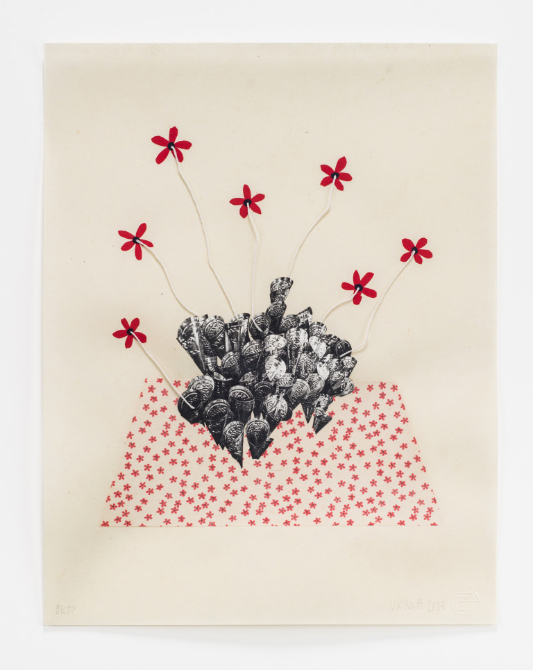 Copper plate photogravure printed on gampi, with silver leaf, calico fabric, collage, and cotton string elements. Edition of 15.