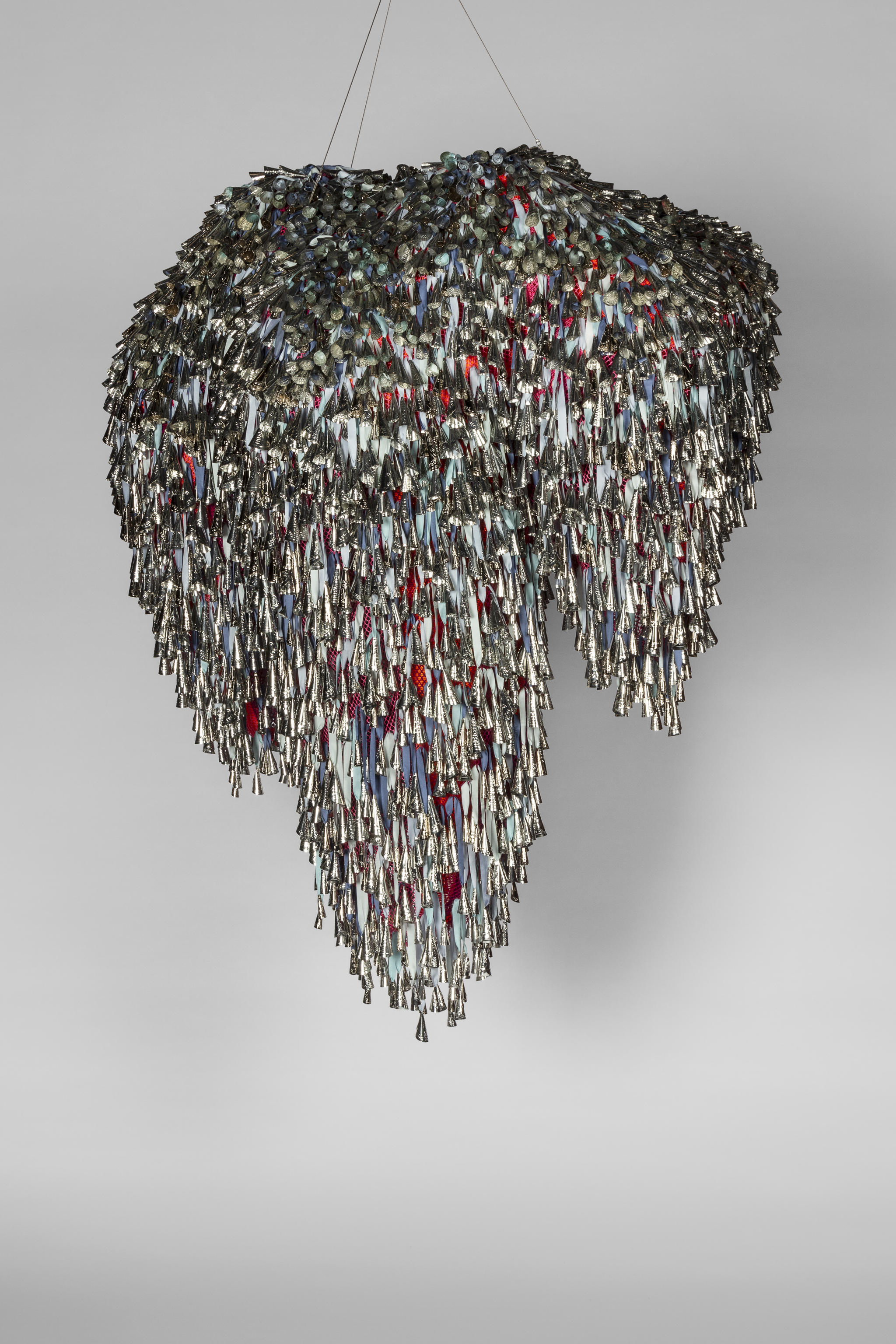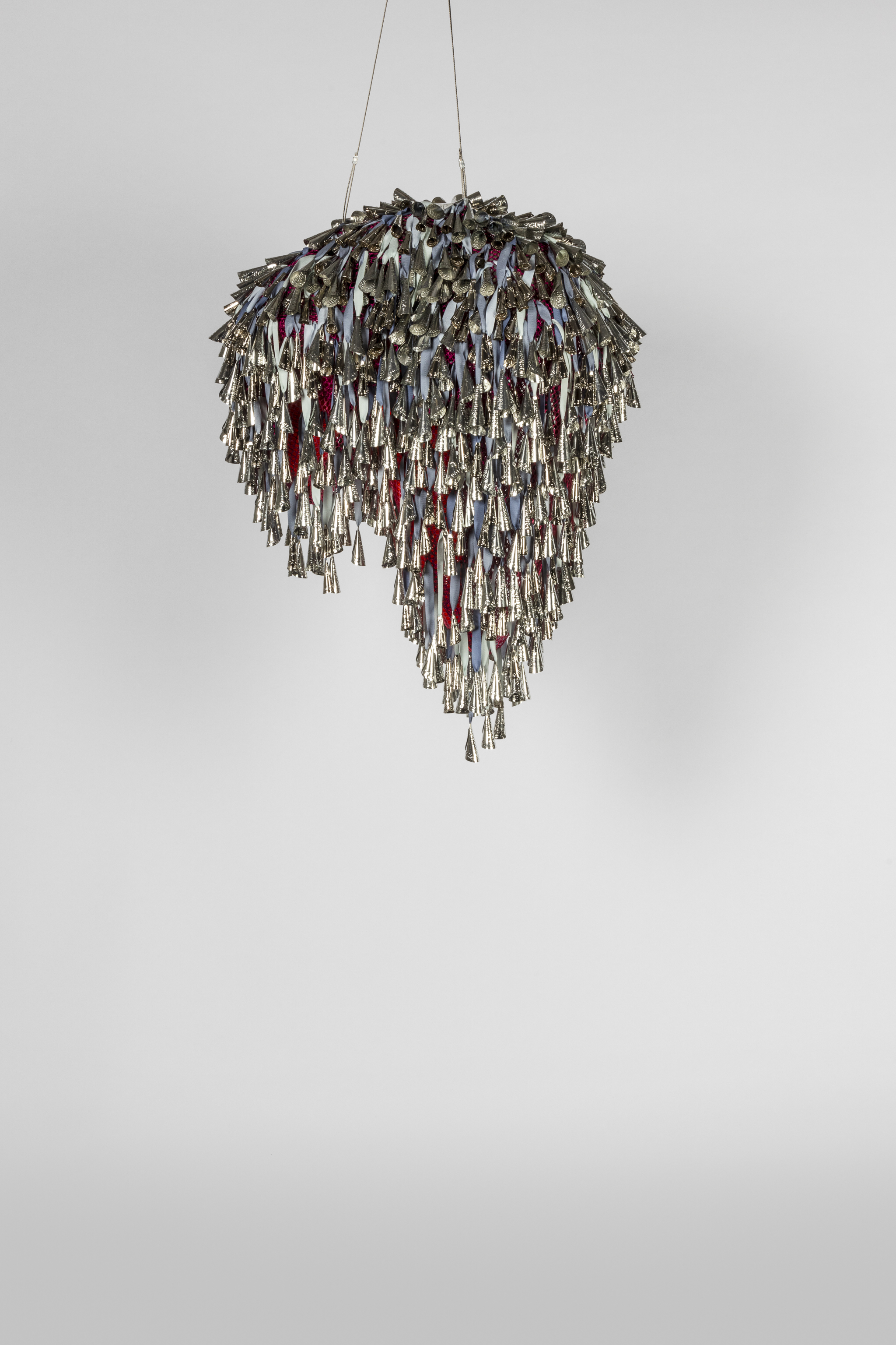 The tin jingles in this piece acknowledge the Jingle Dress Dance which began as a healing ritual in the Ojibwe tribe in the 1900s, during the influenza pandemic. The idea for the dance came to a tribal elder in a dream. When it was performed, according to the vision, the young girl who was sick in time became well. The Jingle Dress Dance was also a radical act. In 1883, the United States banned Indigenous ceremonial gatherings. Though the ban was repealed in 1978 with the American Indian Religious Freedom Act, during its centurylong prohibition the Jingle Dress Dance was shared with other tribal communities. Today it is a pow-wow dance and continues to be associated with healing. The relevance of this dance extends beyond pandemics.