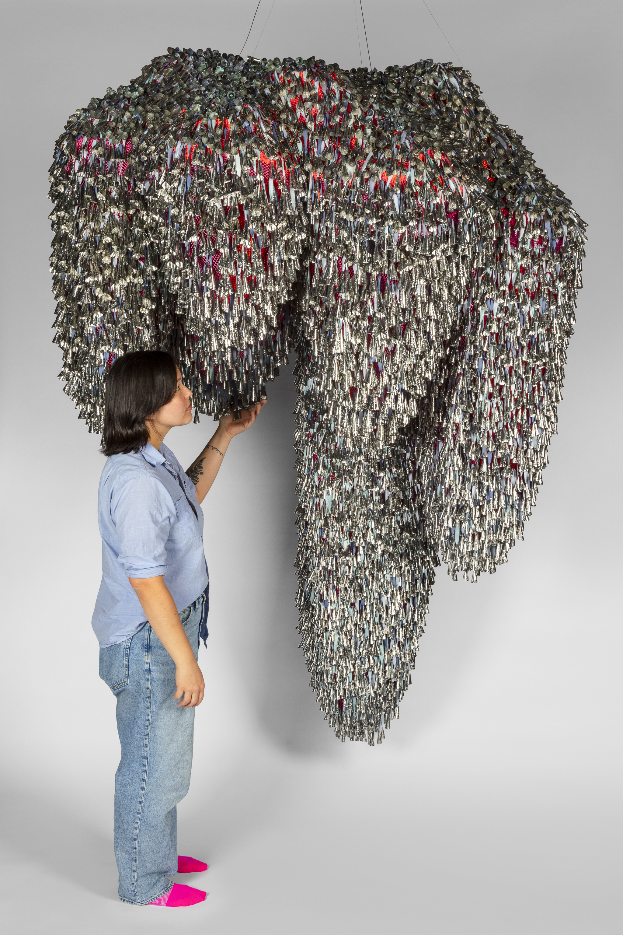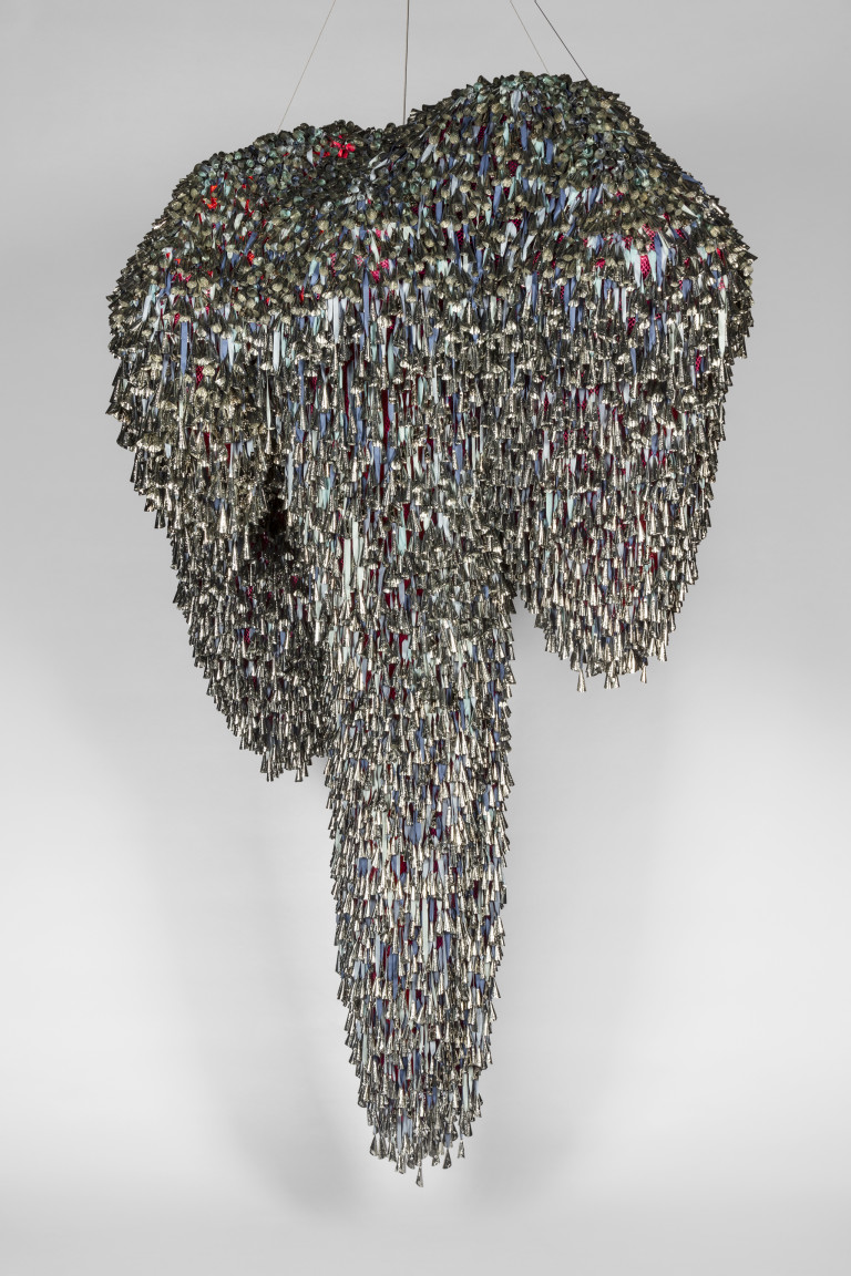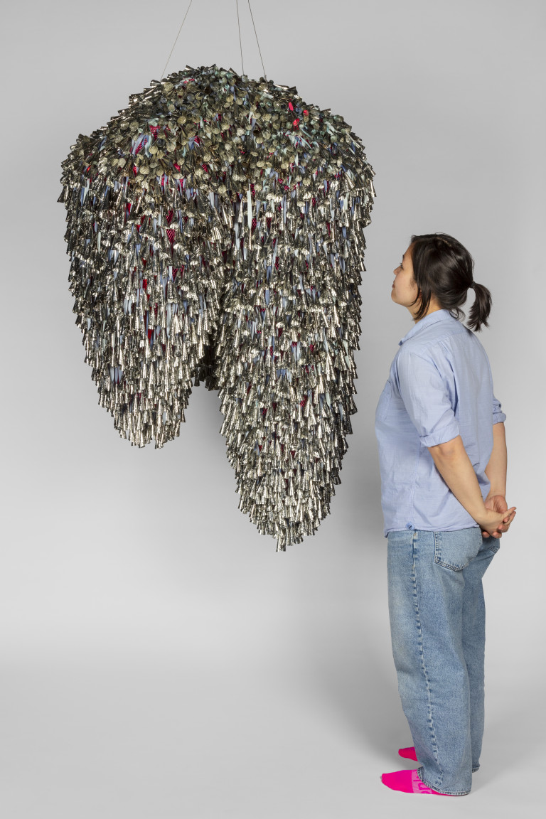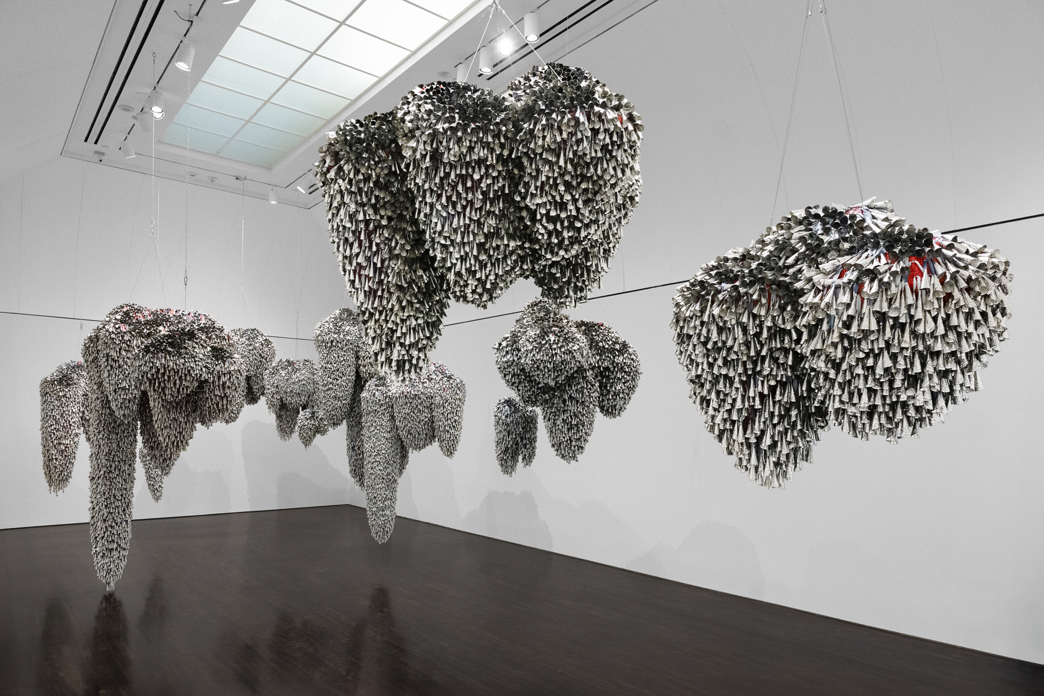 The jingle cloud-like forms recall a story, “Lifting the Sky,” that I heard as a child, told by Vi Hilbert from the Upper Skagit of the greater Coast Salish tribe. As the story goes, the sky was starting to press down on the people. Overwhelming the world with darkness, it became incumbent on the people—who spoke different languages and didn’t necessarily understand one another—to find a common vocabulary, even just one phrase, that would allow them to work together. The word they found is yəhaw̓ which means to proceed, to go forward, to do. Working together using sticks and saying that one word, yəhaw̓, with group effort they push up the sky. These clouds are lifted together, hoisted by many hands just as they were created by many hands. They are first steps in a rhythm of healing and gathering, of being and hearing together.