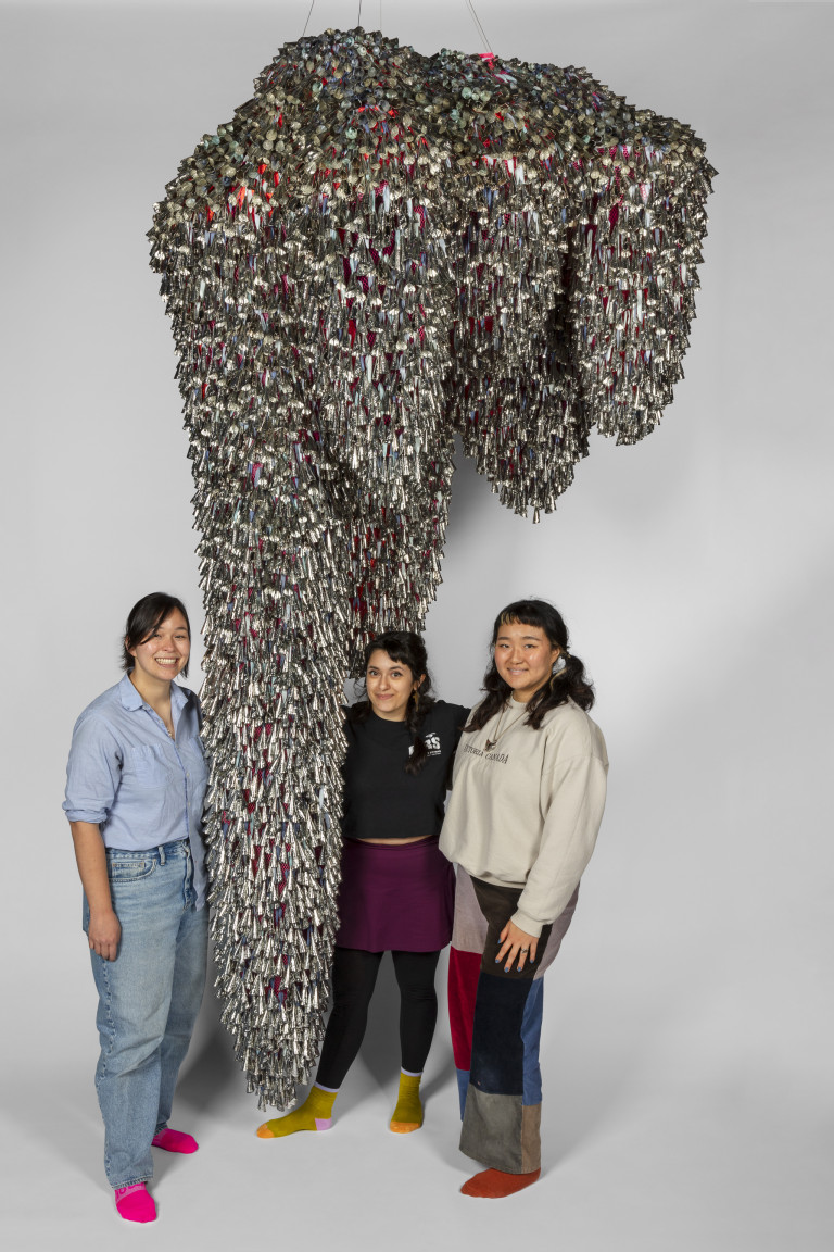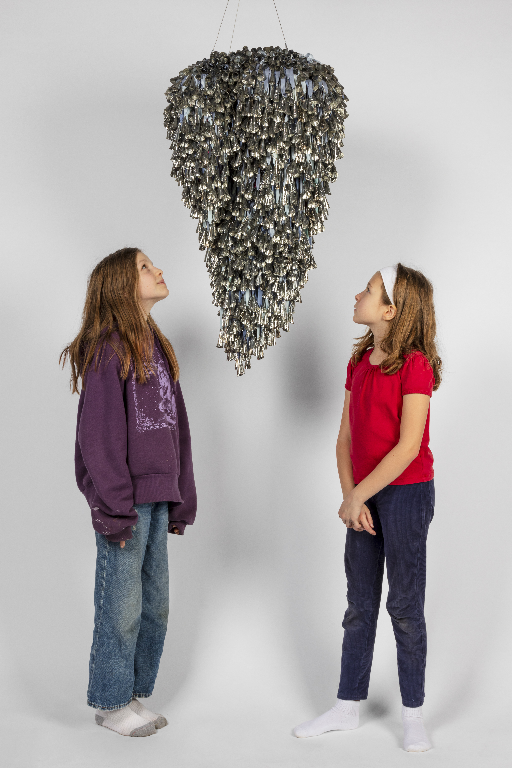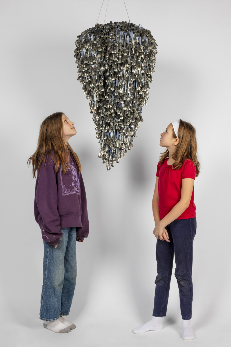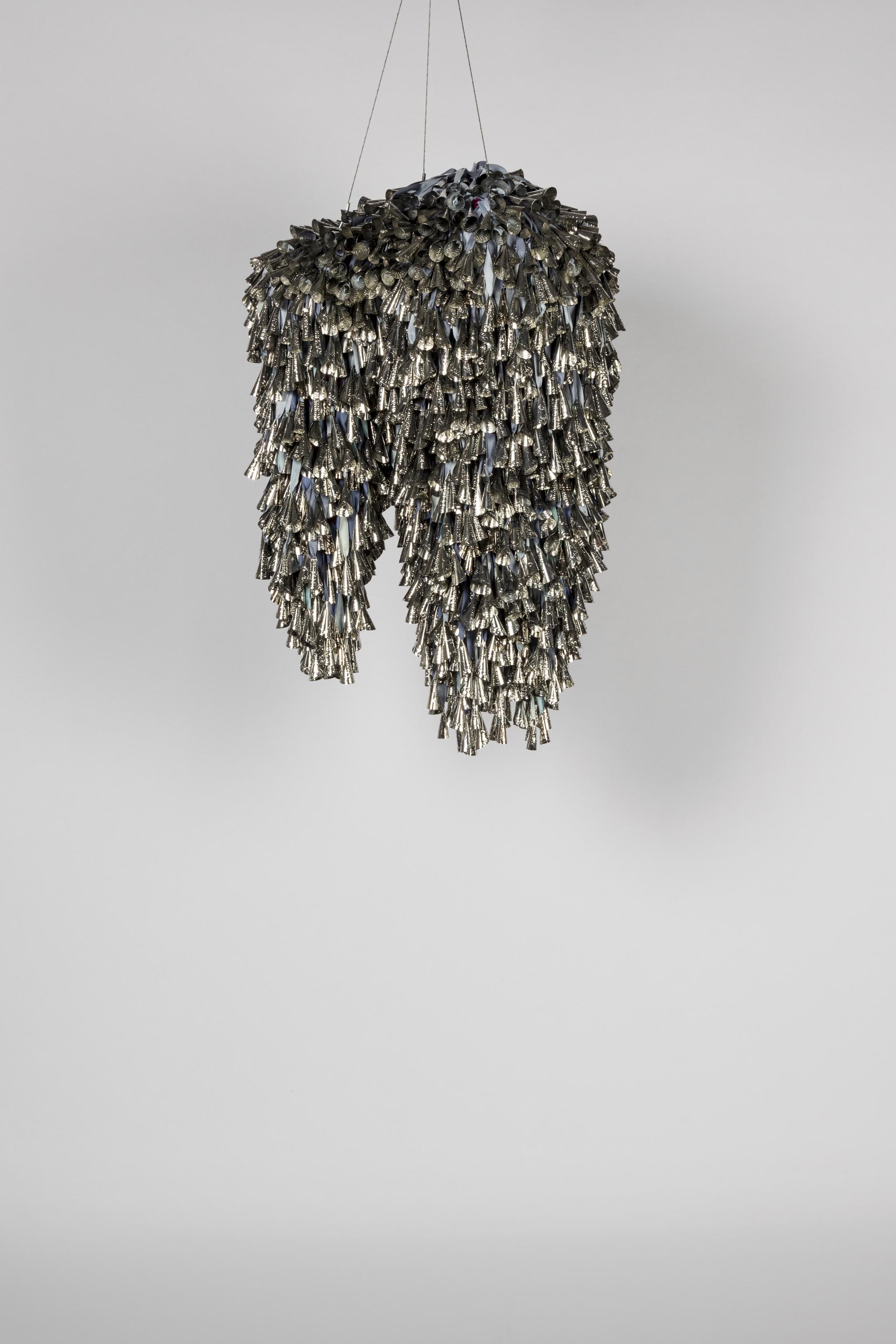 The jingle cloud-like forms recall a story, “Lifting the Sky,” that I heard as a child, told by Vi Hilbert from the Upper Skagit of the greater Coast Salish tribe. As the story goes, the sky was starting to press down on the people. Overwhelming the world with darkness, it became incumbent on the people—who spoke different languages and didn’t necessarily understand one another—to find a common vocabulary, even just one phrase, that would allow them to work together. The word they found is yəhaw̓ which means to proceed, to go forward, to do. Working together using sticks and saying that one word, yəhaw̓, with group effort they push up the sky. These clouds are lifted together, hoisted by many hands just as they were created by many hands. They are first steps in a rhythm of healing and gathering, of being and hearing together.