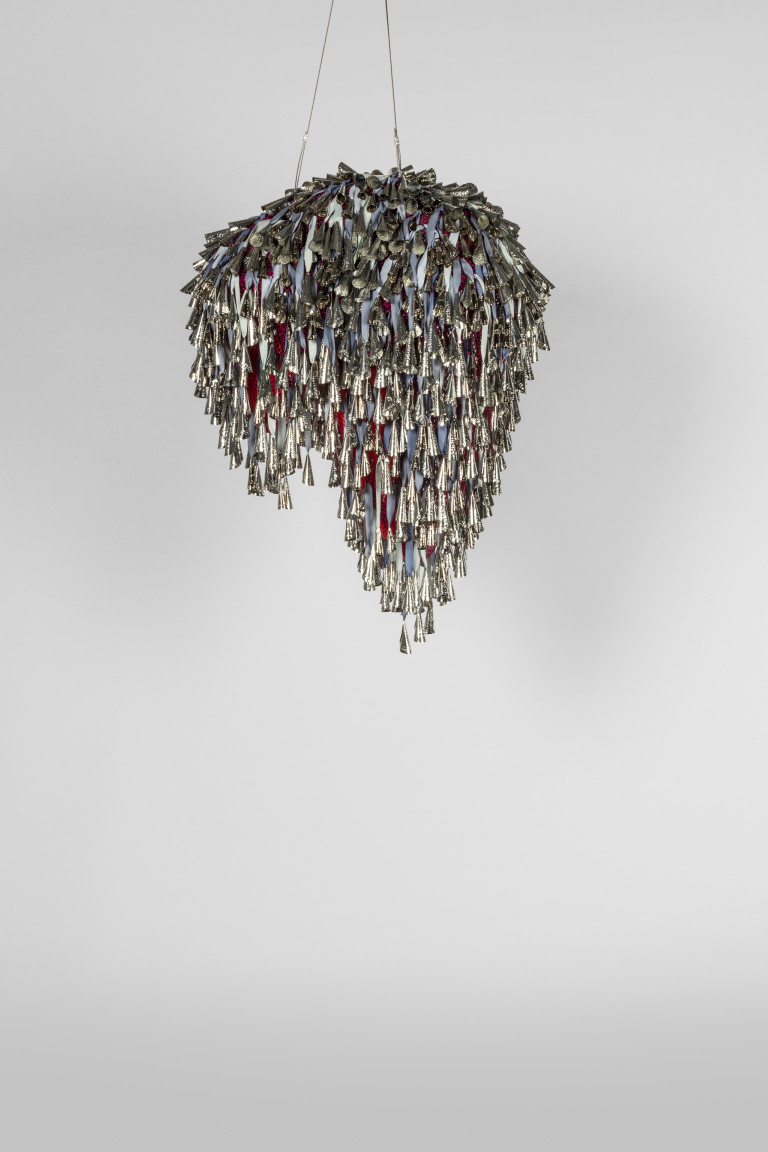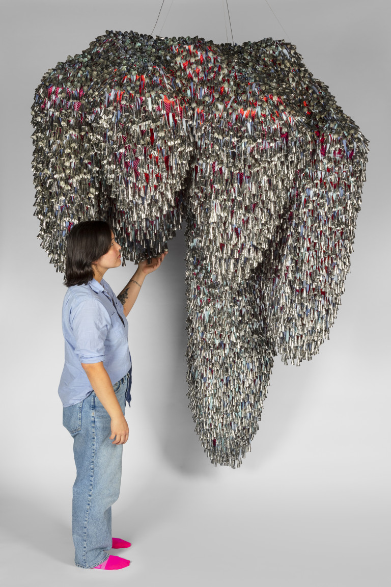 Historically, jingles were created from the rolled tops of tobacco cans and other tin lids. They are grounded in Indigenous histories of making and storytelling, adornment and ritual. Here, they hover between the sky and the earth. Simultaneously heavy and weightless, the jingles nudge and tap each other, creating murmurs of sound when animated by a breeze. They amplify each other’s stories, reverberating with each passing movement.