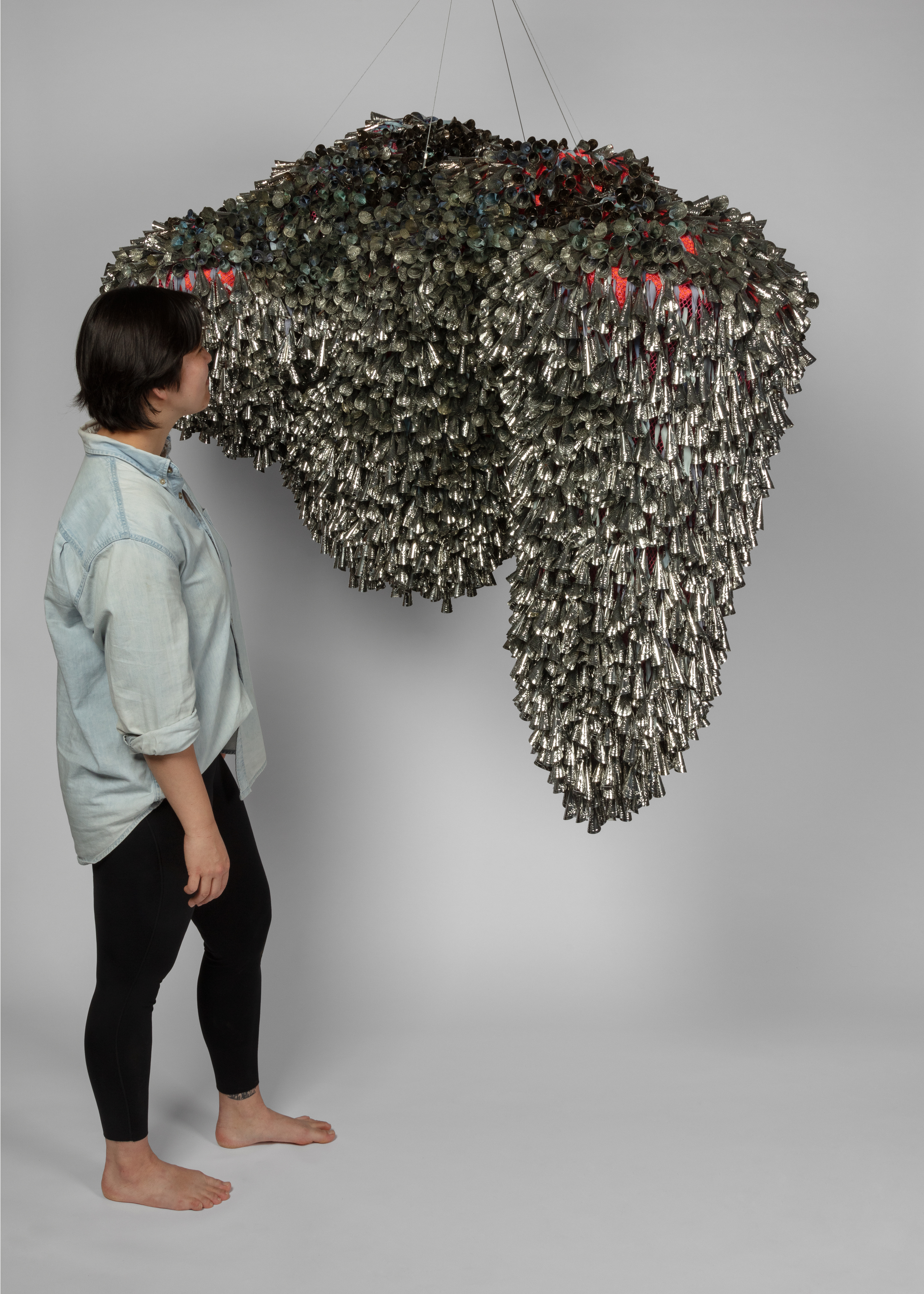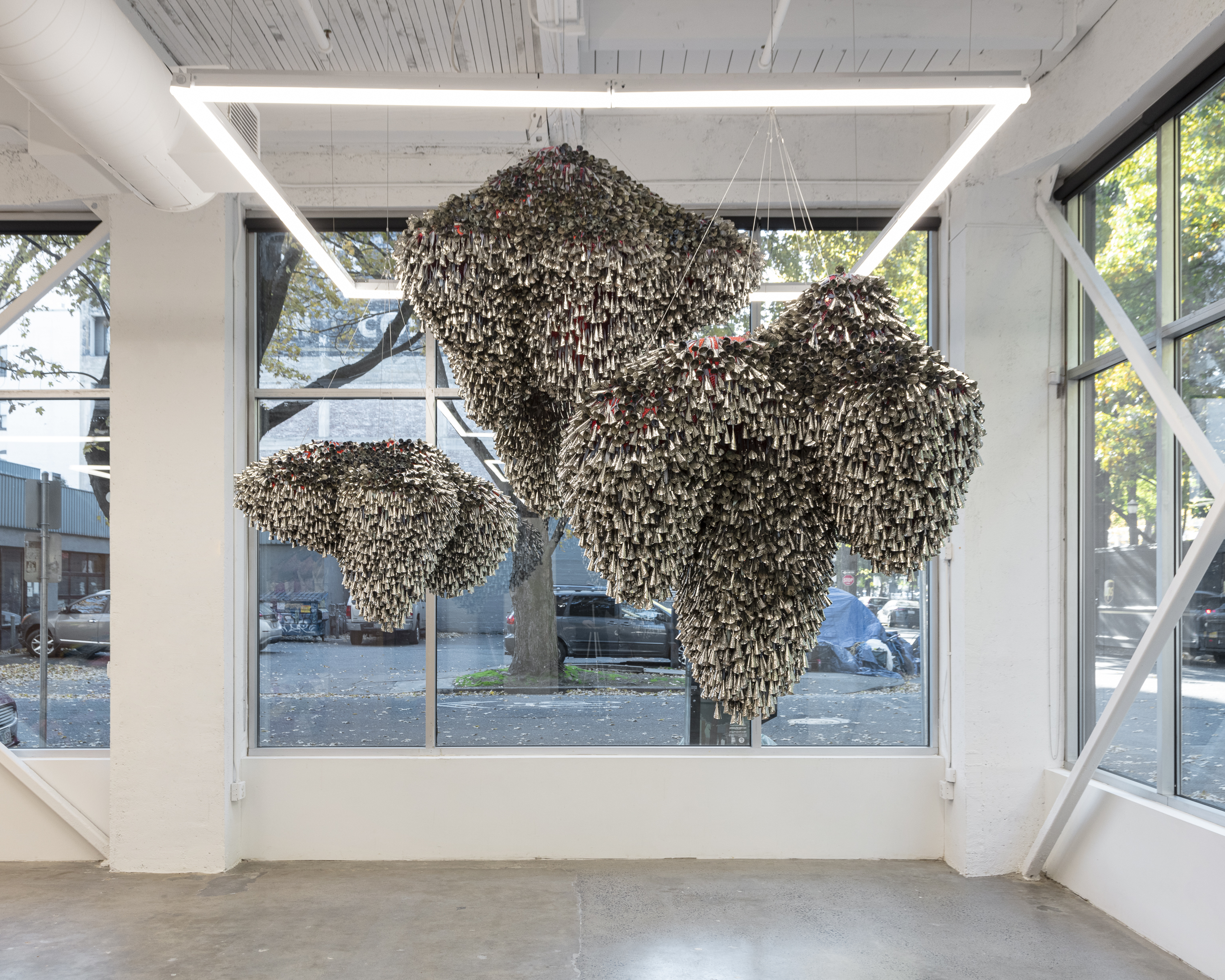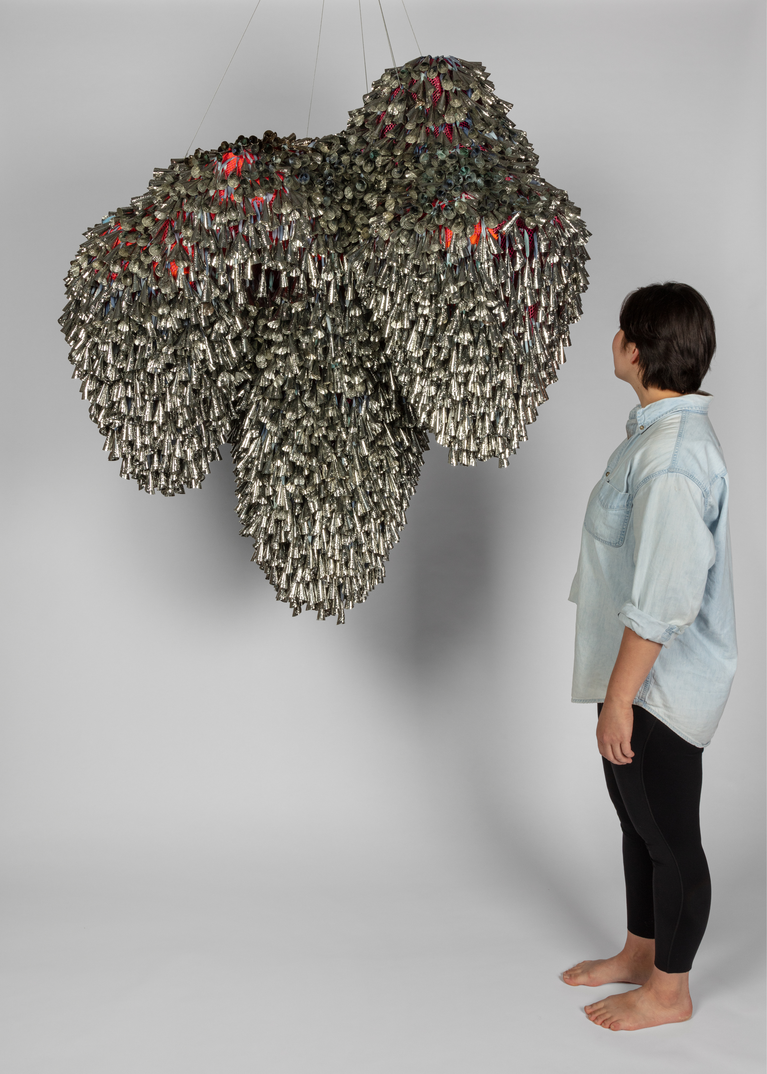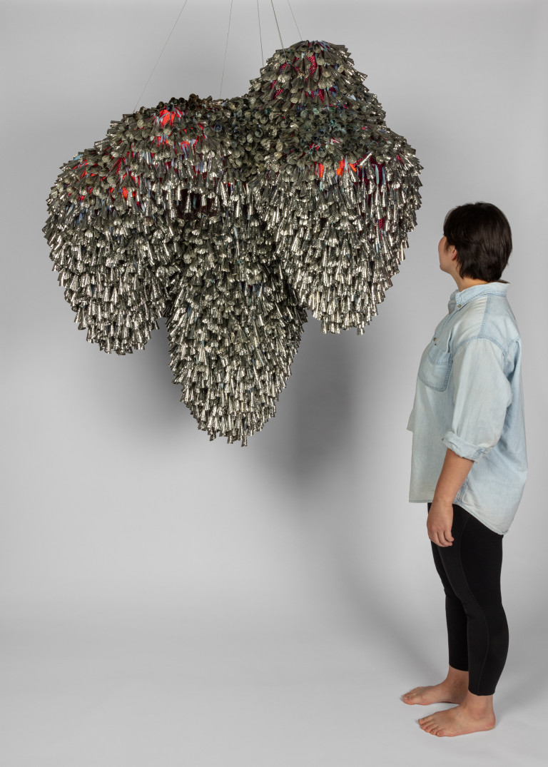 The jingle cloud-like forms recall a story, “Lifting the Sky,” that I heard as a child, told by Vi Hilbert from the Upper Skagit of the greater Coast Salish tribe. As the story goes, the sky was starting to press down on the people. Overwhelming the world with darkness, it became incumbent on the people—who spoke different languages and didn’t necessarily understand one another—to find a common vocabulary, even just one phrase, that would allow them to work together. The word they found is yəhaw̓ which means to proceed, to go forward, to do. Working together using sticks and saying that one word, yəhaw̓, with group effort they push up the sky. These clouds are lifted together, hoisted by many hands just as they were created by many hands. They are first steps in a rhythm of healing and gathering, of being and hearing together.